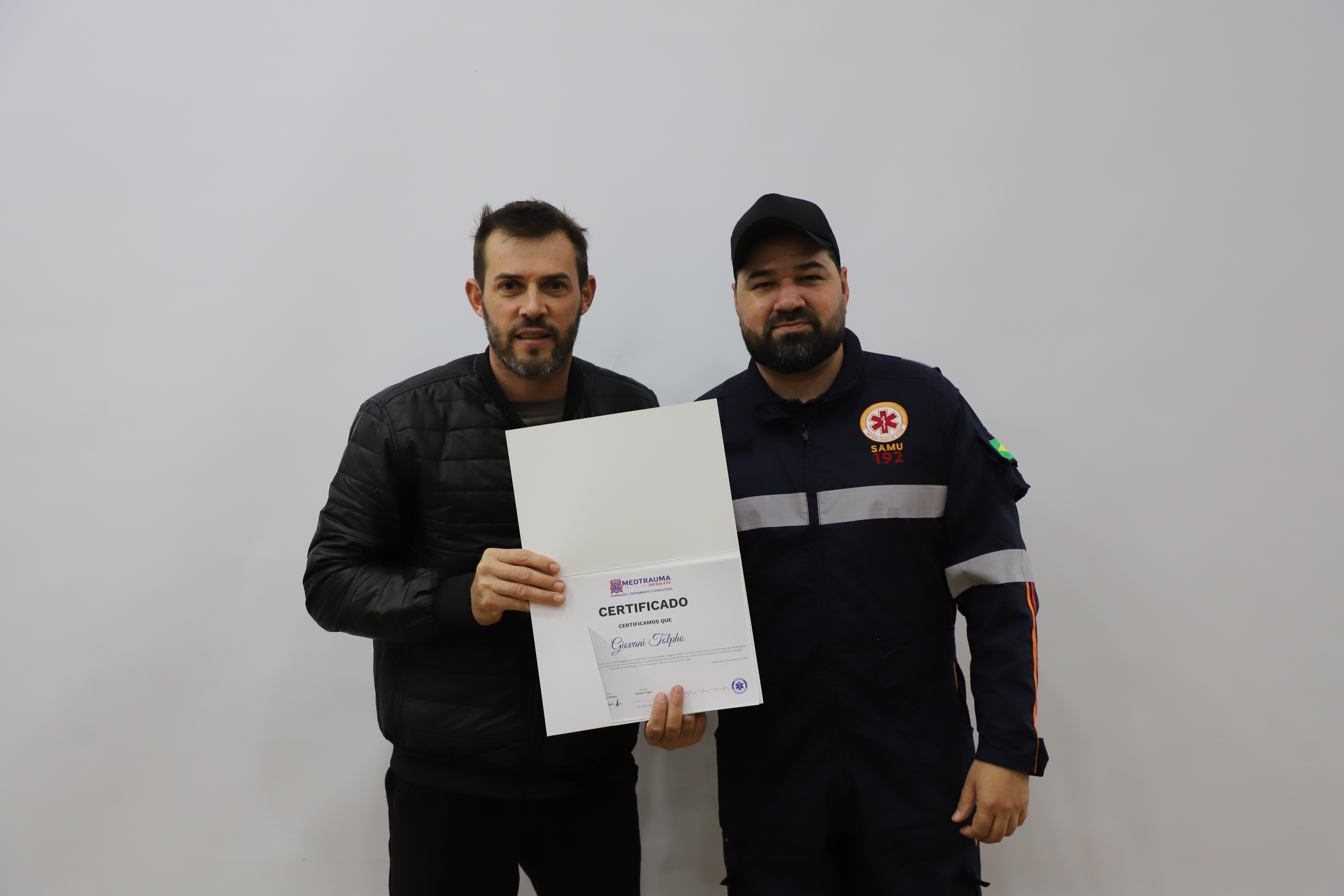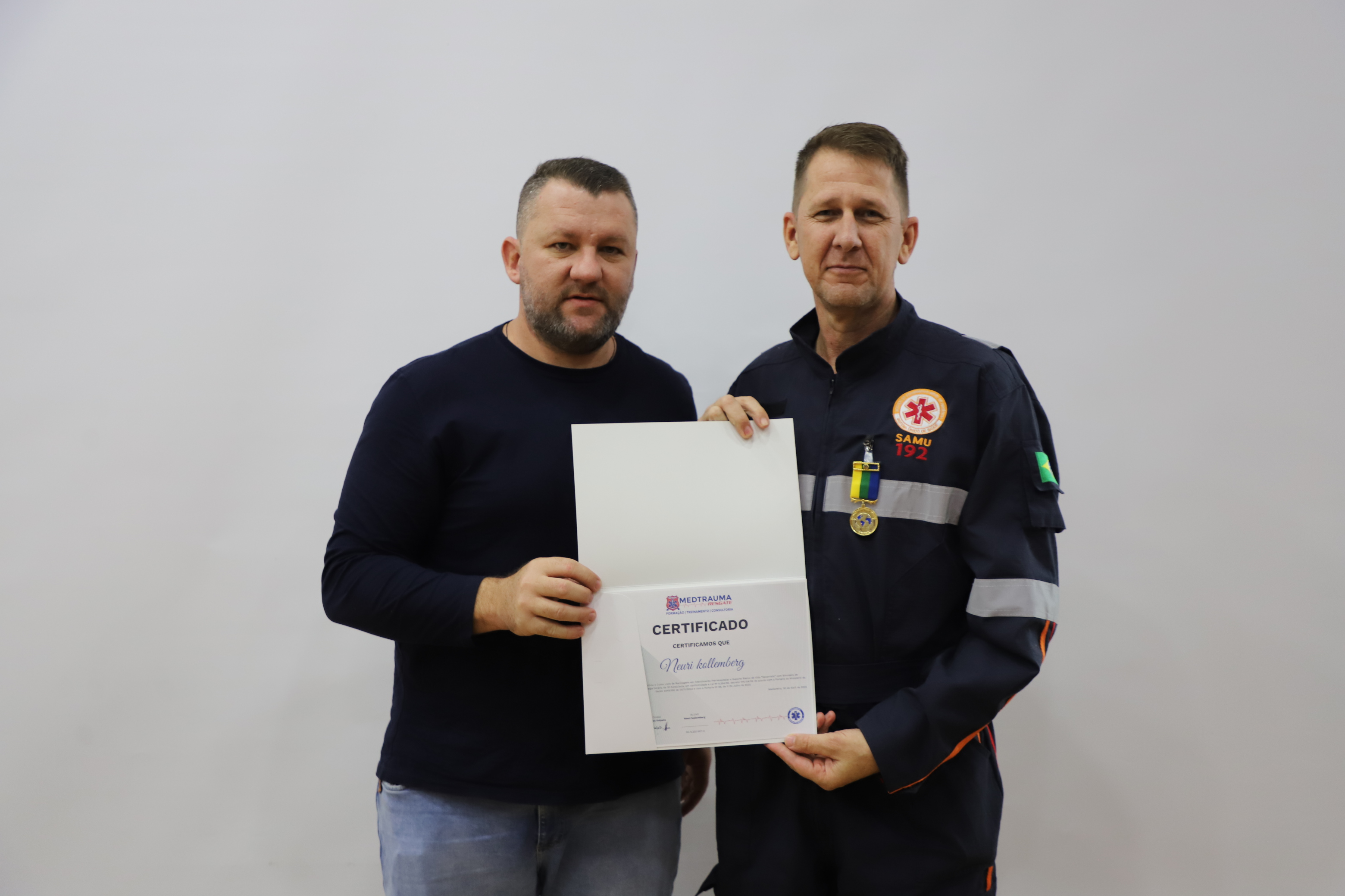 Na quinta-feira (29), membros do SAMU Bravo 31 de Itaipulândia receberam os certificados do Curso Livre de Reciclagem em Atendimento Pré-Hospitalar e Suporte Básico de Vida “Socorrista” com simulado de atendimento realizado em abril de 2025. O curso contou com carga horária de 30 horas/aula ministrado pela Medtrauma Resgate.