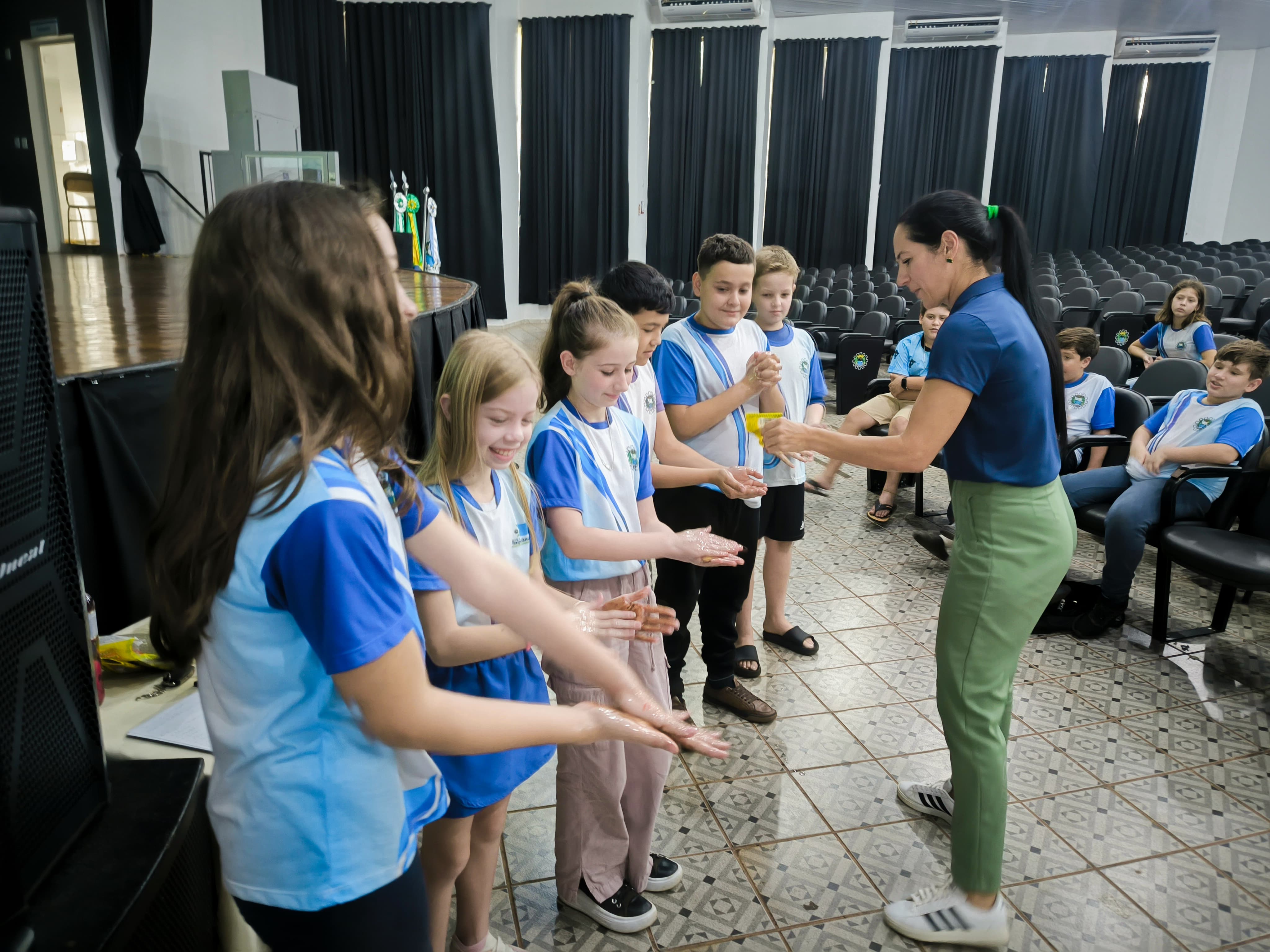 Os alunos tiveram a oportunidade de aprender sobre a importância da higiene corporal de uma forma prática e divertida, com a enfermeira Solange da Luz Pegoretto, integrante da equipe eMulti da Secretaria de Saúde do município.