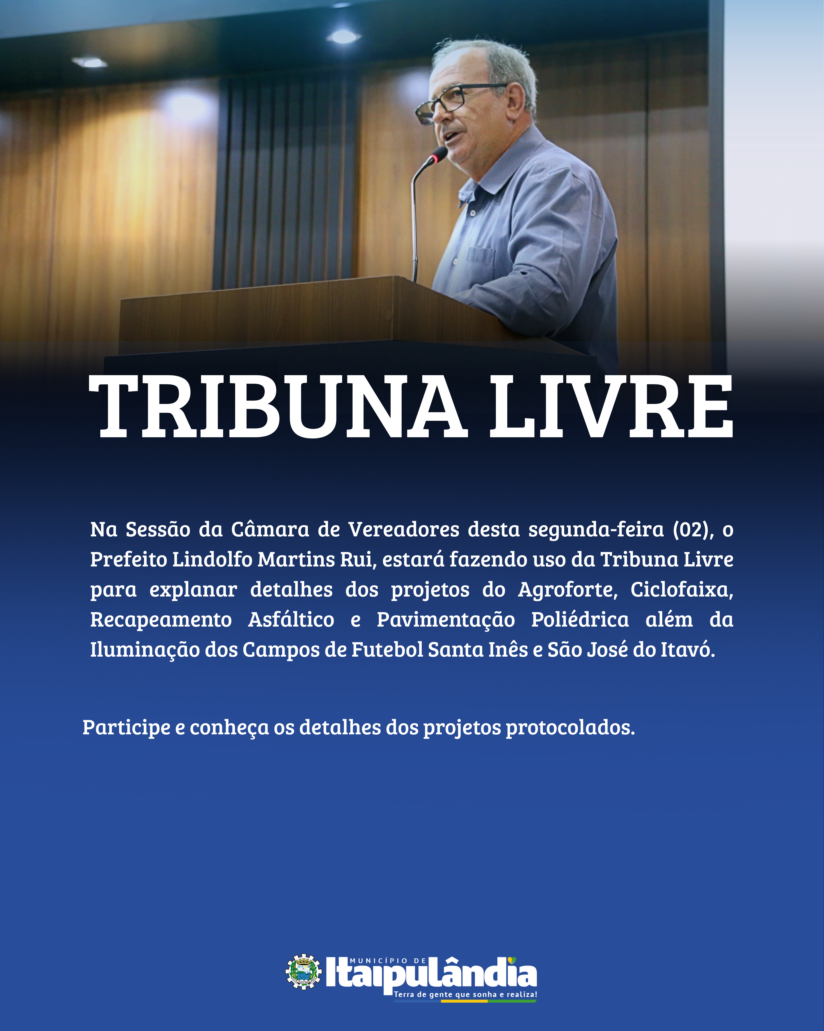 Na Sessão da Câmara de Vereadores desta segunda-feira (02), o prefeito Lindolfo Martins Rui fará uso da Tribuna Livre para apresentar e destacar importantes projetos já protocolados: