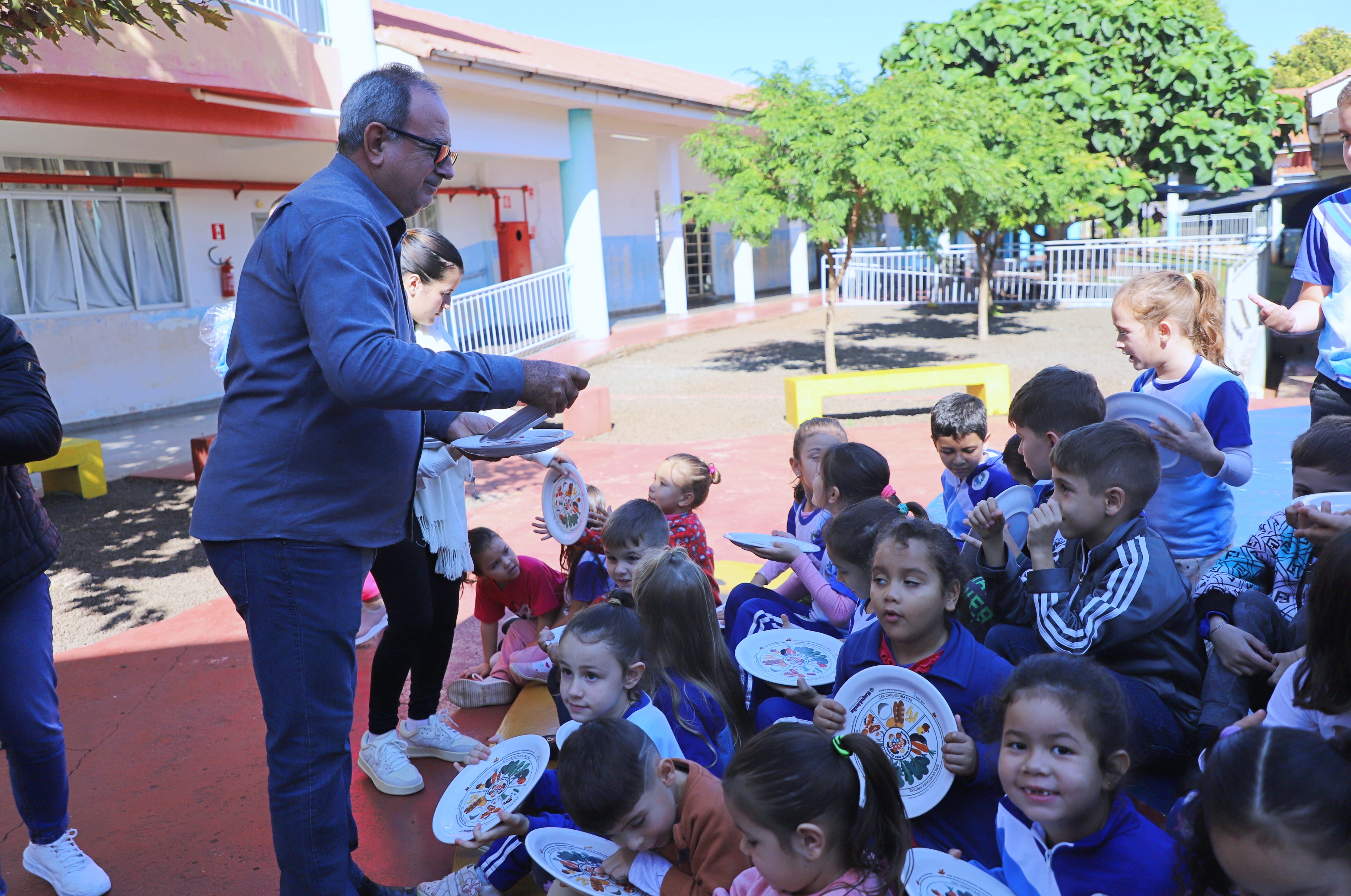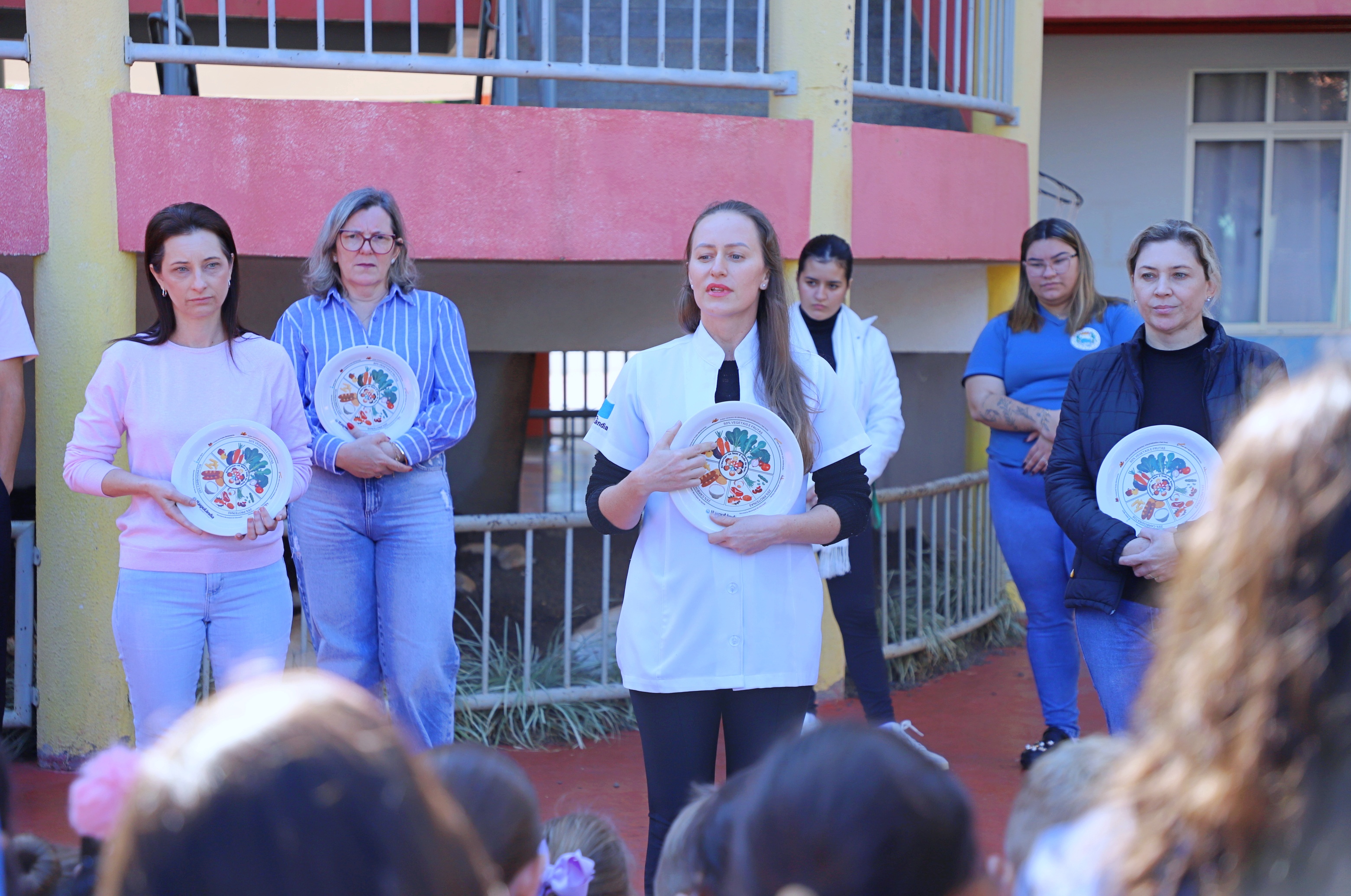 Como parte dessa iniciativa, a Secretaria de Saúde, em parceria com a Secretaria de Educação do município, realizou recentemente a compra de pratos de cerâmica com desenhos ilustrativos e divertidos, sendo entregue um parto a cada aluno da Rede Municipal de Ensino. Os pratos foram especialmente pensados para atrair a atenção das crianças e reforçar, de maneira lúdica, a importância de uma alimentação equilibrada.