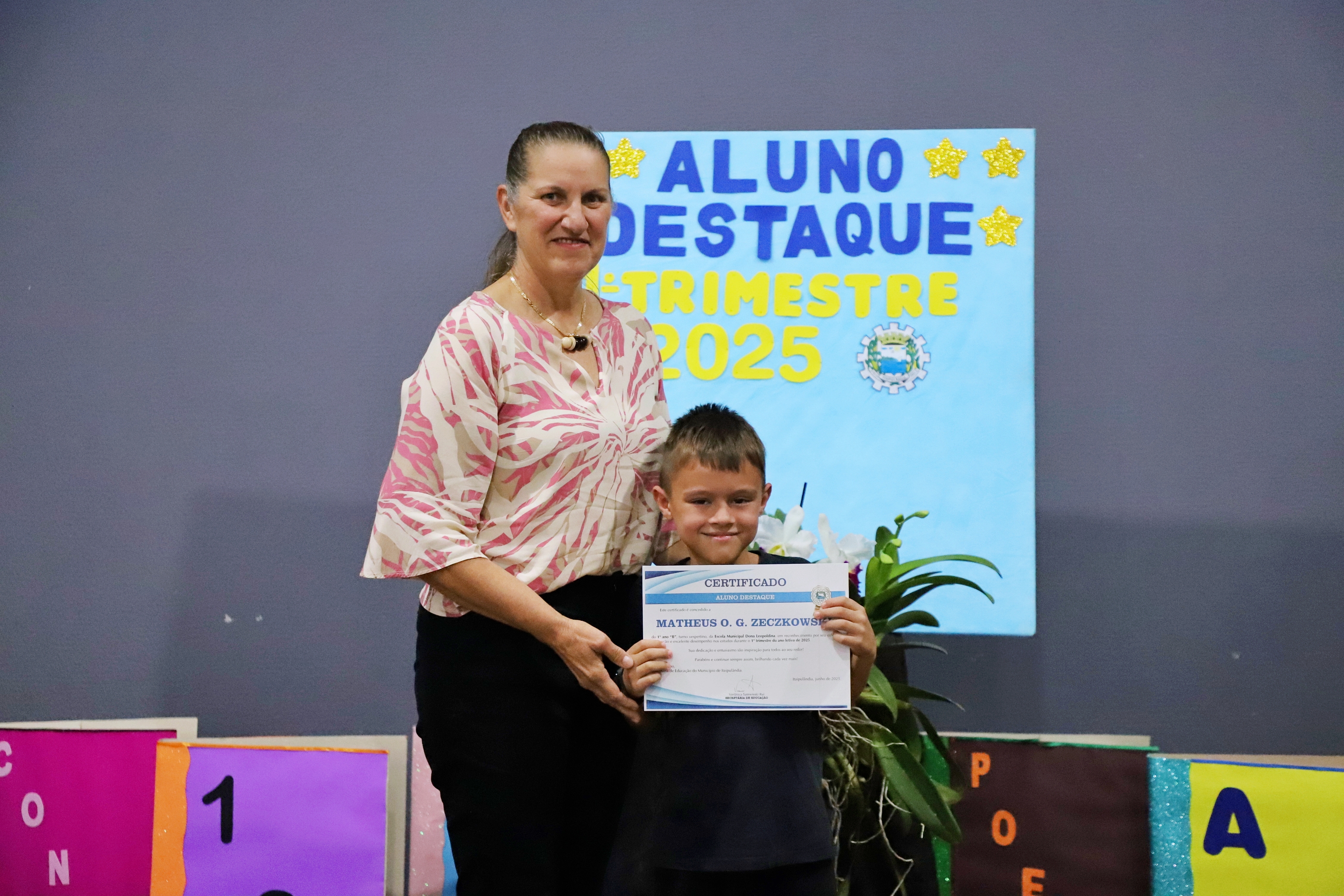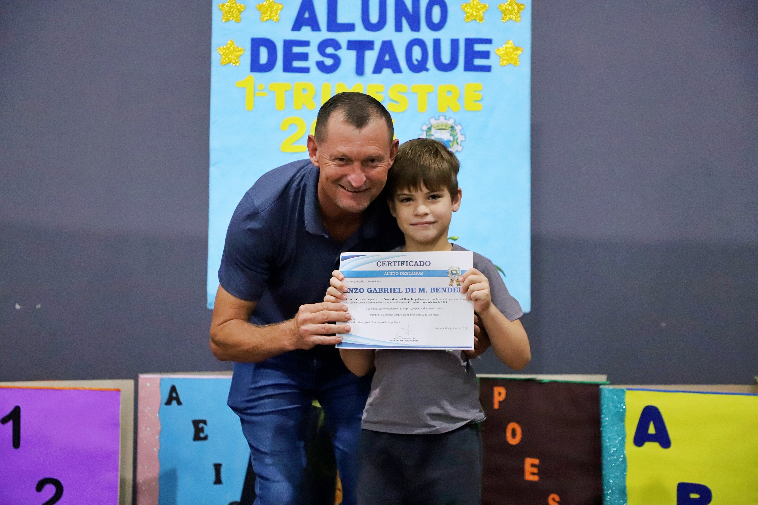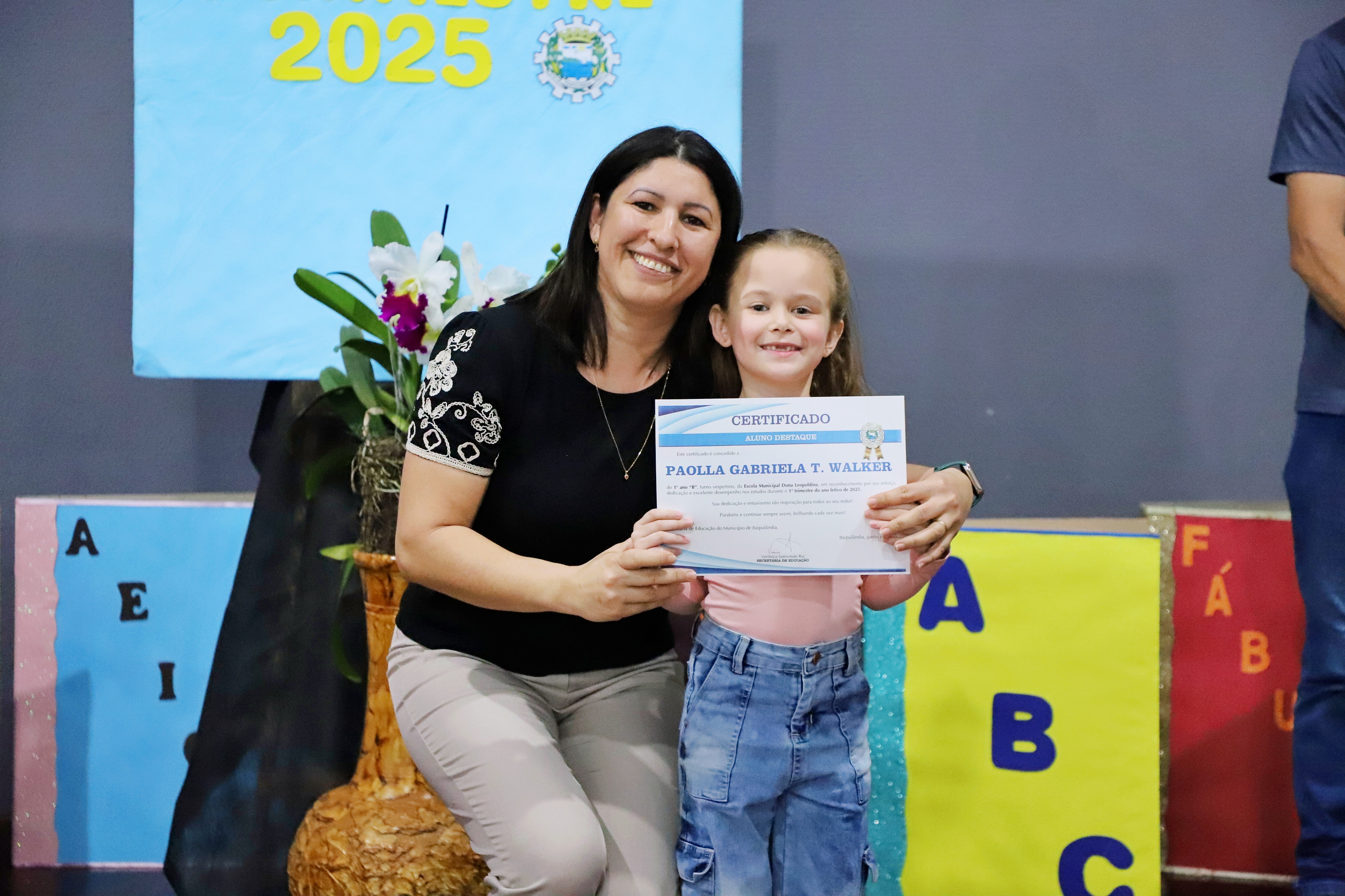 A Escola Municipal Dona Leopoldina realizou nesta semana uma cerimônia especial para homenagear 20 alunos que se destacaram no 1º trimestre letivo de 2025, com médias acima de 8,0 nas avaliações do Projeto Mais IDEB nos Municípios Lindeiros ao Lago de Itaipu, nas avaliações de Língua Portuguesa e Matemática aplicadas pela SMED e no Compromisso Nacional Criança Alfabetizada (CNCA). O evento também prestou reconhecimento aos professores da turma com melhor desempenho da escola, reforçando a valorização do trabalho pedagógico coletivo.
