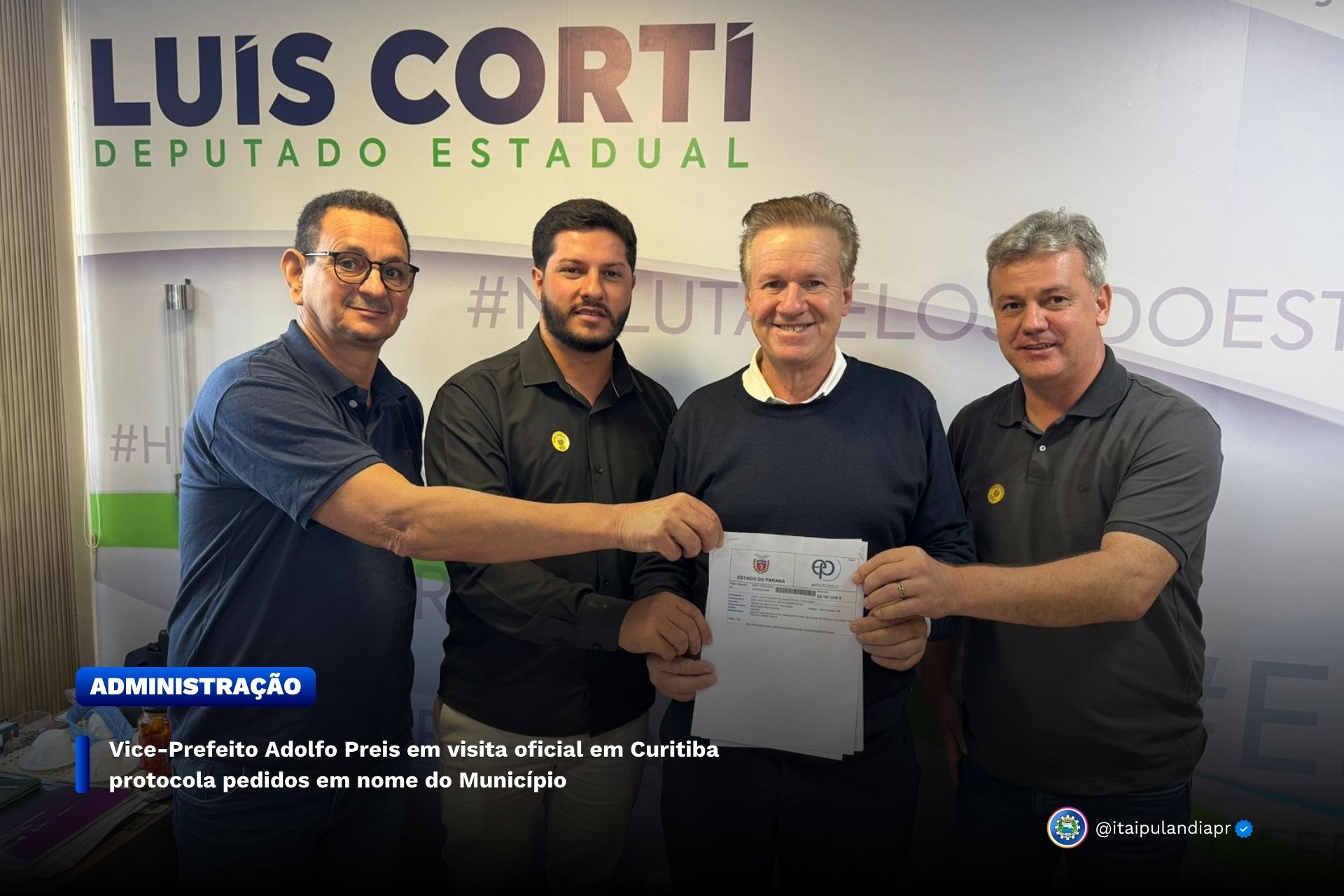 Na última semana, o Vice-Prefeito Adolfo Preis, acompanhado do Secretário de Habitação José do Aparecido Felicíssimo Ribeiro e do vereador Nilsinho Barcellos, esteve em visita oficial à capital do estado e protocolou demandas do município de Itaipulândia.