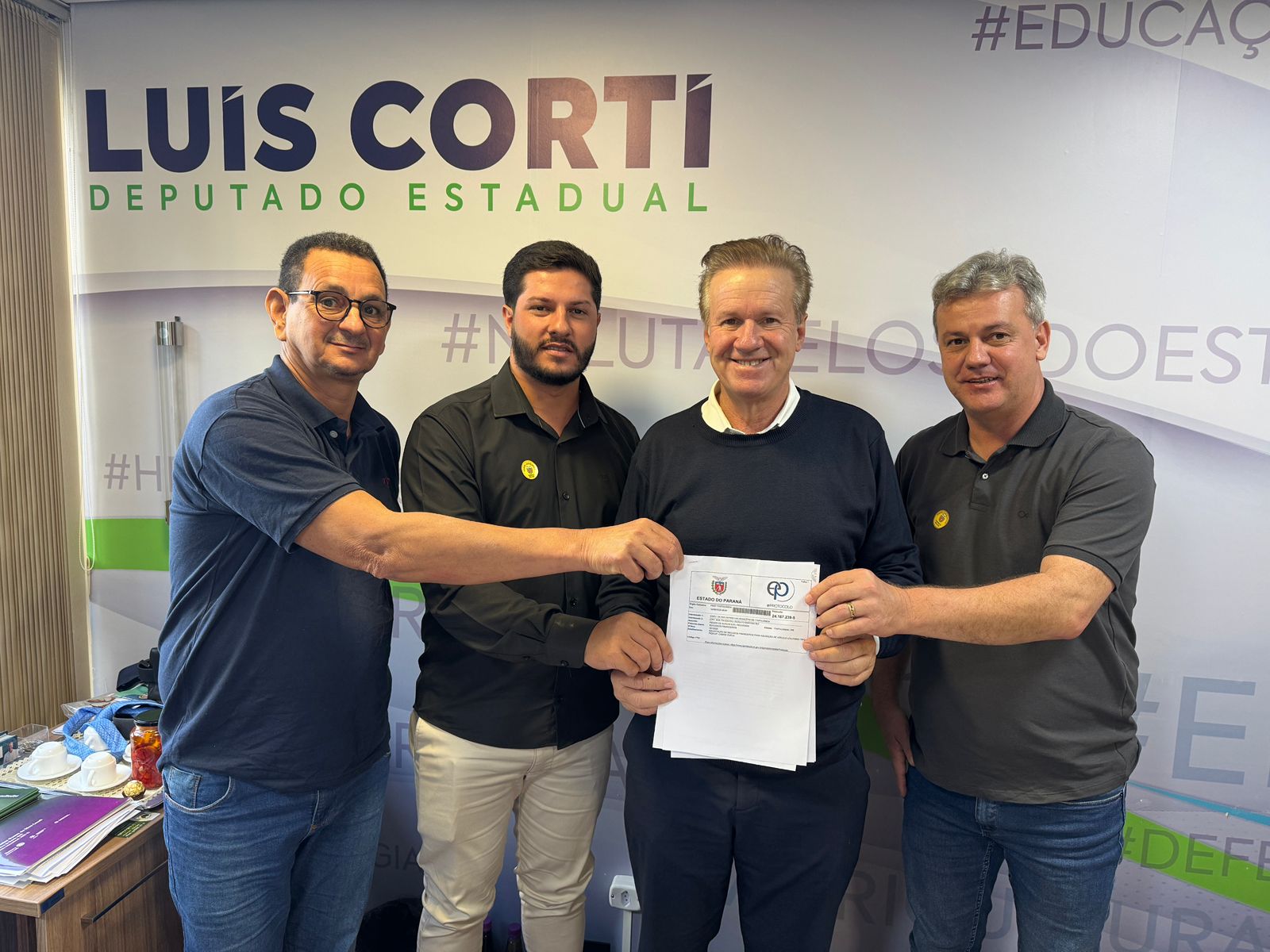 Na oportunidade esteve com o deputado estadual Luis Corti, onde gestionou pedido de um veículo Pick-Up, cabine dupla, para atendimento das demandas operacionais das diversas secretarias municipais. Além disso foi incluído a solicitação da intermediação junto à Secretaria de Estado das Cidades para liberação de recursos para a aquisição de um Trator de Esteira para atendimento em serviços de terraplenagem, conservação de vias, otimizando assim os atendimentos.