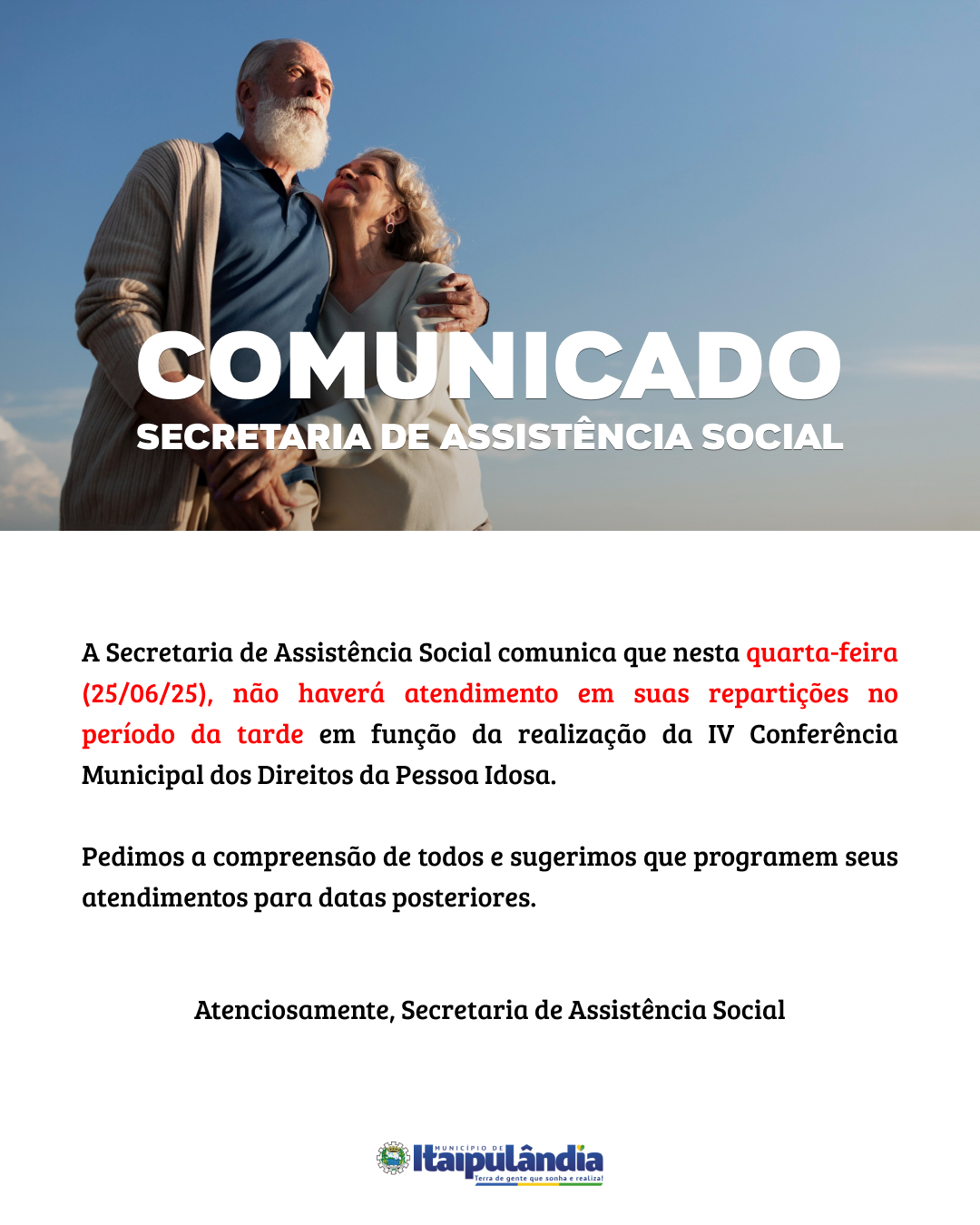 Confira o comunicado sobre o atendimento na Secretaria de Assistência Social válido para amanhã 25/06 (quarta-feira).