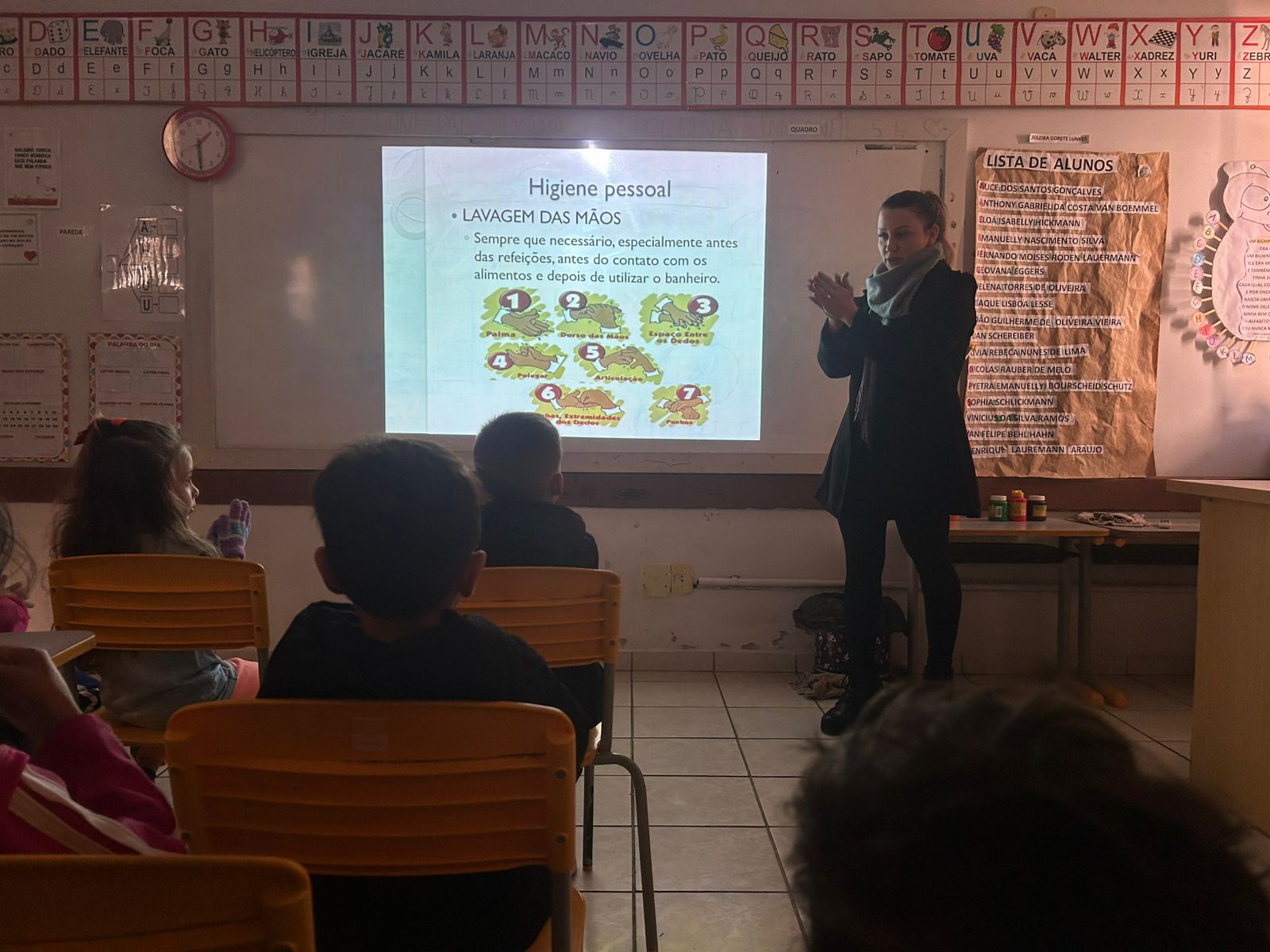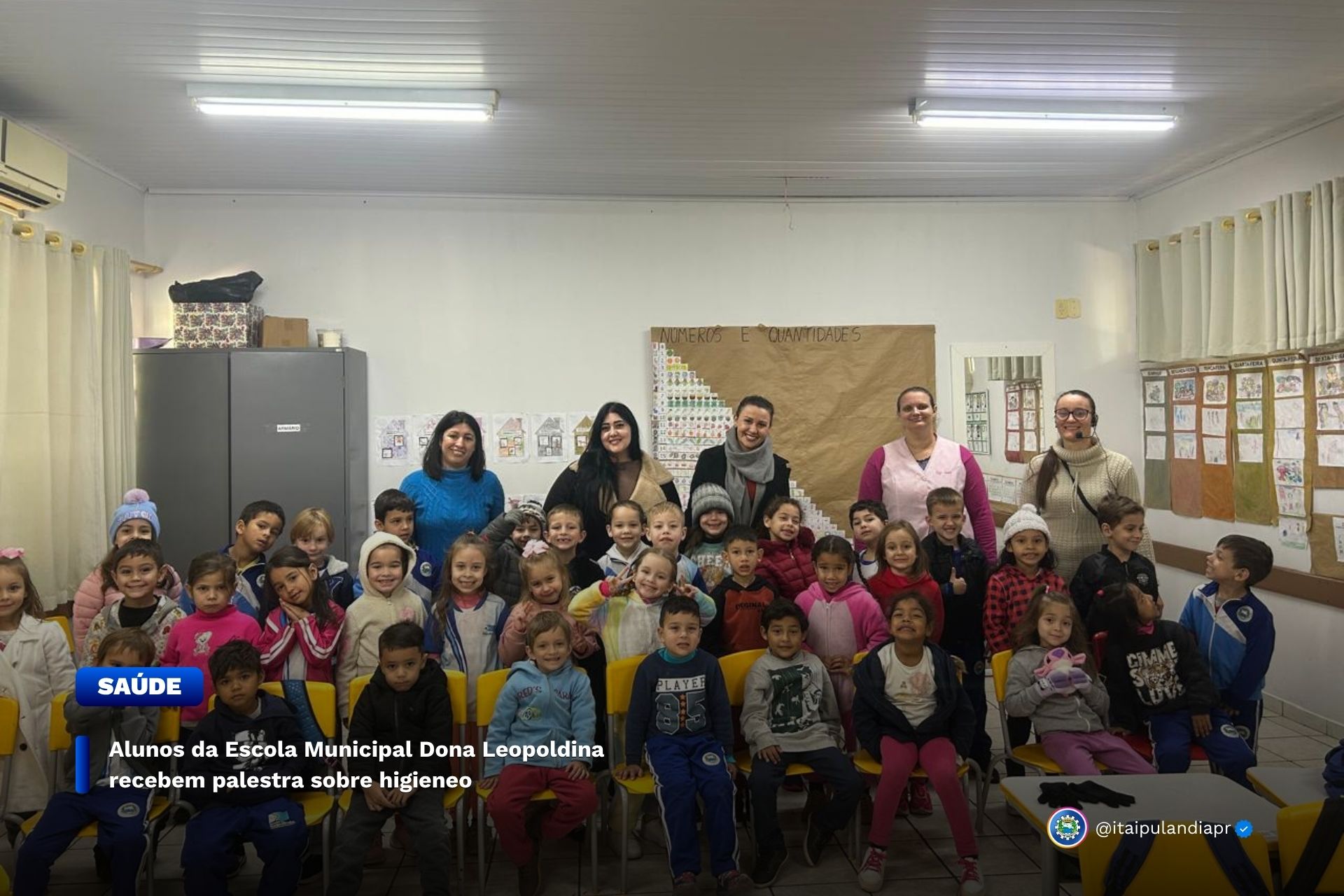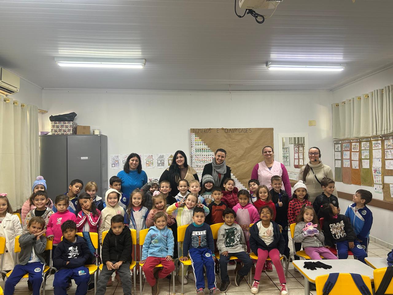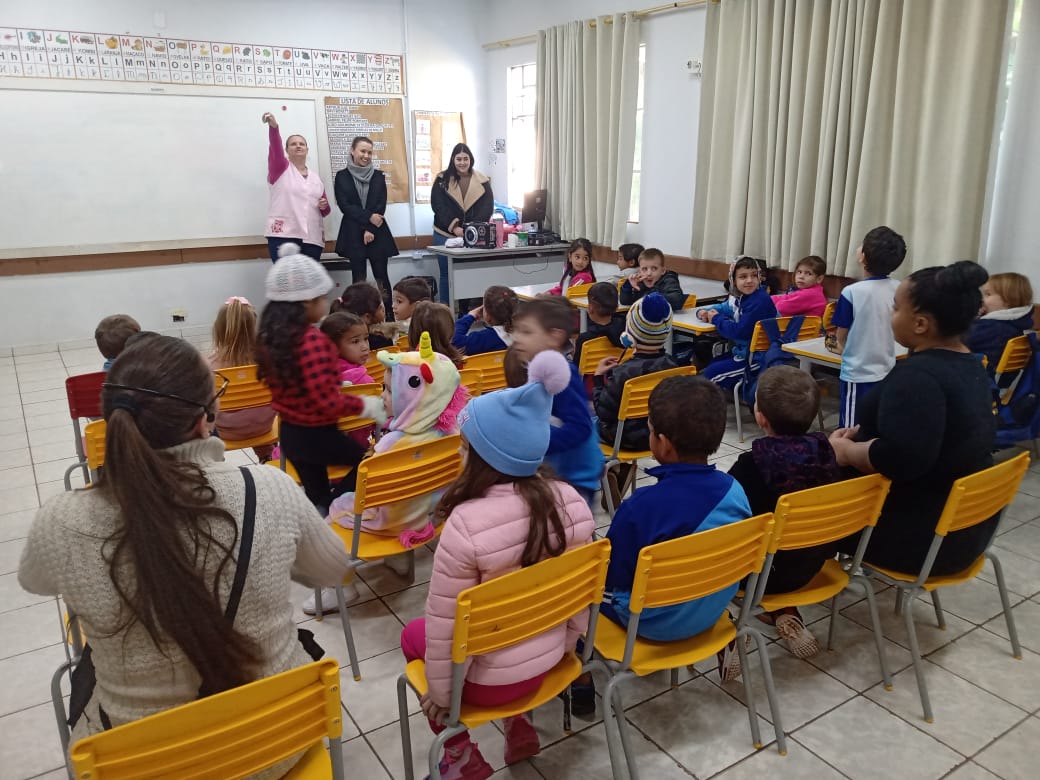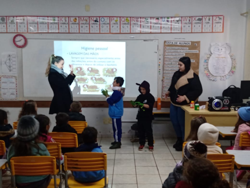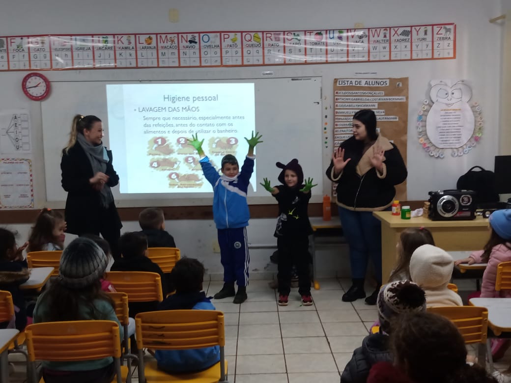Na tarde da última quarta-feira (25), os alunos do Infantil 5 da Escola Municipal Dona Leopoldina participaram de uma aula diferente, mas essencial. A enfermeira Suelini Colombo conduziu uma palestra educativa sobre higiene pessoal, reforçando cuidados importantes para a saúde e o bem-estar das crianças.