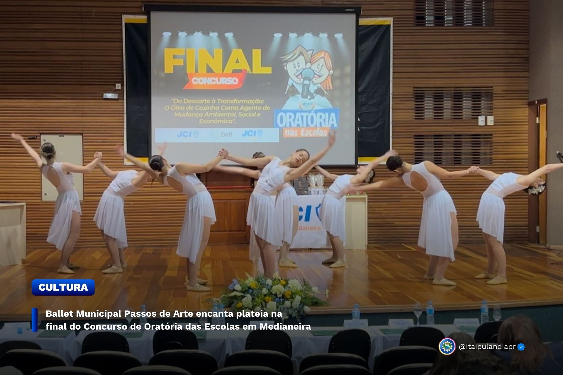 Na última quarta-feira (25), o Ballet Municipal Passos de Arte de Itaipulândia, sob a orientação da professora e coreógrafa Anna Suelyn Serena, participou como atração especial na final do Concurso de Oratória nas Escolas, promovido pela JCI de Medianeira. O evento foi realizado no auditório da UTFPR e contou com a presença de estudantes, educadores e familiares.