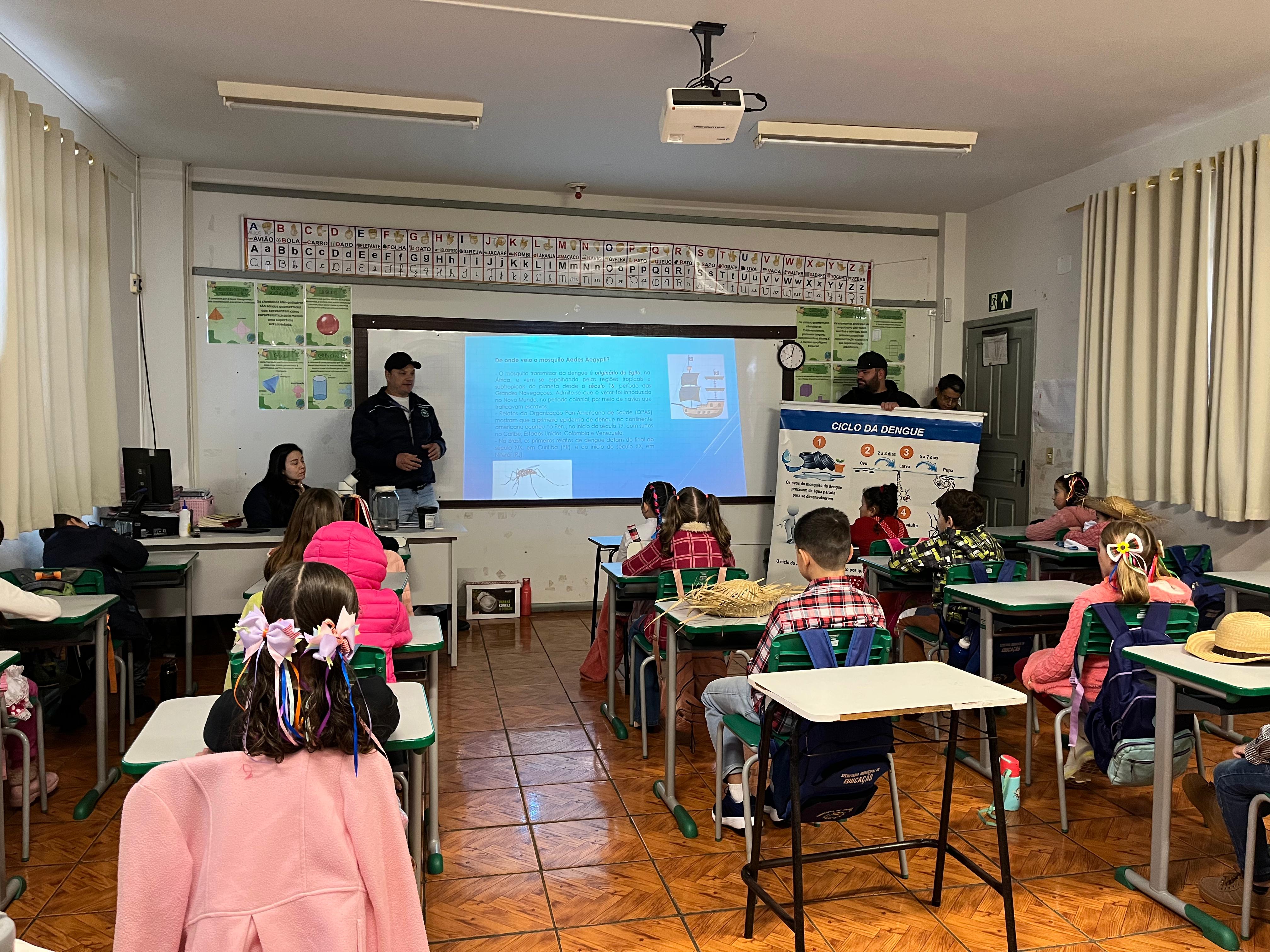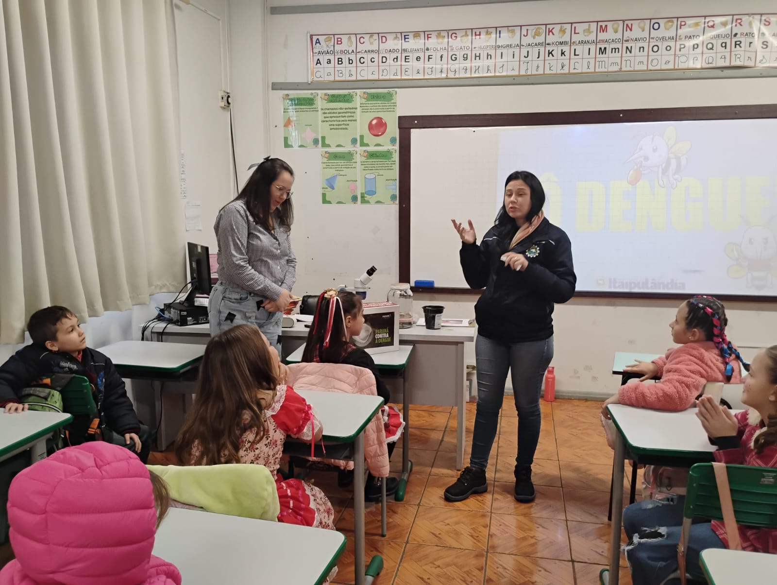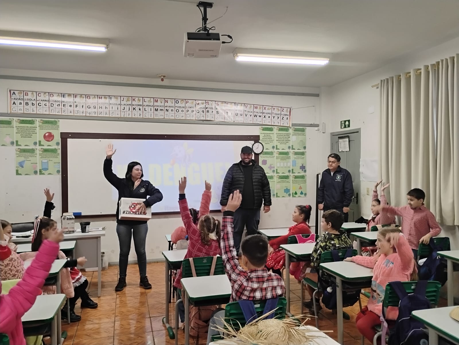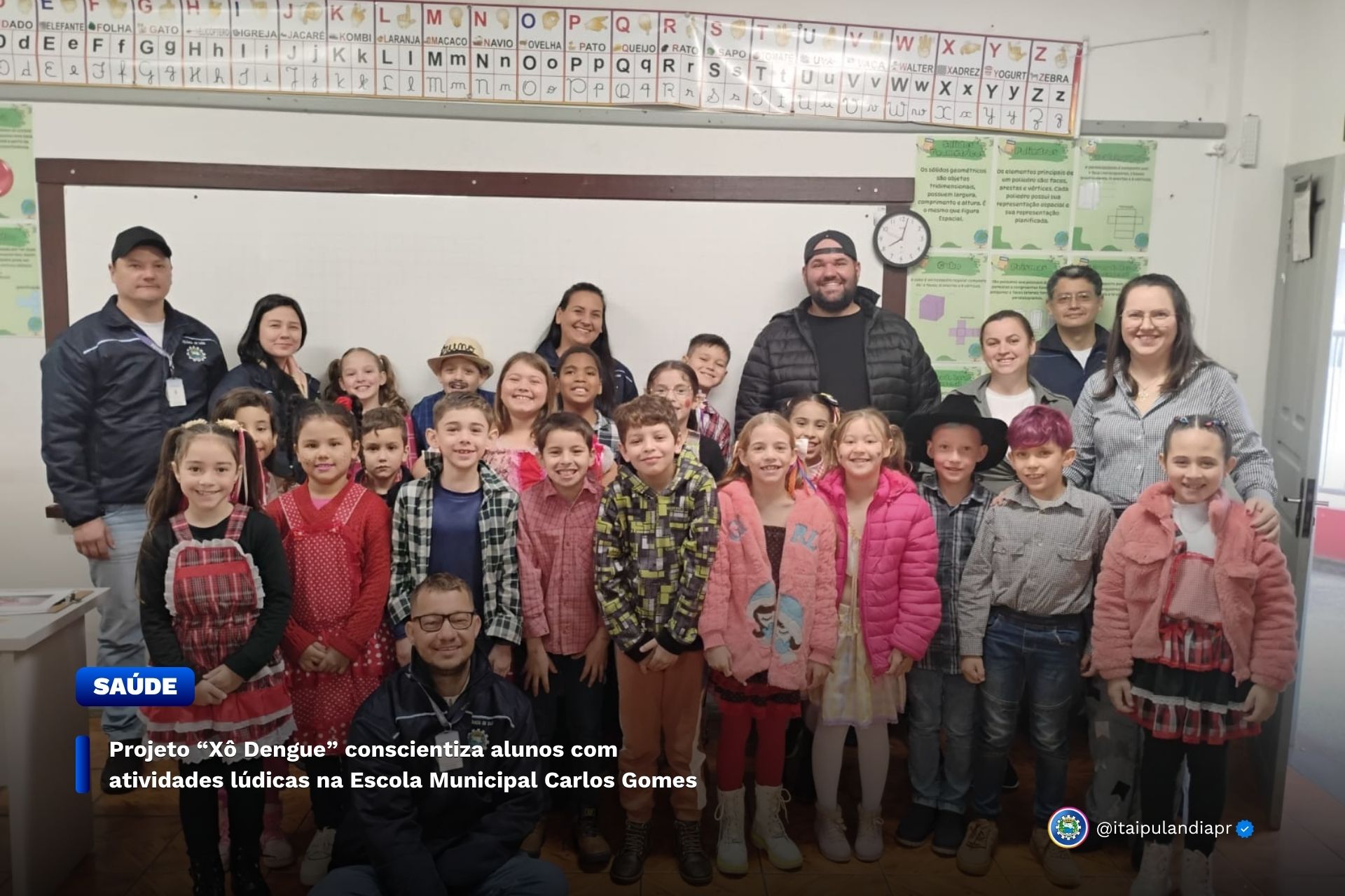 Na manhã desta sexta-feira (27), alunos do 3º ano B da Escola Municipal Carlos Gomes participaram do projeto piloto “Xô Dengue”, uma ação educativa promovida pela Vigilância Ambiental de Itaipulândia que contou com palestras e atividades lúdicas que abordaram os cuidados com a dengue e informações sobre o mosquito Aedes aegypti.