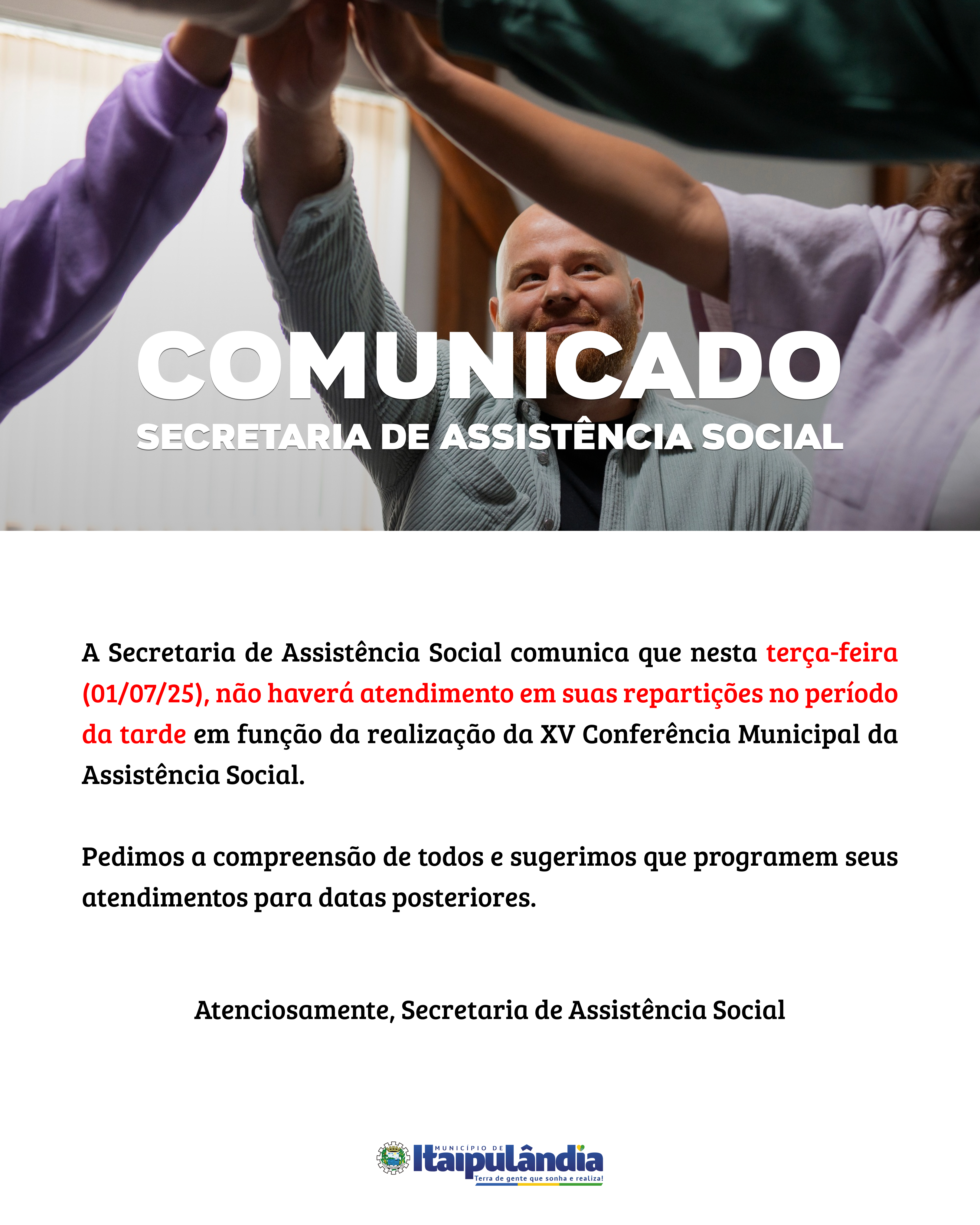Confira o comunicado sobre o atendimento na Secretaria de Assistência Social válido para amanhã 01/07 (terça-feira).