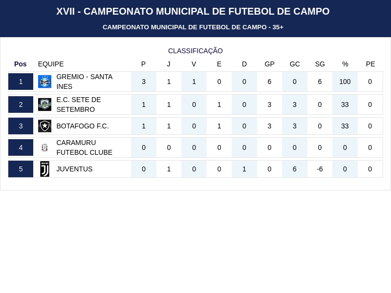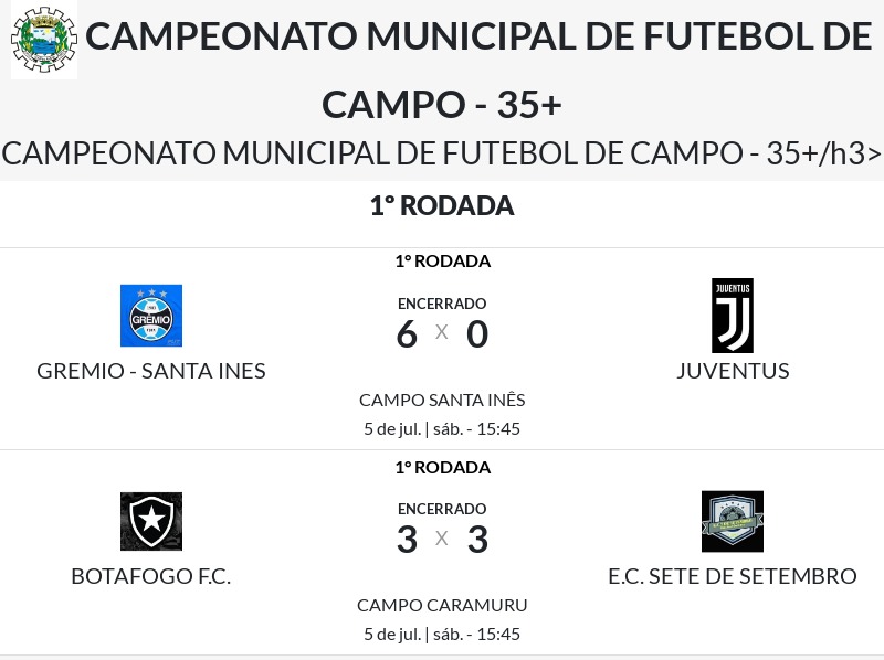 Os resultados foram: GREMIO - SANTA INÊS 06 X 00 JUVENTOS BOTAFOGO F.C 03 X 03 E.C. SETE DE SETEMBRO