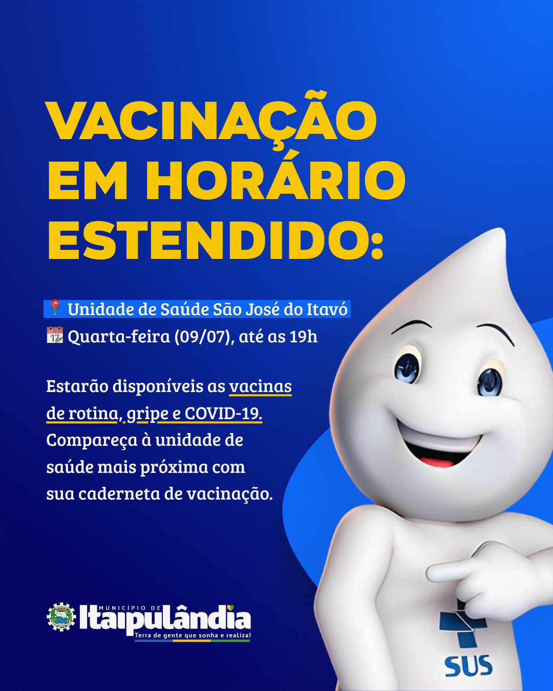 A Secretaria Municipal de Saúde comunica que estará com horários estendidos para vacinação, confira na imagem as unidades, datas e horários. Compareça à unidade de saúde mais próxima com a caderneta de vacinação em mãos!
