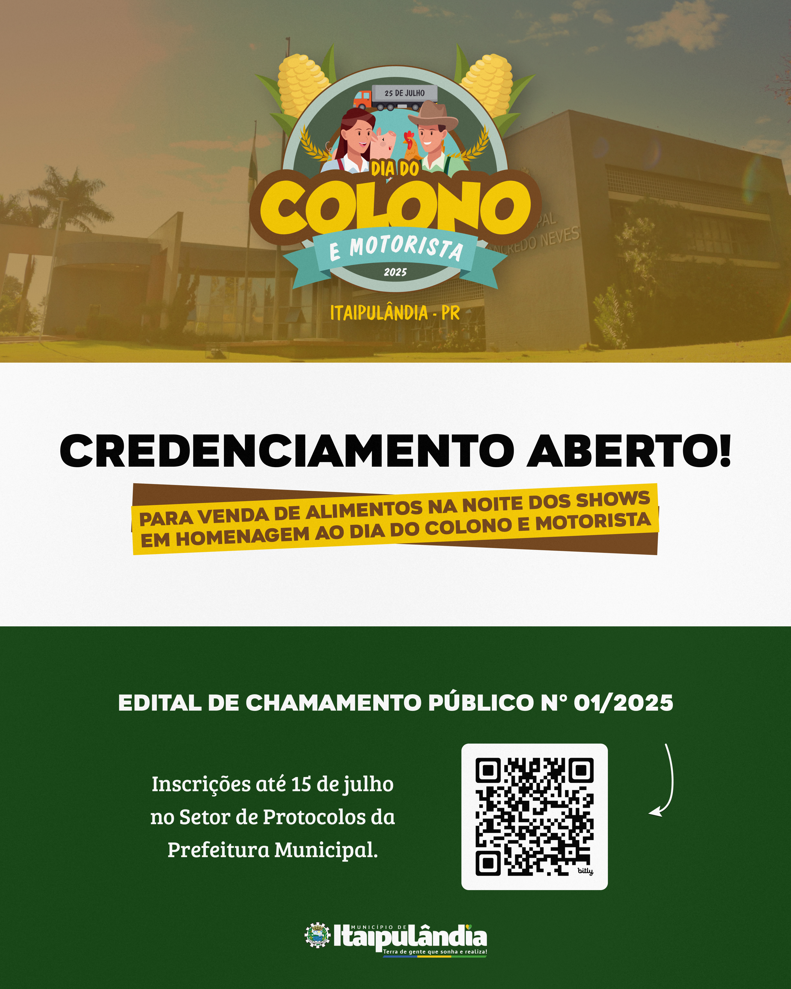A Administração Municipal, por meio da Secretaria de Agricultura, comunica que estão abertas as inscrições para o credenciamento de até 05 (cinco) empreendimentos do ramo alimentício (que possuam em seu CNAE a comercialização de alimentos) interessados em atuar durante a noite dos shows em homenagem ao Dia do Colono e Motorista, que será realizado no dia 25 de julho de 2025 em frente ao Paço Municipal Tancredo Neves em Itaipulândia.