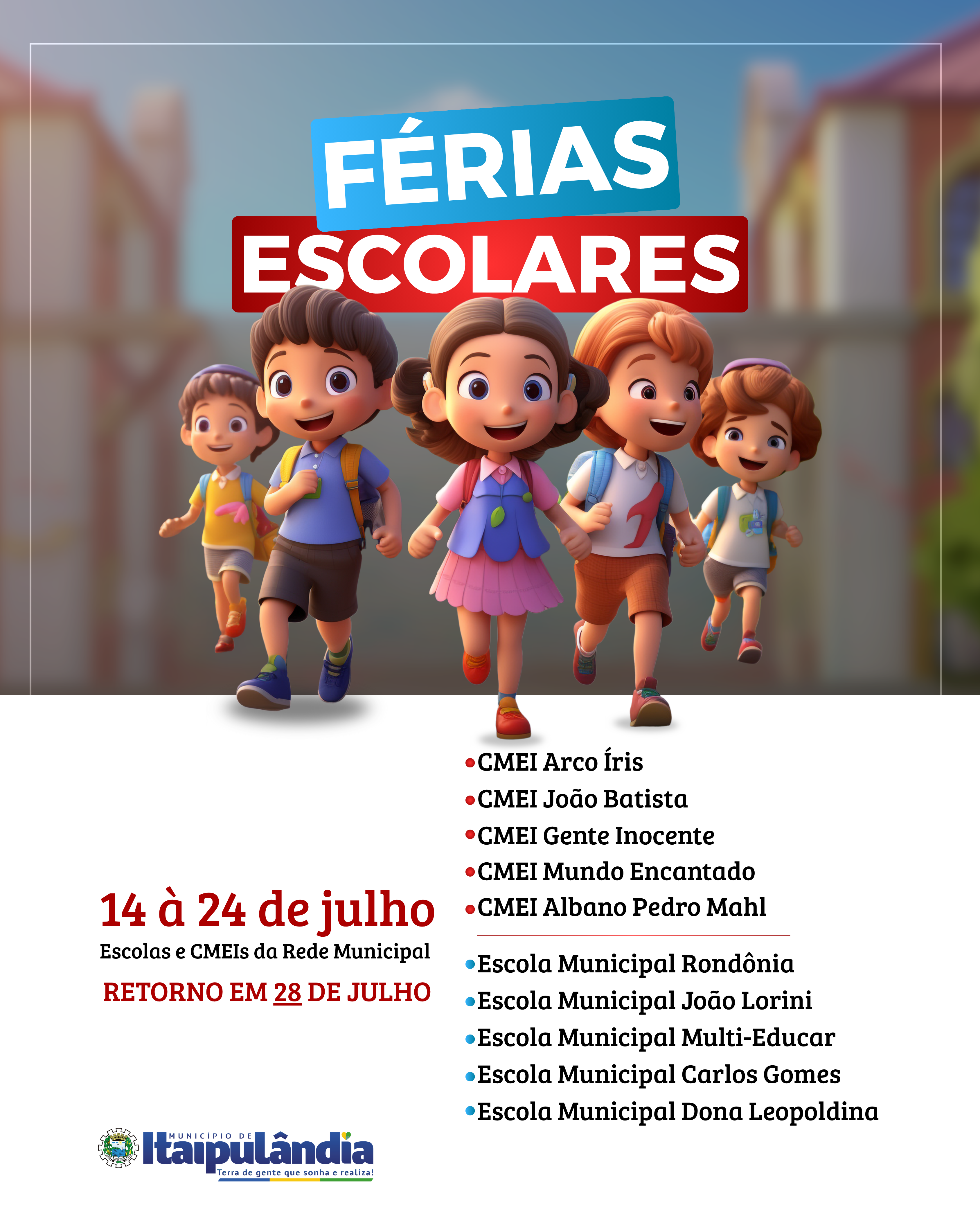 As férias escolares começam na segunda-feira, dia 14, e vão até o dia 24 de julho. Aproveite esse tempo para descansar, brincar e curtir com a família!