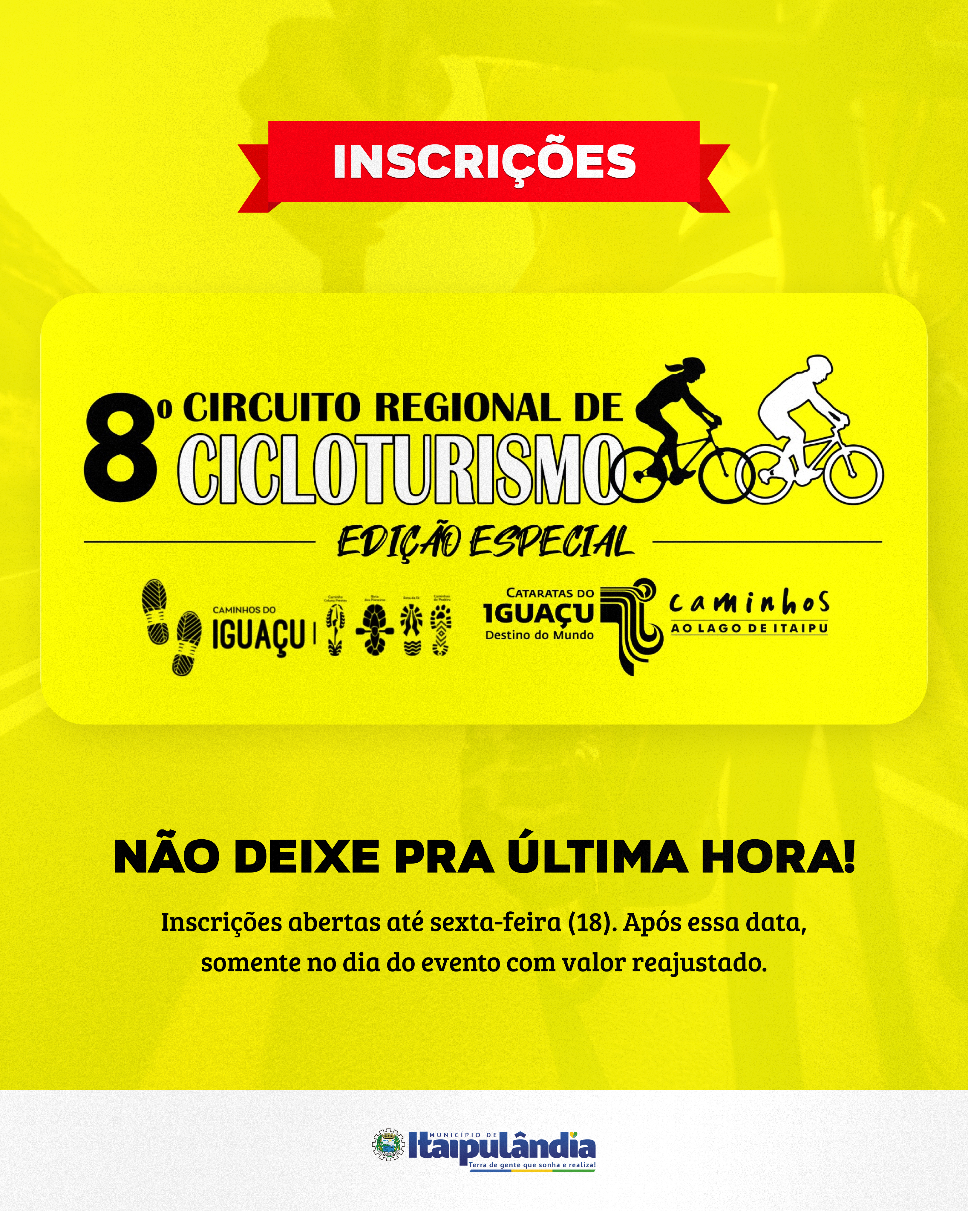 As inscrições para a 11ª etapa do 8º Circuito Regional de Cicloturismo encerram nesta sexta-feira (18). Após essa data será possível se inscrever apenas no dia do evento (20/07) com valor reajustado.