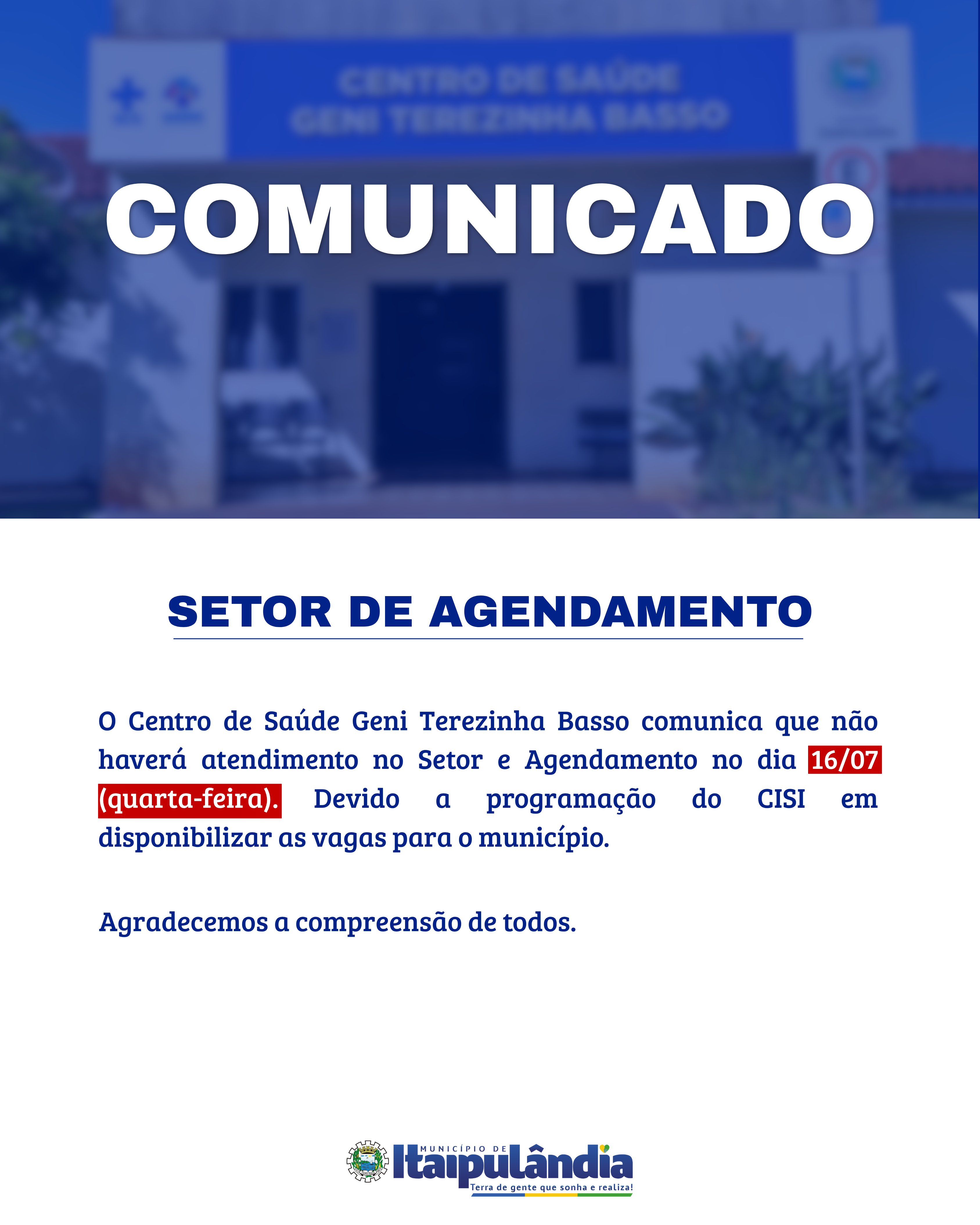 Informamos que o Setor de Agendamento do Centro de Saúde Geni Terezinha Basso estará fechado amanhã, dia 16 (quarta-feira), devido à abertura das vagas do CISI. Pedimos a compreensão de todos e agradecemos pela colaboração!