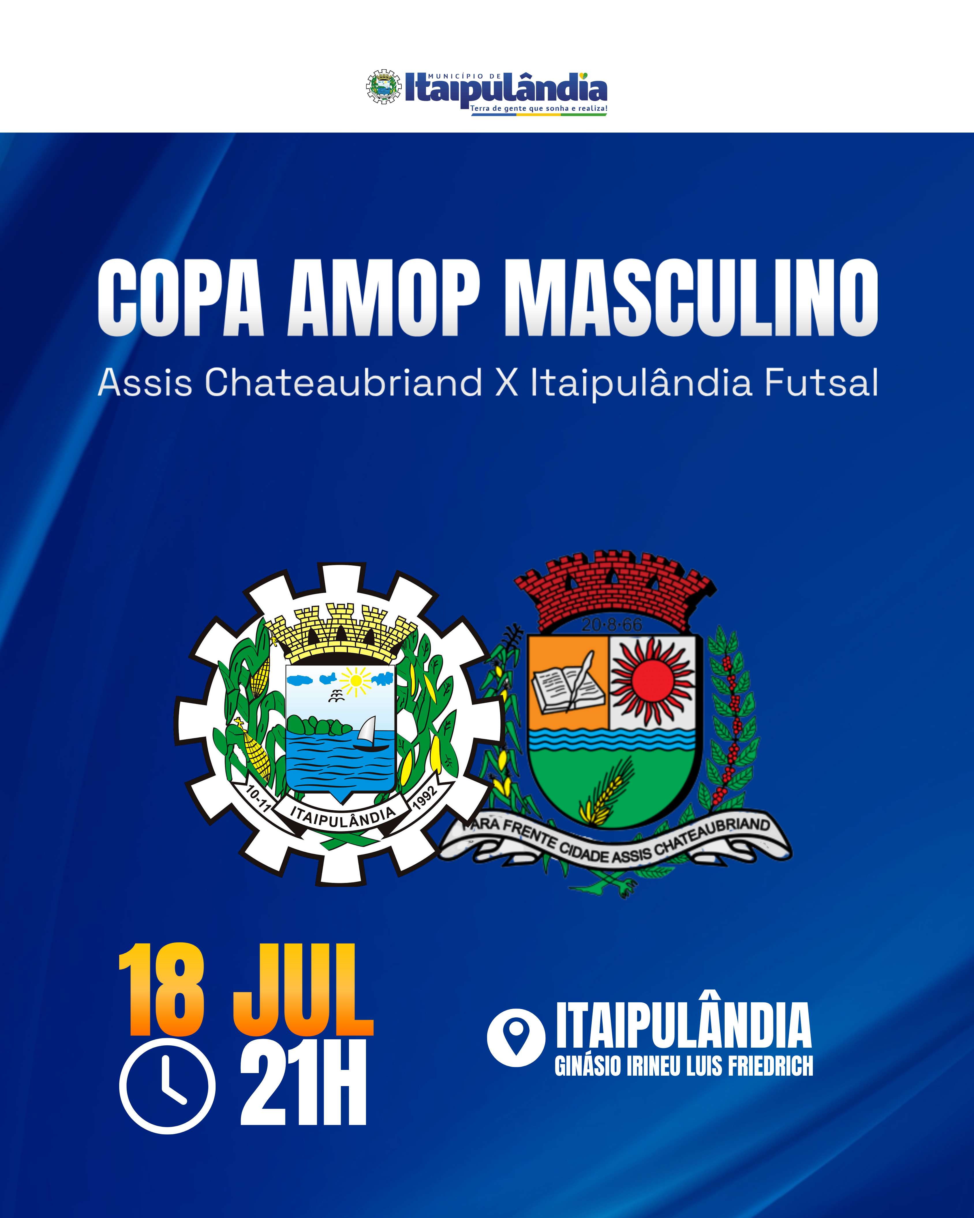 A equipe masculina de Itaipulândia entra em quadra às 21h, no Ginásio Municipal Irineu Luiz Friedrich, novamente contra a equipe de Assis Chateaubriand, em busca da vaga nas quartas da Copa AMOP de Futsal!