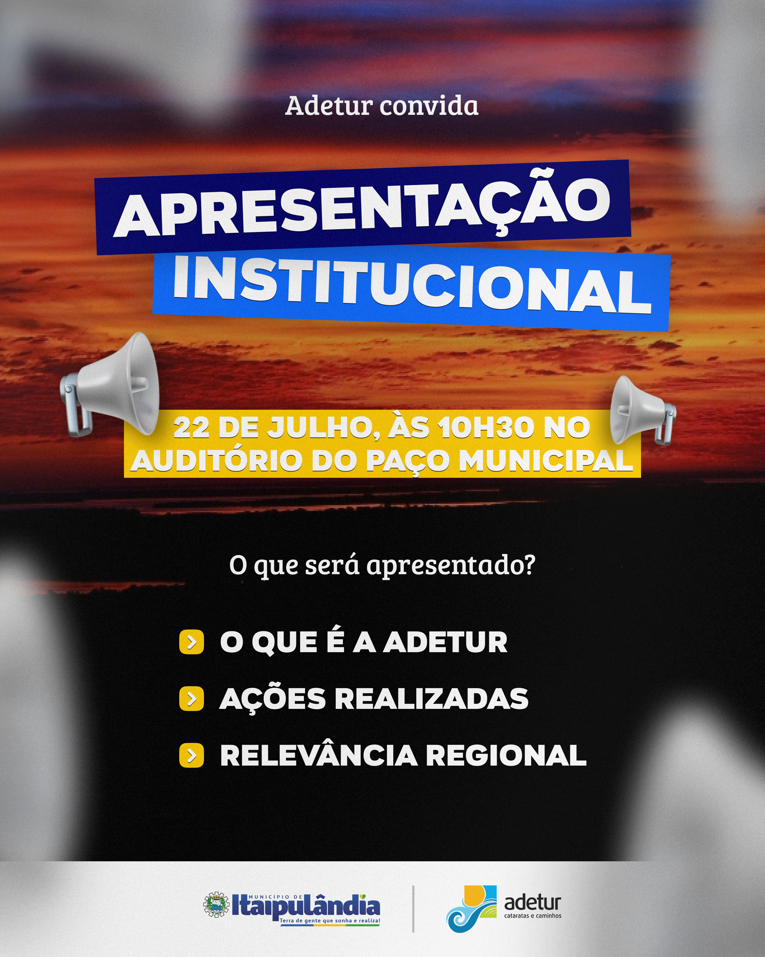 Na próxima terça-feira (22), às 10h30, a Adetur Cataratas e Caminhos, em parceria com o município de Itaipulândia, realizará uma apresentação institucional com o intuito de compartilhar as ações e iniciativas em desenvolvimento na região. O principal objetivo é mobilizar associados e fortalecer o setor turístico local.