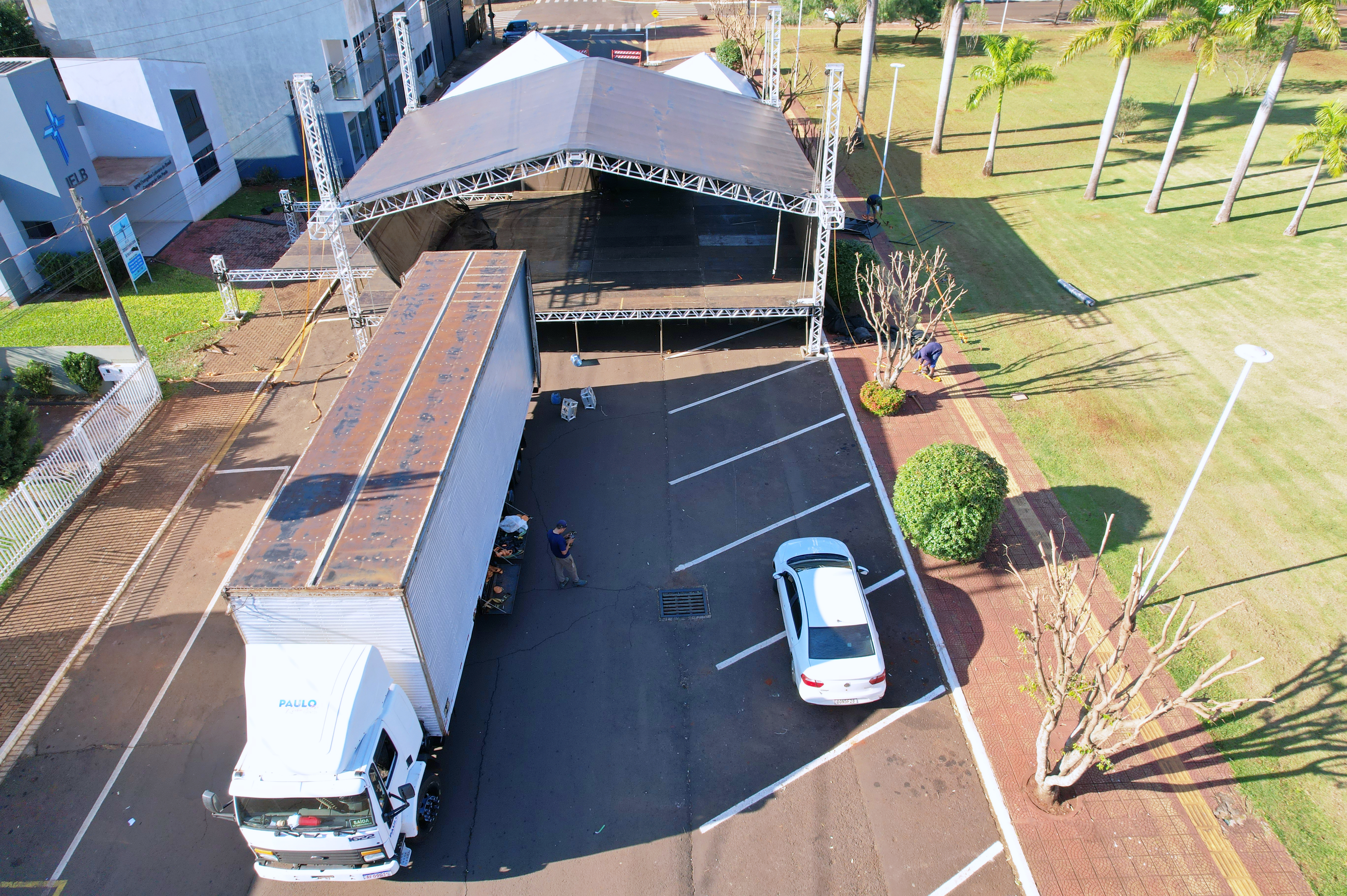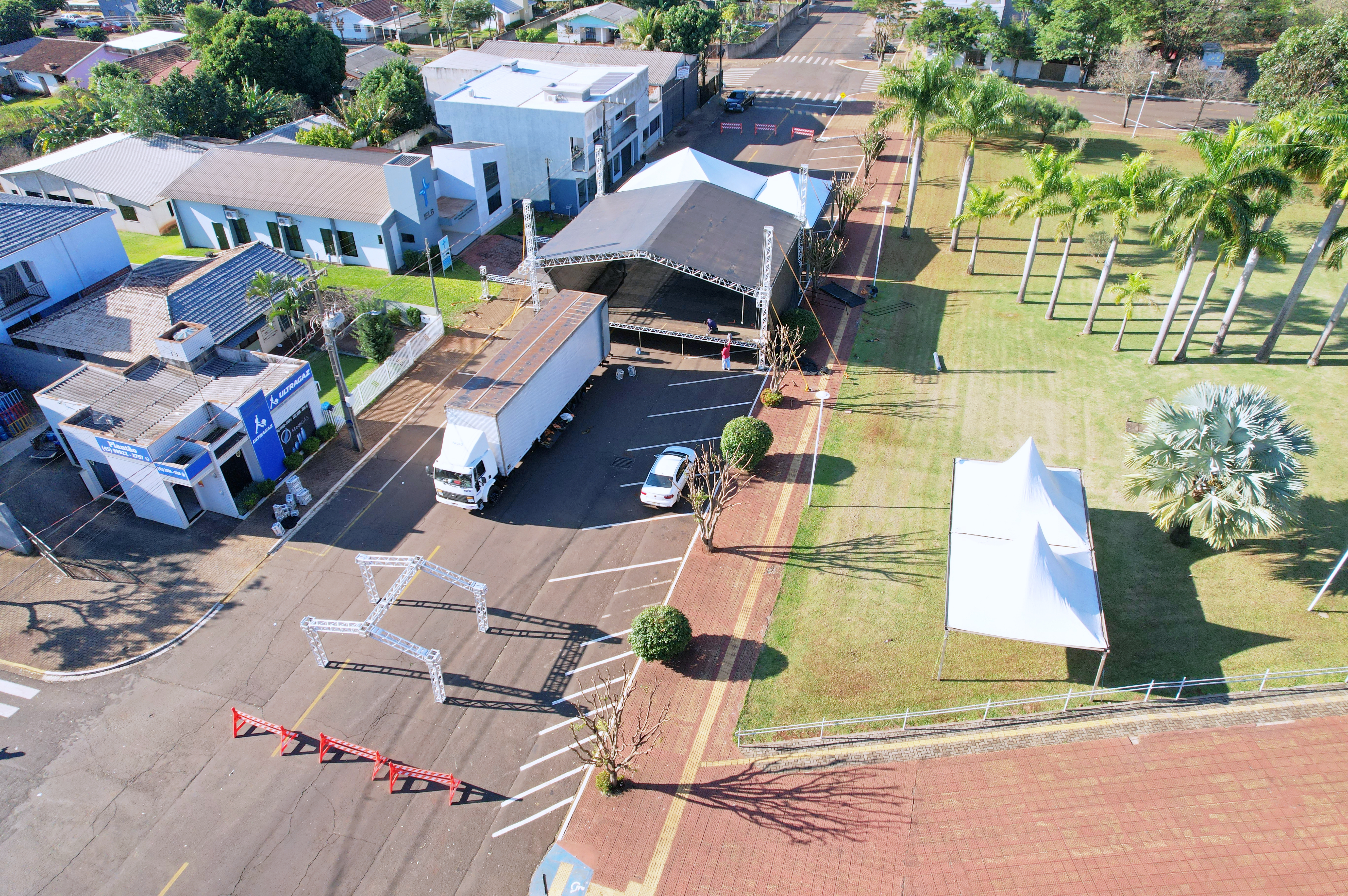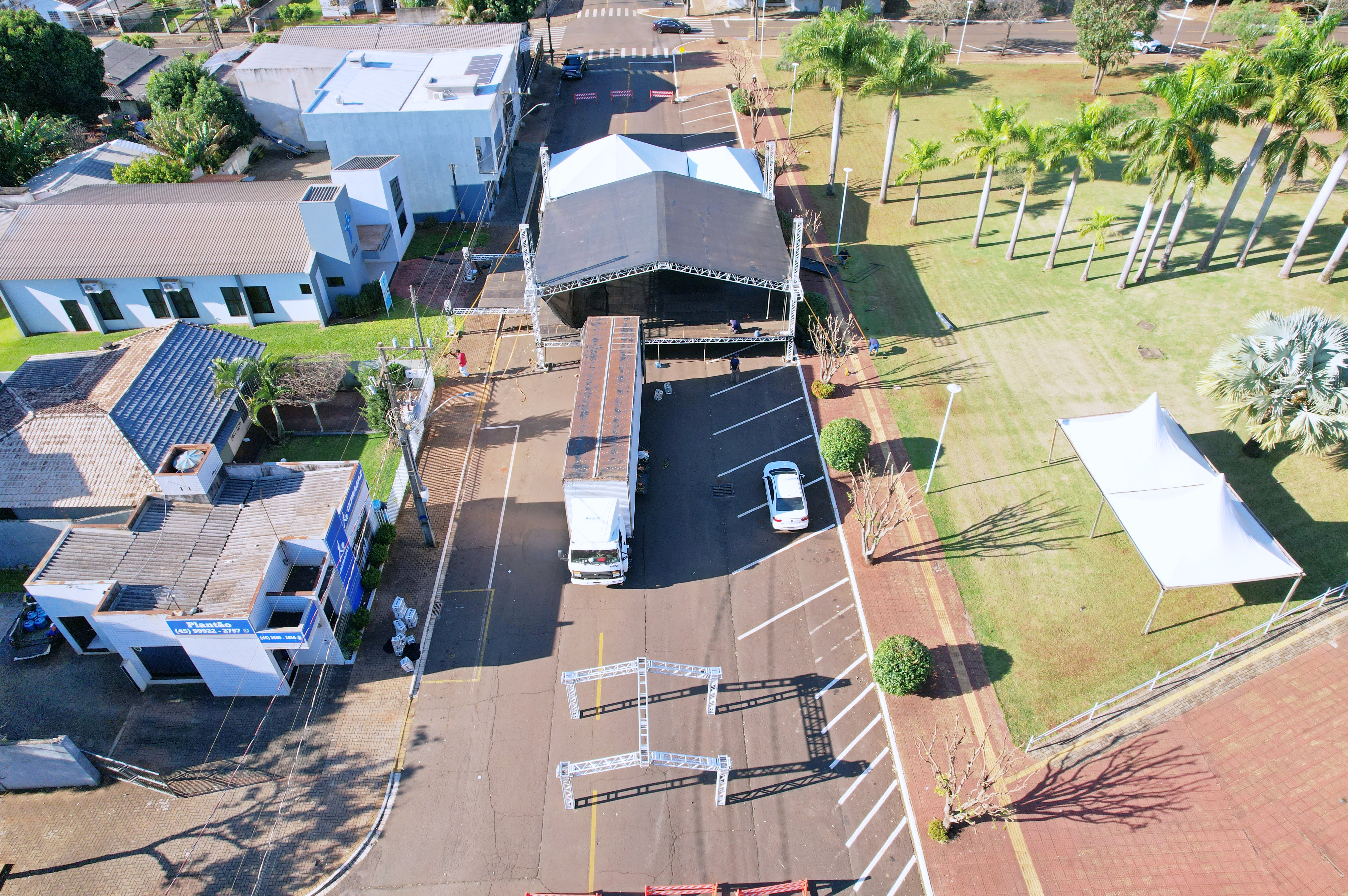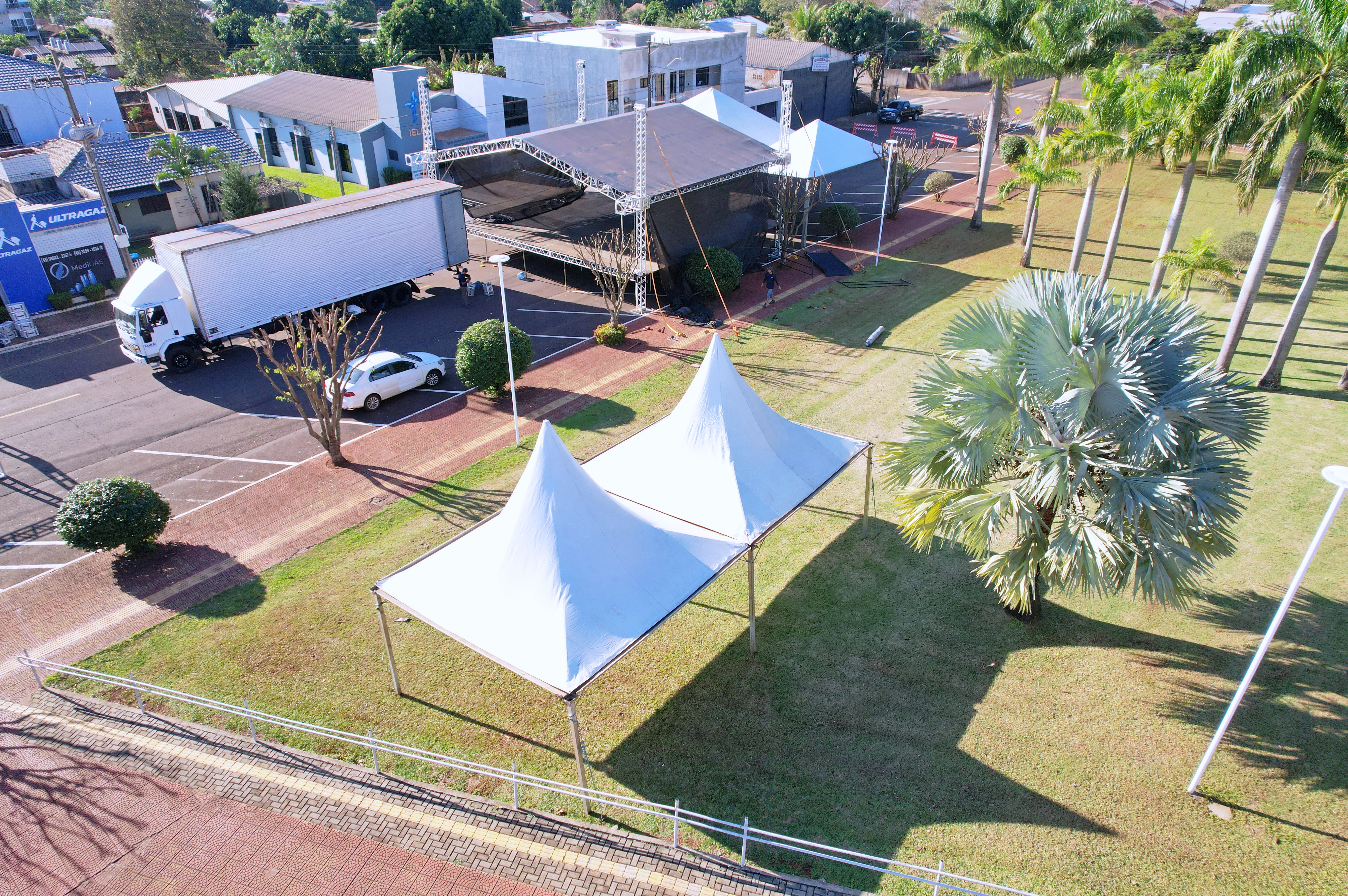 O palco e os camarins estão sendo montados em frente ao Paço Municipal Tancredo Neves.