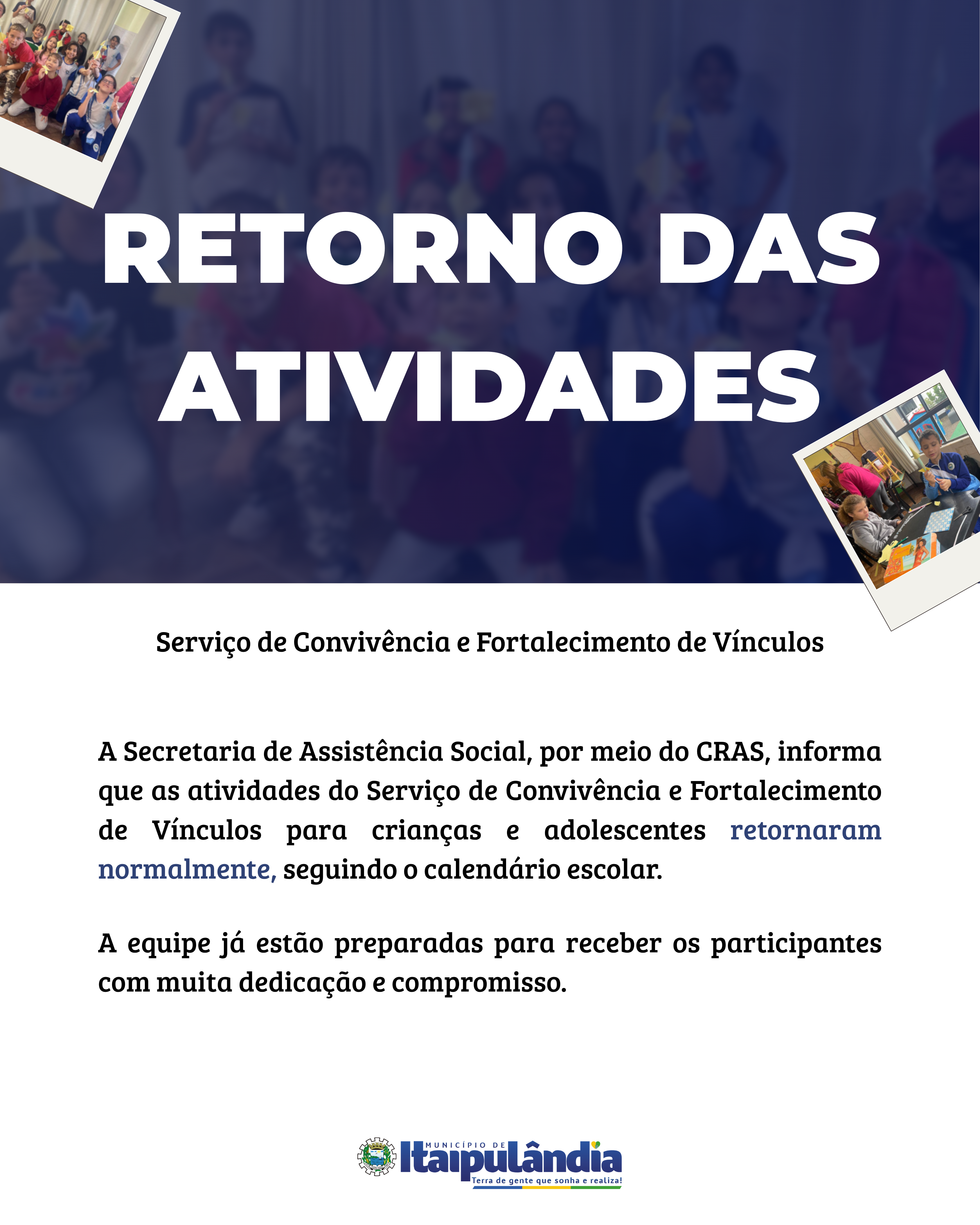 A Secretaria de Assistência Social, por meio do CRAS, informa que as atividades voltadas para crianças e adolescentes já estão acontecendo normalmente, seguindo o calendário escolar.
