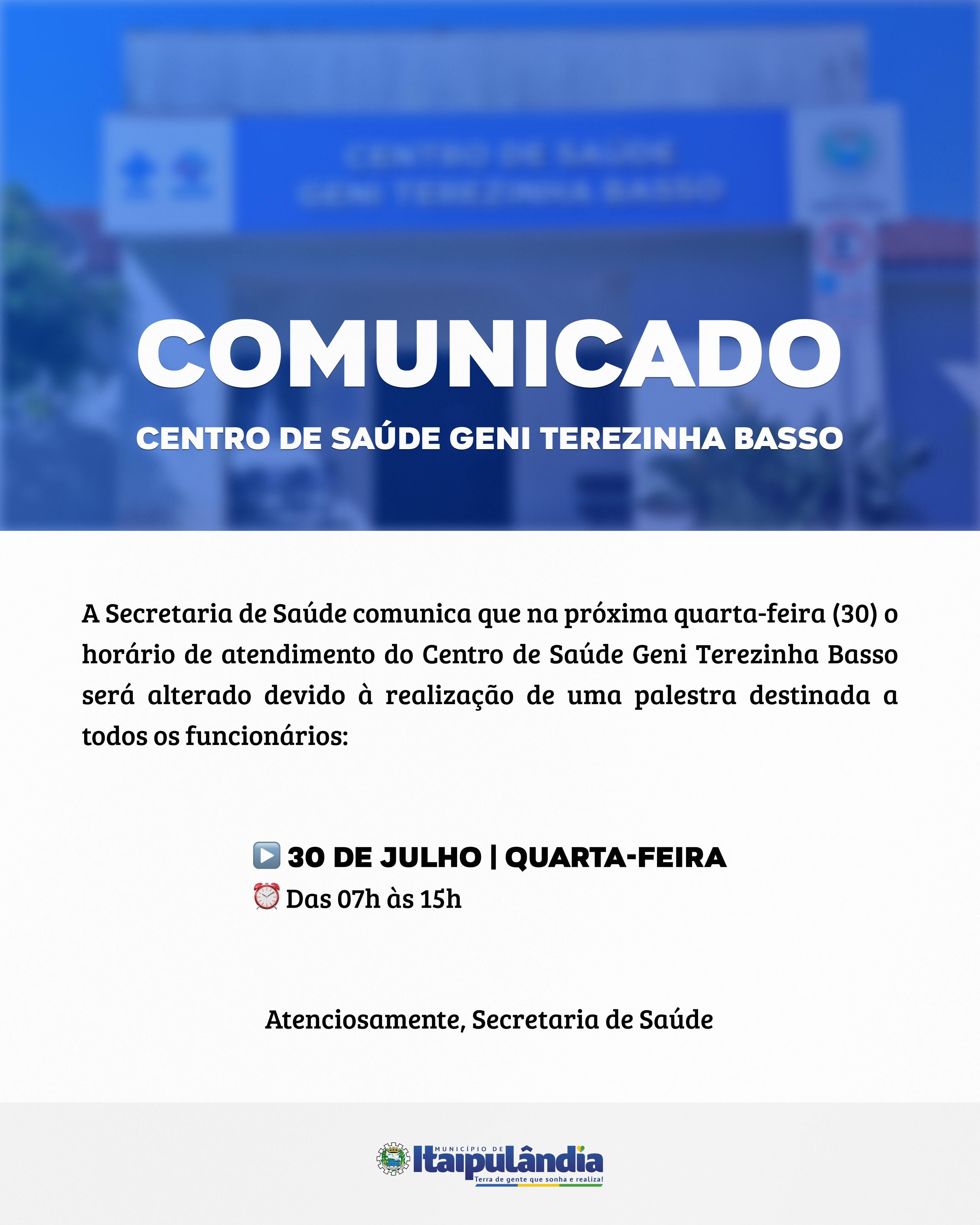 Confira o comunicado da Secretaria de Saúde sobre o horário de atendimento do Centro de Saúde Geni Terezinha Basso válido para quarta-feira (30).