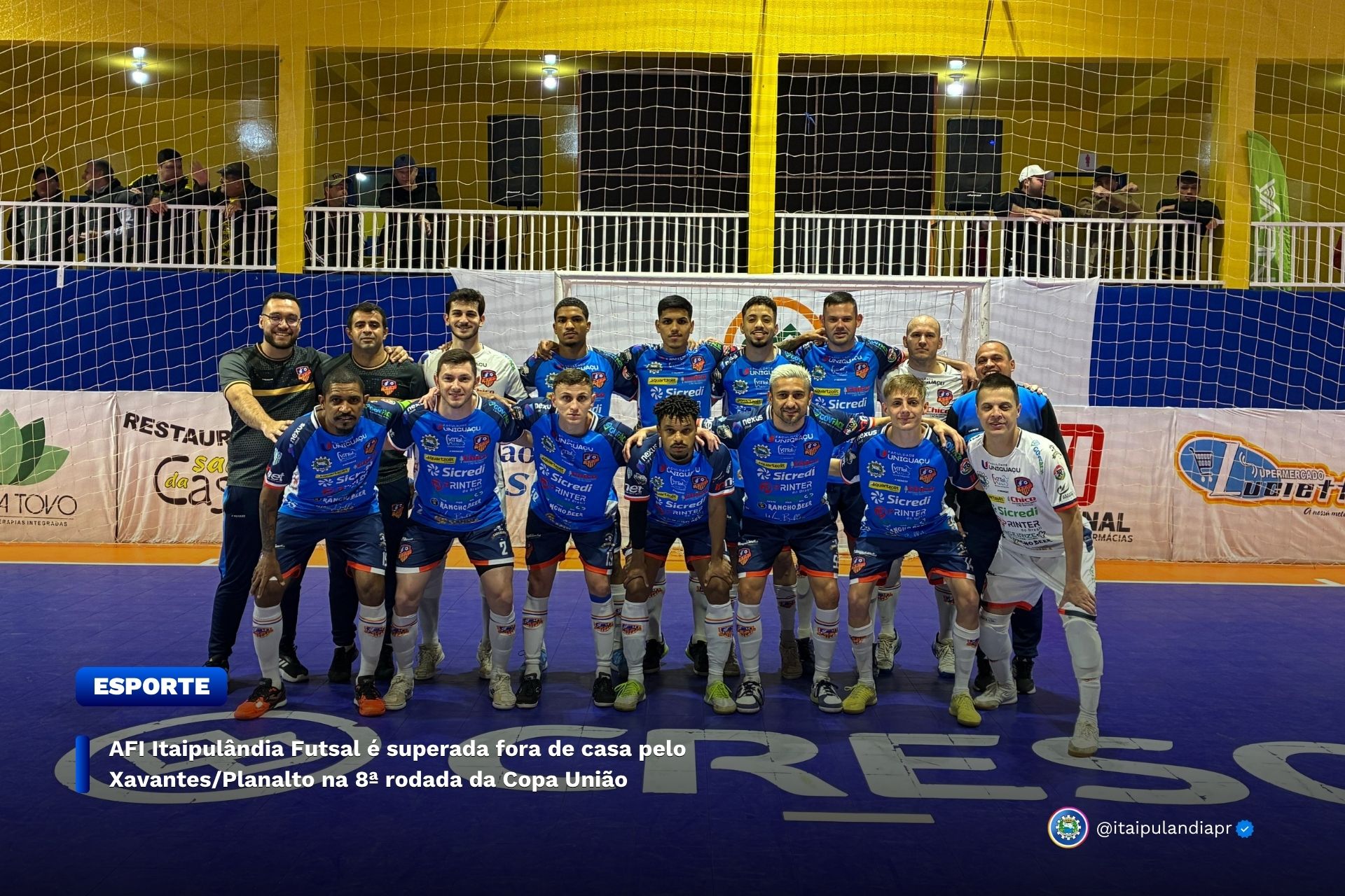 Pela 8ª rodada da Copa União, a AFI Itaipulândia Futsal enfrentou o Xavantes/Planalto na noite de ontem (30), no Ginásio Municipal de Planalto. Apesar do esforço, a equipe itaipulandiense acabou derrotada por 5 a 2 diante da torcida adversária.