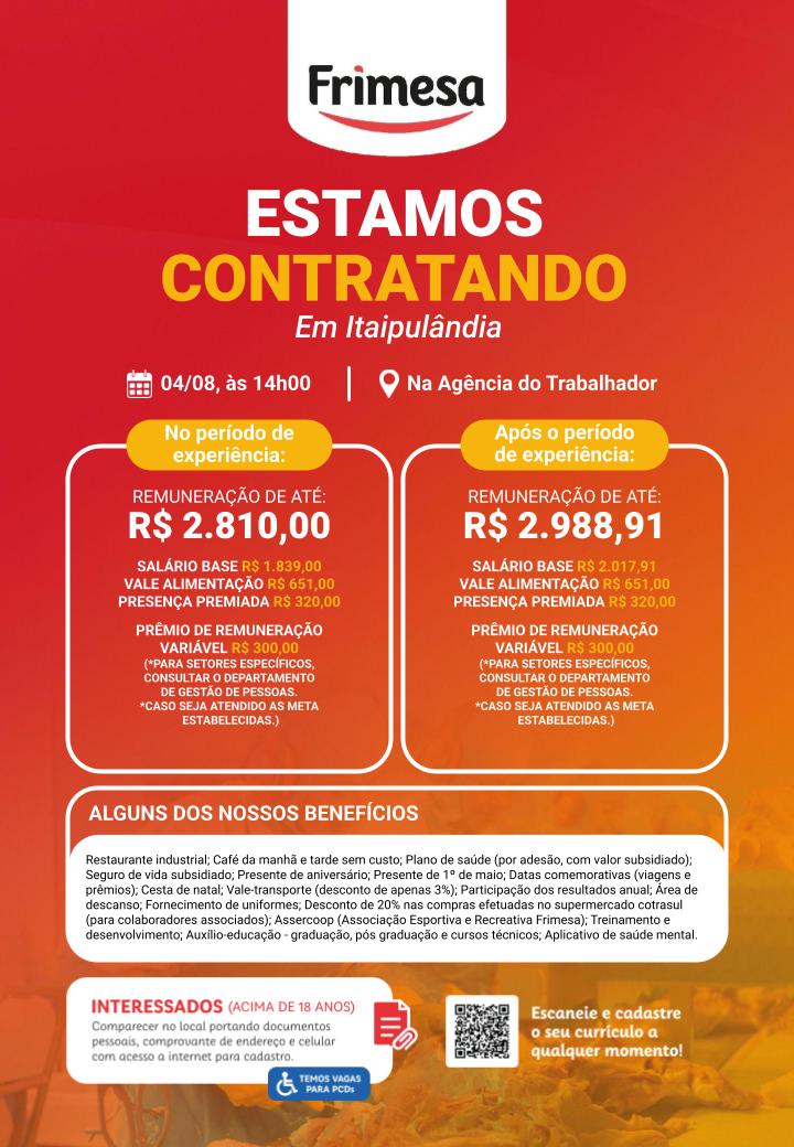 A equipe da Unidade Frigorífica de Medianeira (Frimesa) estará na Agência do Trabalhador de Itaipulândia no dia 04/08 (segunda-feira) para realizar entrevistas aos interessados nas vagas disponíveis para trabalho.