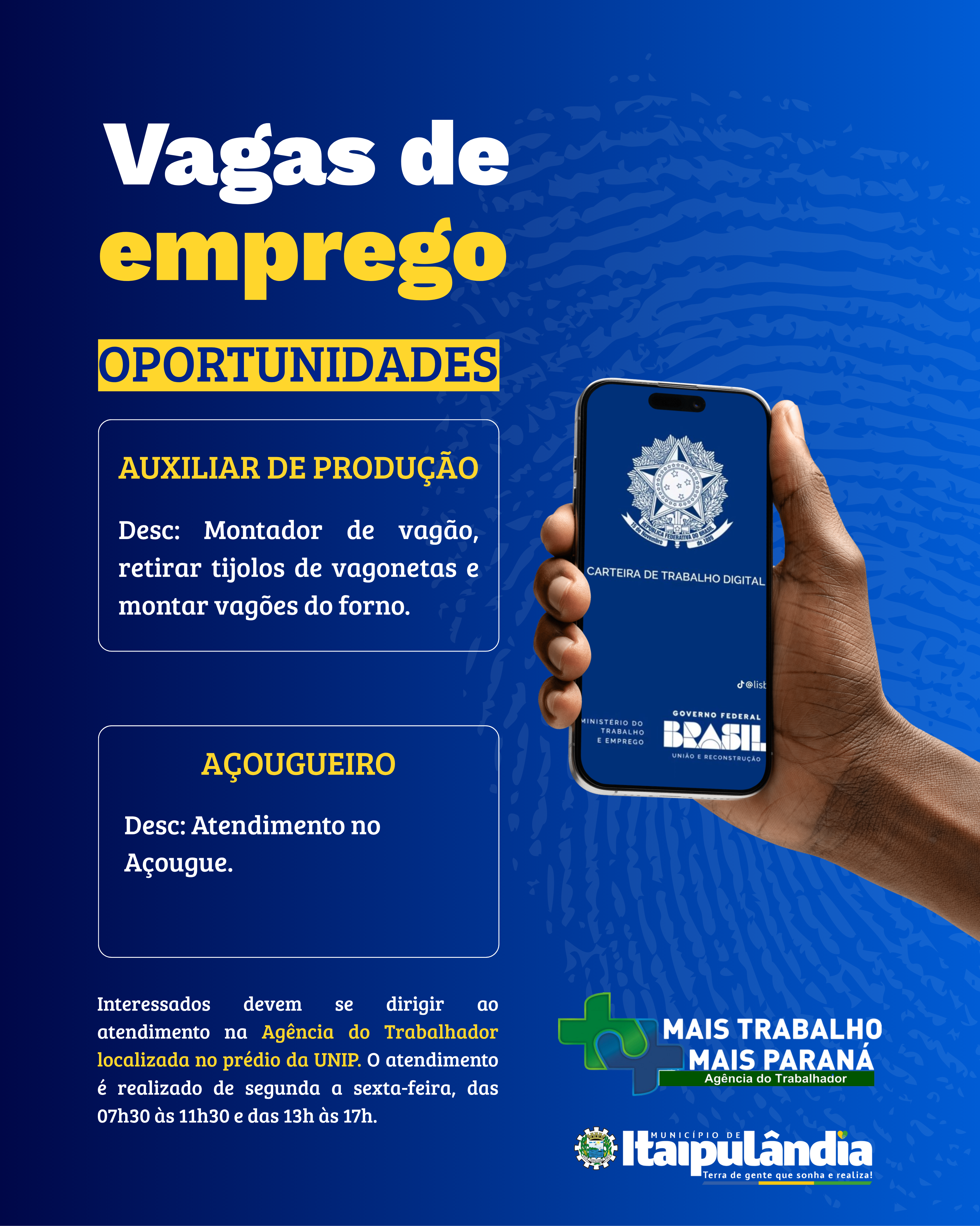 A Agência do Trabalhador de Itaipulândia informa que estão abertas oportunidades de emprego para os seguintes cargos: