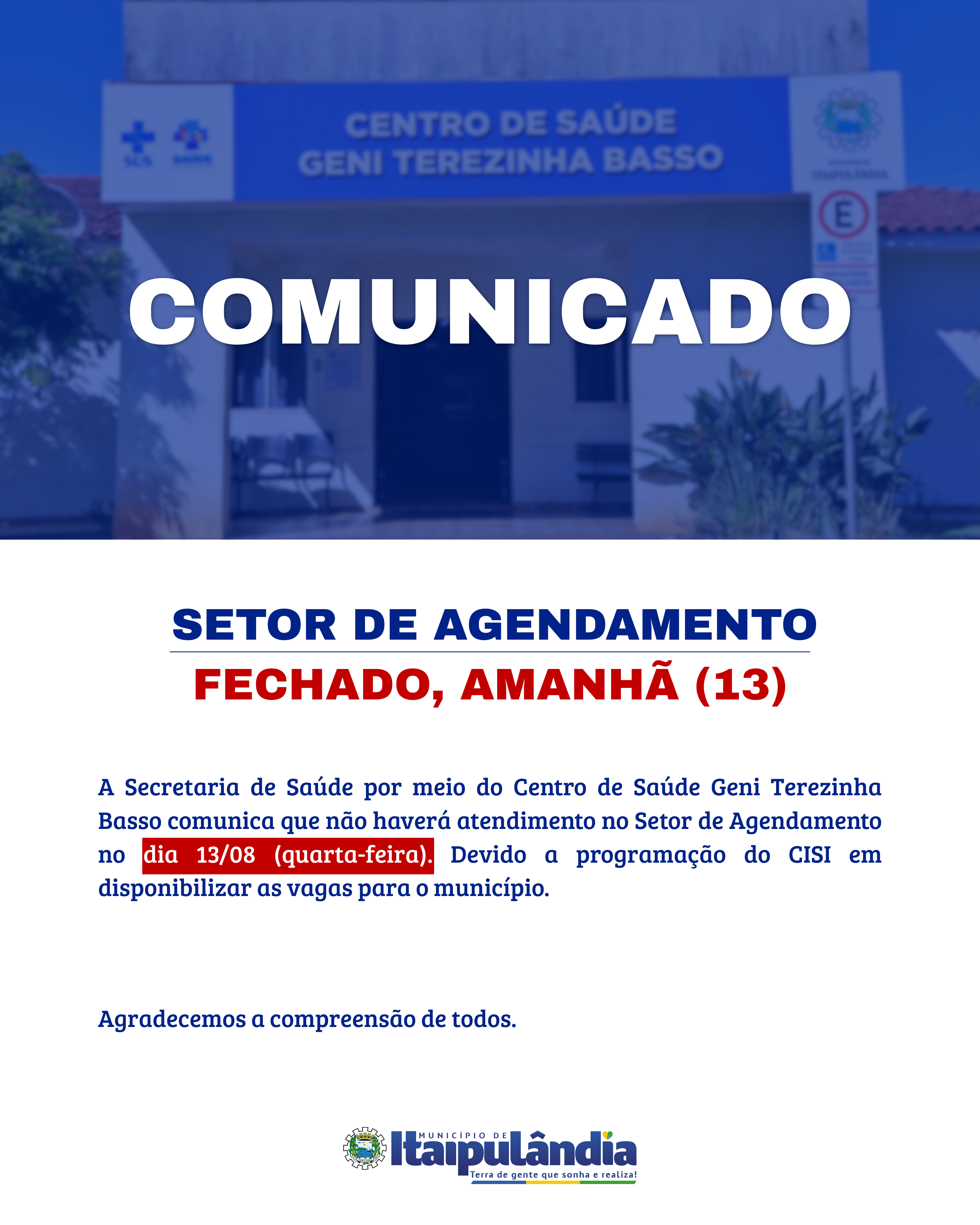 Informamos que o Setor de Agendamento do Centro de Saúde Geni Terezinha Basso estará fechado amanhã, dia 13 (quarta-feira), devido à abertura das vagas do CISI.