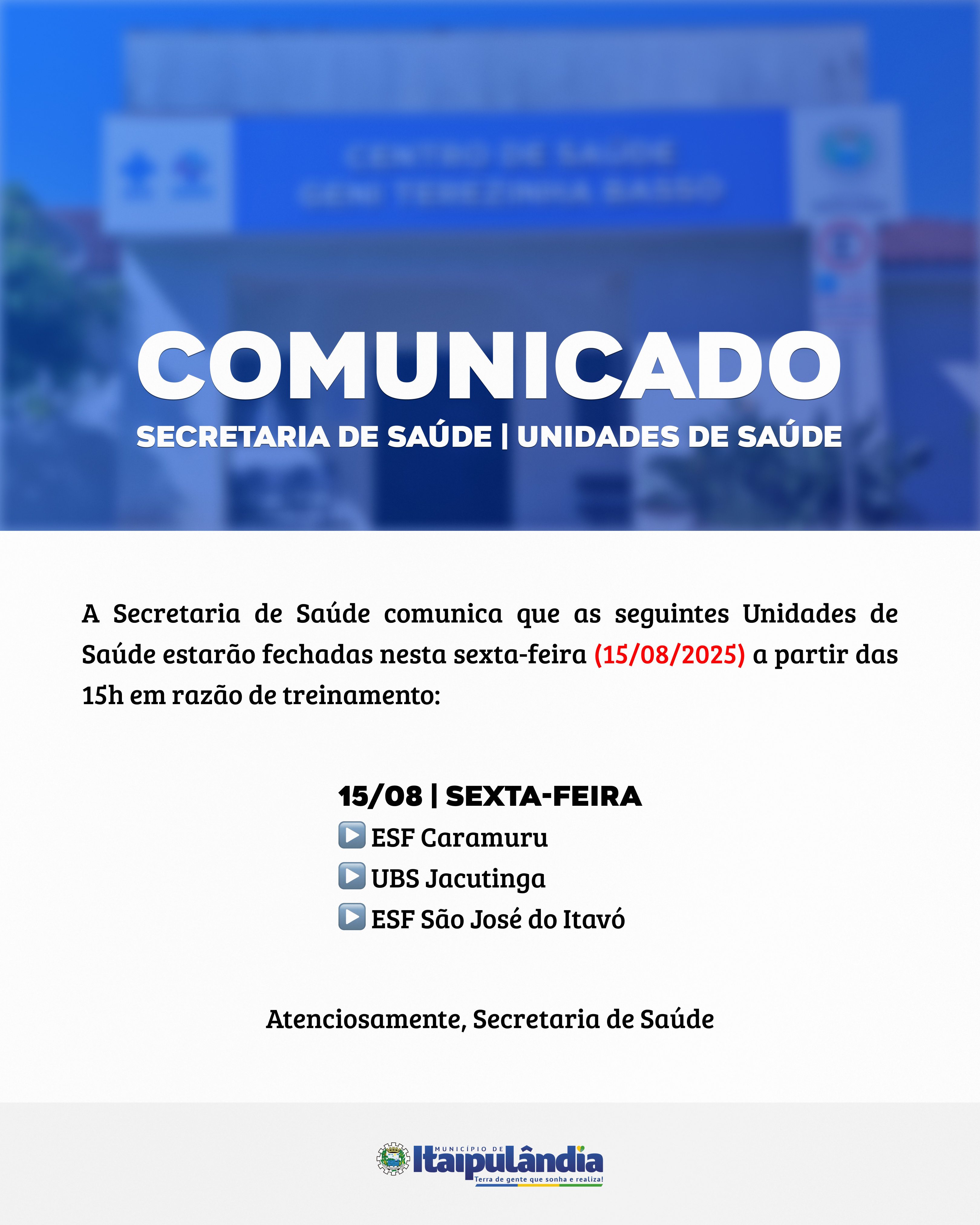 Confira o comunicado da Secretaria de Saúde sobre o horário de atendimento das Unidades de Saúde válido para sexta-feira (15).
