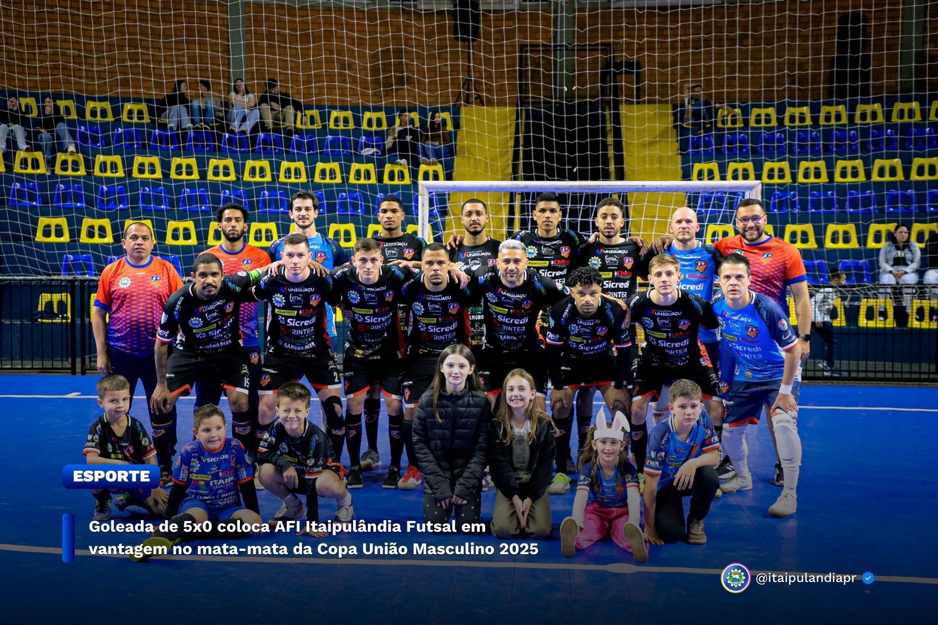 Em uma noite de grande desempenho, a AFI Itaipulândia Futsal venceu o MEC Futsal por 5 a 0 no jogo de ida do mata-mata da Copa União Masculino 2025. Com o apoio da torcida, a equipe mostrou superioridade do início ao fim, construindo o placar com gols de Tavares (camisa 07), Adeirton (camisa 55), Pedrinho (camisa 19), Café (camisa 15) e Zola (camisa 02). O resultado coloca o time em posição confortável para o confronto de volta.