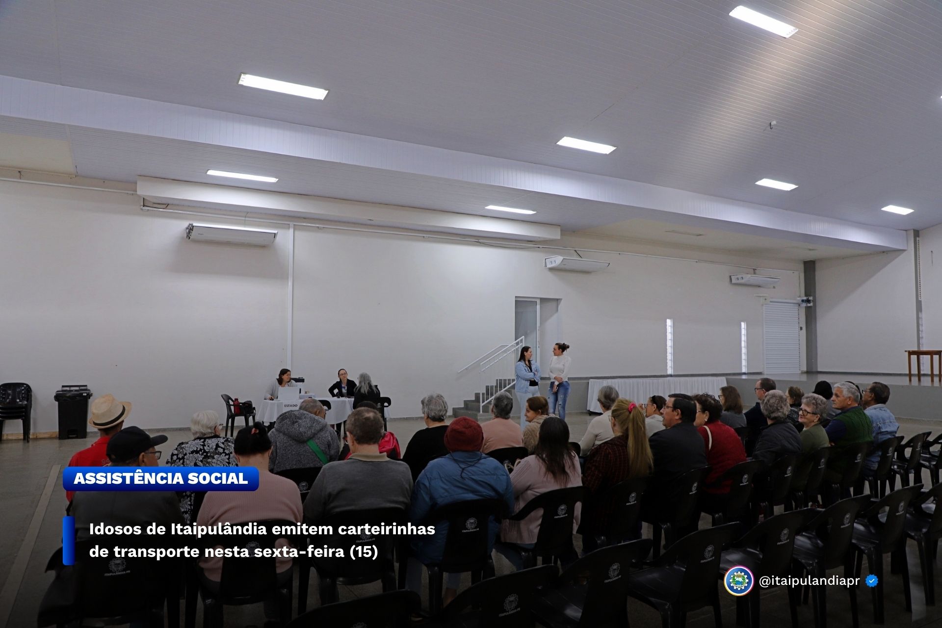 Nesta sexta-feira (15), o CRAS de Itaipulândia está realizando a emissão das carteirinhas de transporte para pessoas idosas, no Centro de Eventos, das 08h às 11h e das 13h30 às 16h30.