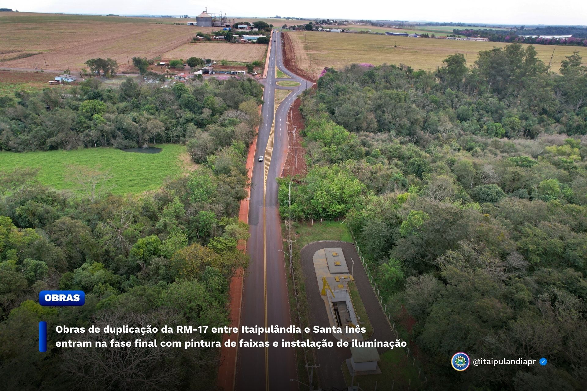 As obras de duplicação da Rodovia Municipal RM-17, que liga Itaipulândia à comunidade de Santa Inês, estão em fase final de execução. Nesta semana, as equipes responsáveis pelos trabalhos estão executando a pintura das faixas de sinalização horizontal e a instalação do sistema de iluminação ao longo do trecho duplicado.
