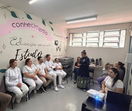 A atividade foi conduzida pela fonoaudióloga Michele Soares e pela psicóloga Suelen Cristina Becker, que compartilharam conhecimentos, vivências e estratégias sobre benefícios do aleitamento materno para mãe e bebê; Acolhimento às mães no início da amamentação e importância do trabalho integrado da equipe de enfermagem no cuidado diário.