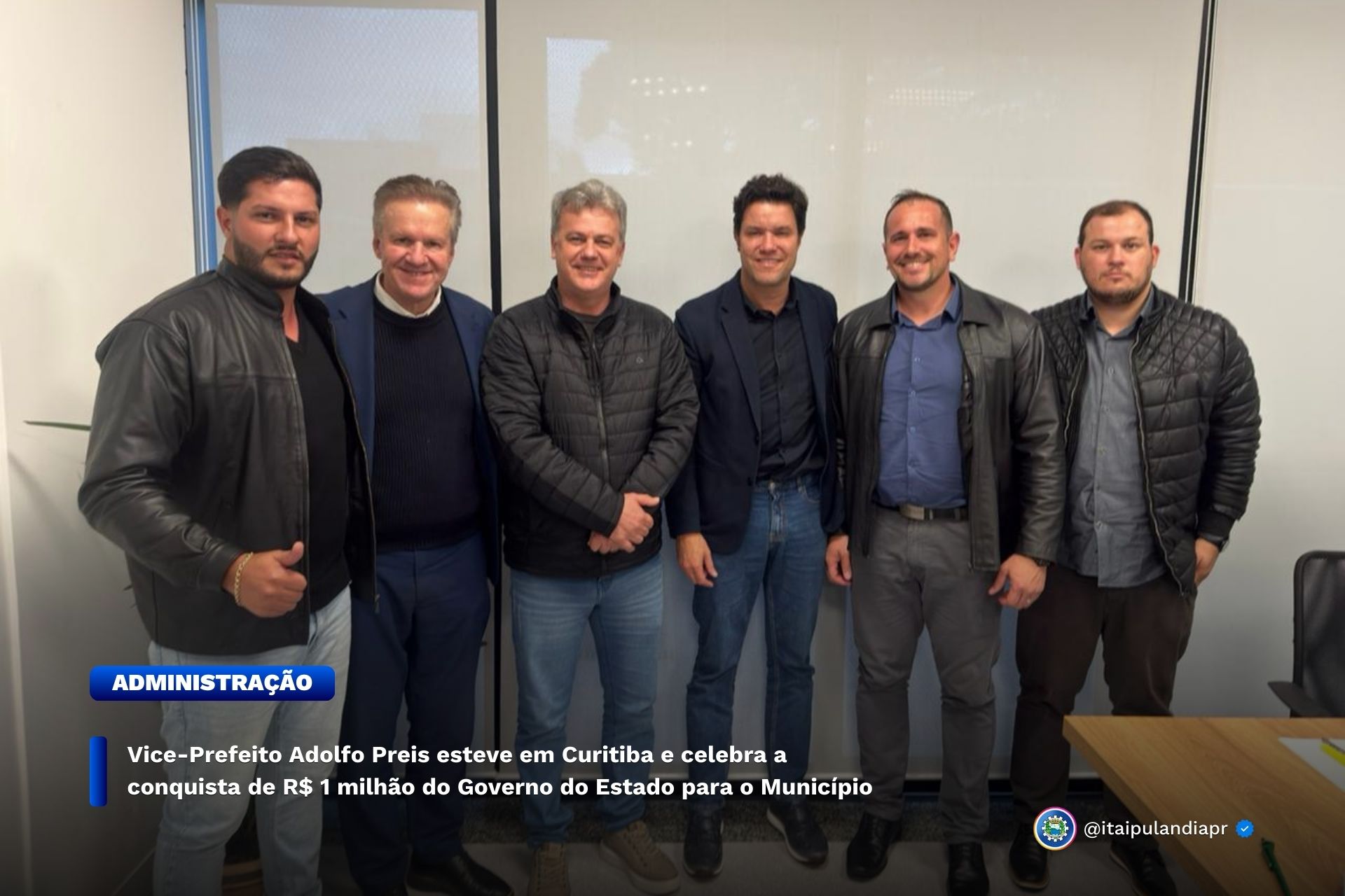 O Vice-Prefeito Adolfo Preis, esteve em visita oficial à capital do estado com a finalidade de alavancar recursos par ao município de Itaipulândia. Adolfo esteve acompanhado de lideranças locais, entre elas o Secretário de Turismo e Lazer Leonardo Barcellos da silva, o vereador Nilsinho Barcellos e o servidor John Lennon Weiss, e visitou o deputado Luis Corti e o Secretário das Cidades Guto Silva e teve a confirmação de R$ 1 milhão para o município.