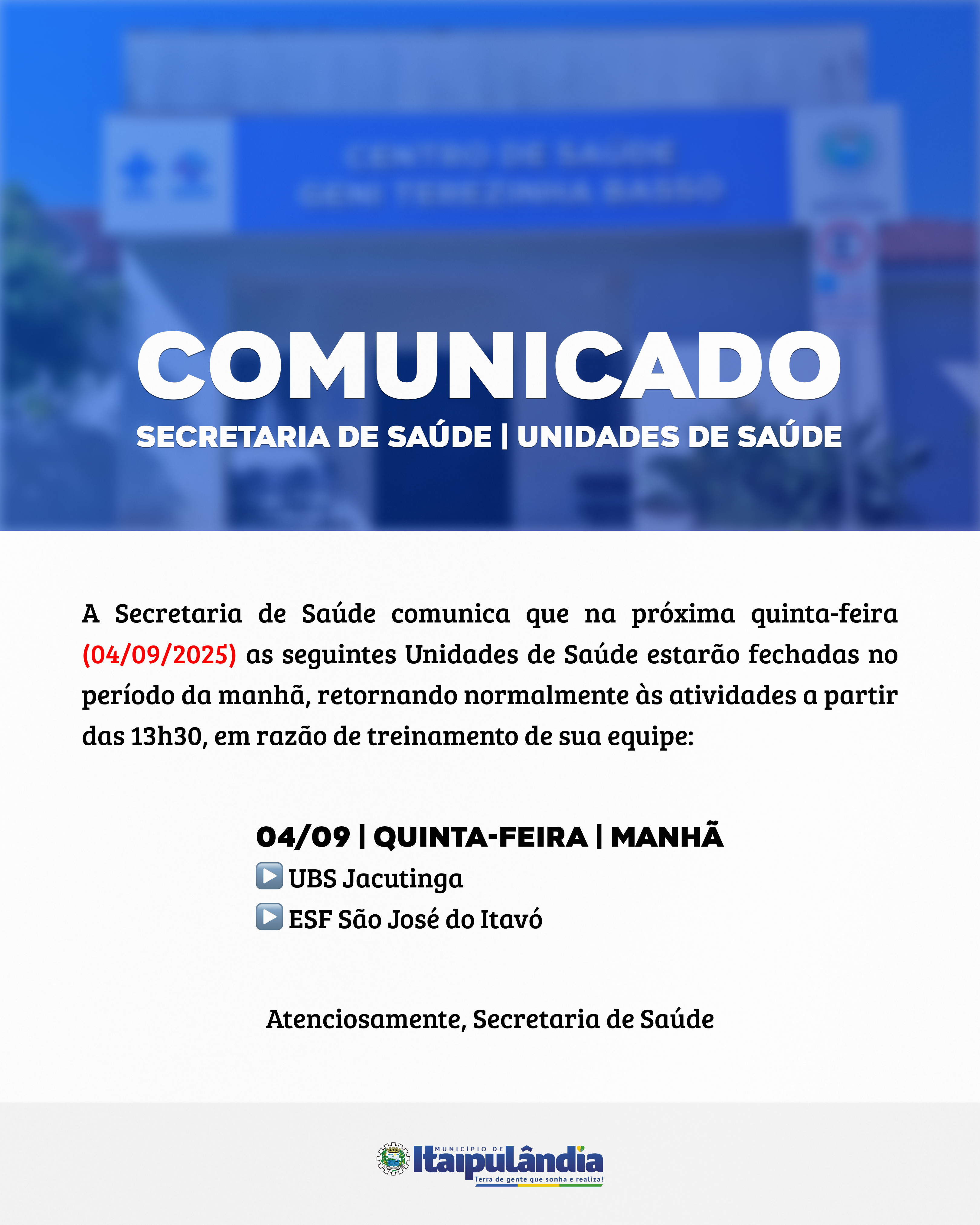 Confira o comunicado da Secretaria de Saúde sobre o horário de atendimento das Unidades de Saúde válido para quinta-feira (04).