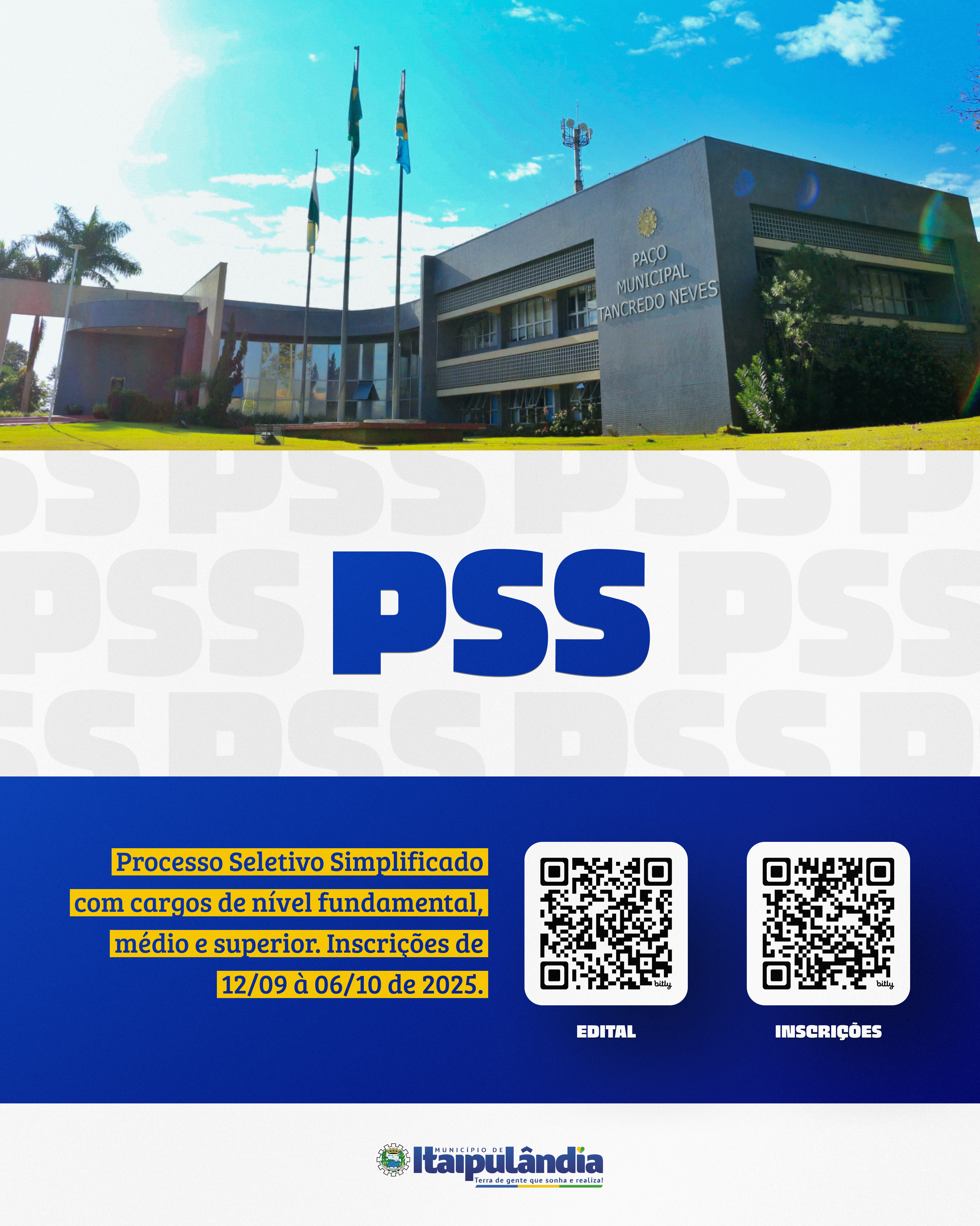 O Município de Itaipulândia anuncia a abertura de edital para o Processo Seletivo Simplificado (PSS), os cargos serão de nível fundamental, médio e superior.