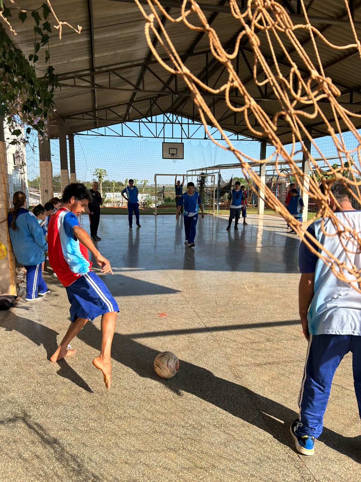 A aula aconteceu na quadra da escola, com foco na modalidade de futsal. Os estudantes participaram de atividades práticas e tiveram contato direto com professores do departamento, proporcionando uma vivência diferenciada do esporte.
