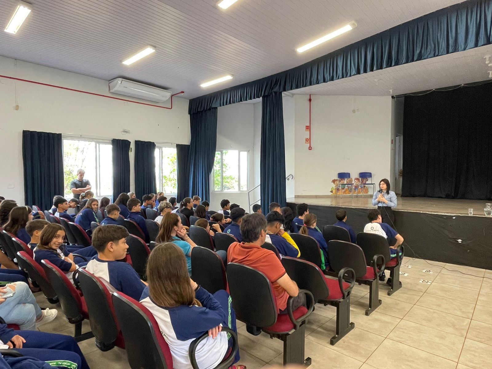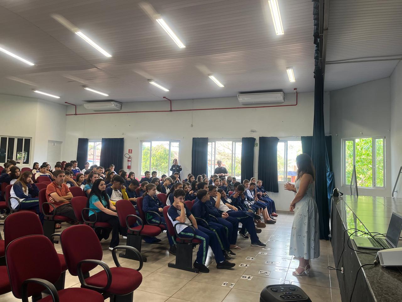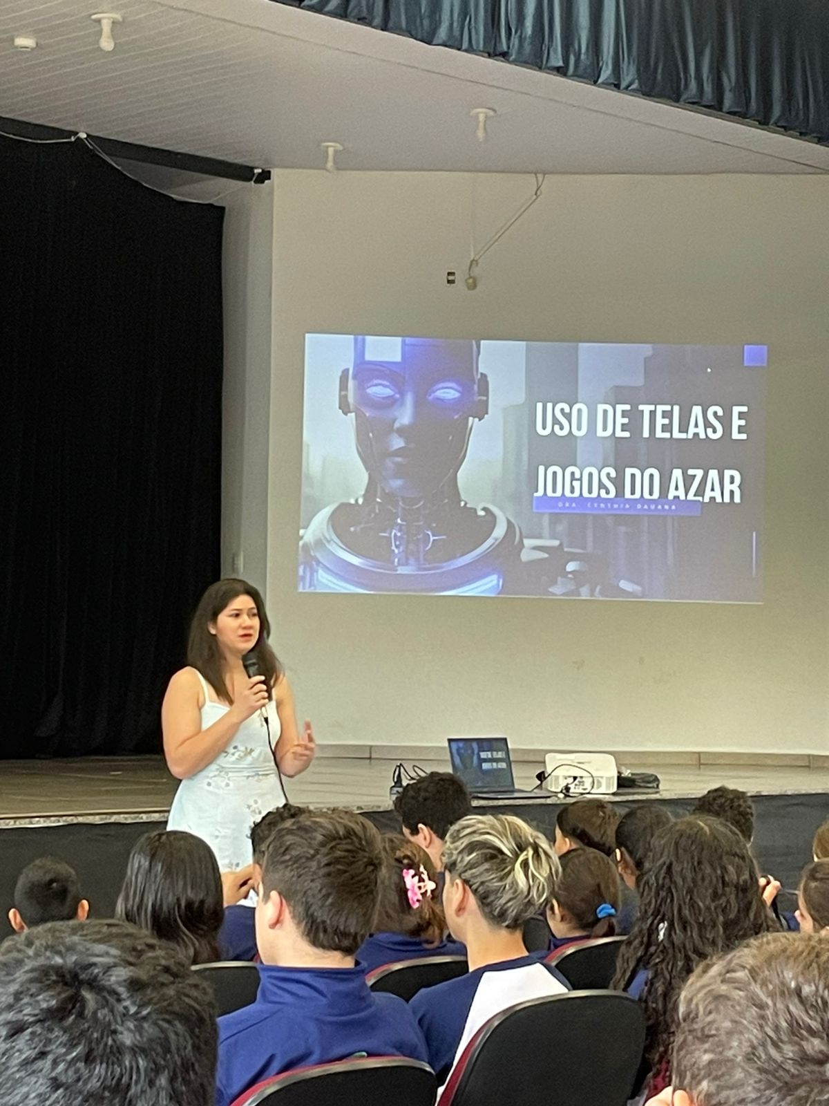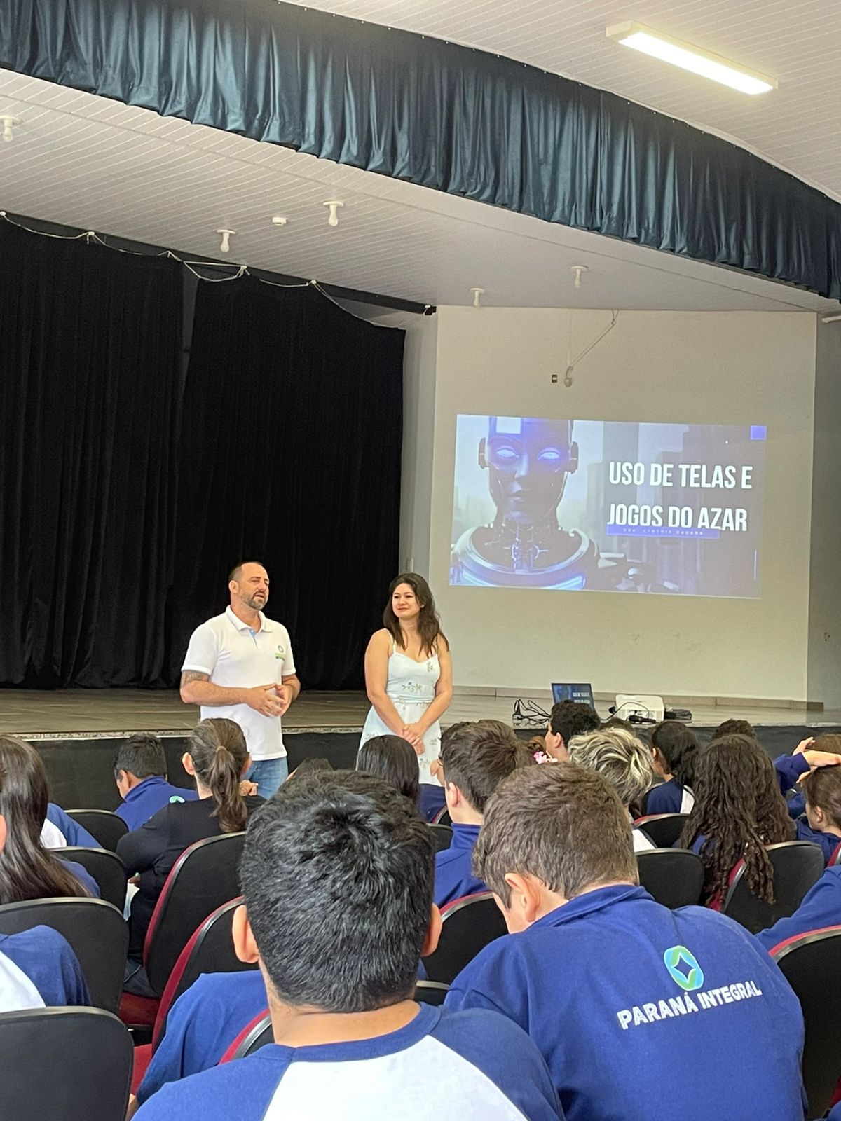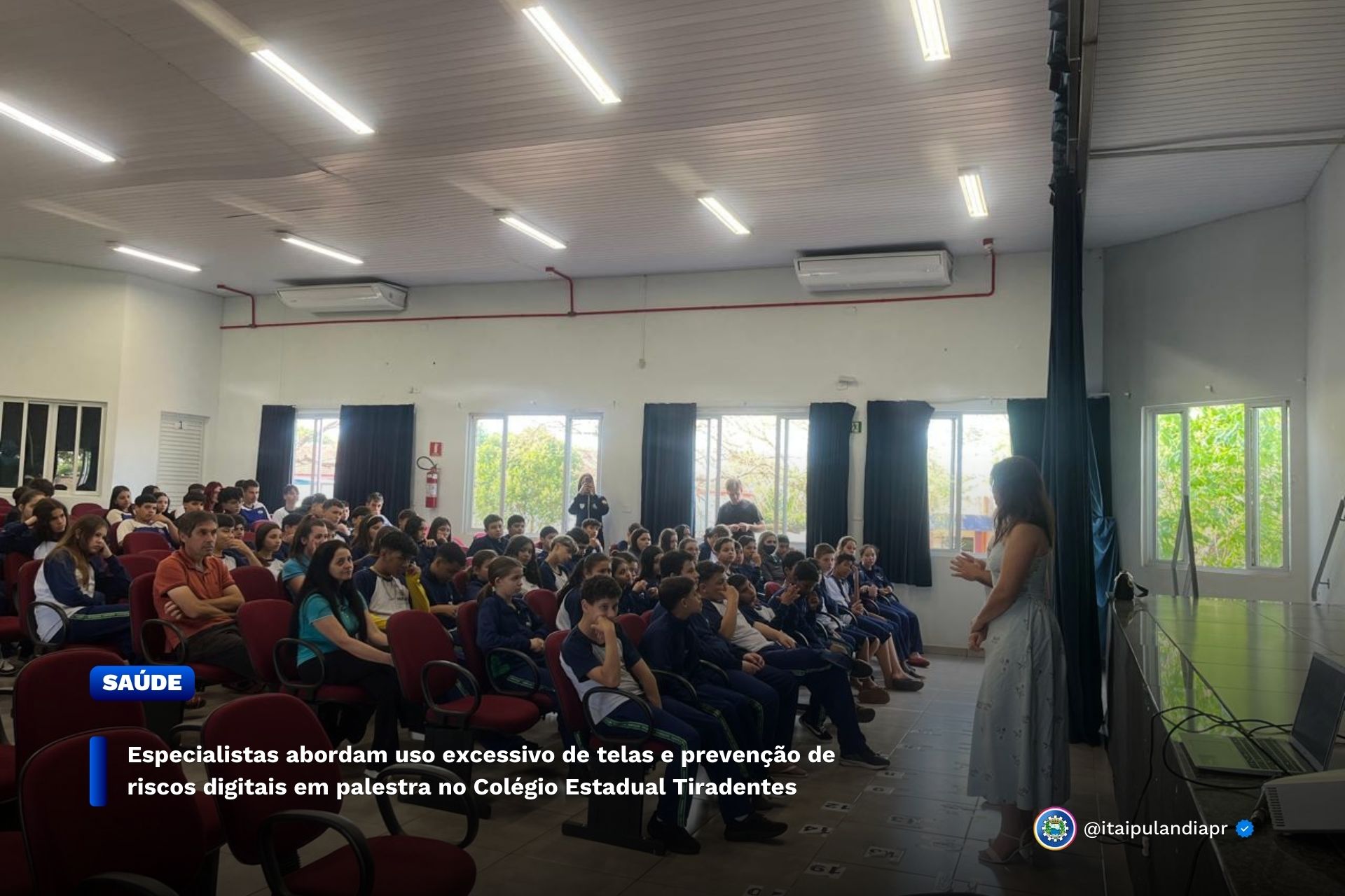 Na última segunda-feira (16), os alunos do Colégio Estadual Tiradentes participaram de uma palestra sobre os impactos do uso excessivo de telas e jogos de azar. A ação foi conduzida pela Dra. Cynthia Dauana e pela enfermeira Luciane Galdino Trentin, com o objetivo de alertar jovens sobre os riscos associados ao ambiente digital e orientar sobre práticas seguras.