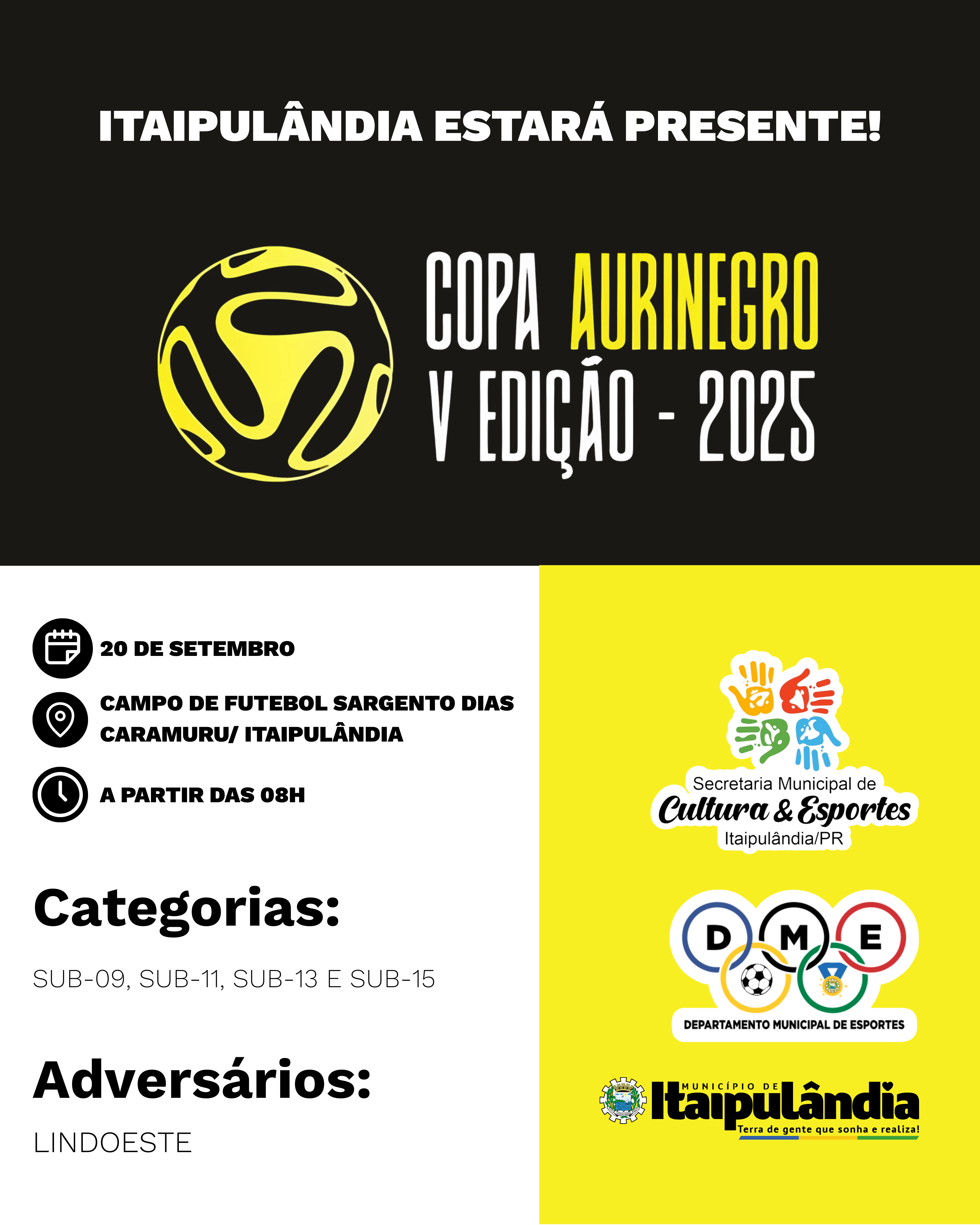Neste sábado, nossos atletas das categorias Sub-09,Sub-11, Sub-13 e Sub-15 entram em campo representando o município na Copa Aurinegro – Edição V 2025, no Campo de Futebol Sargento Dias - Caramuru.