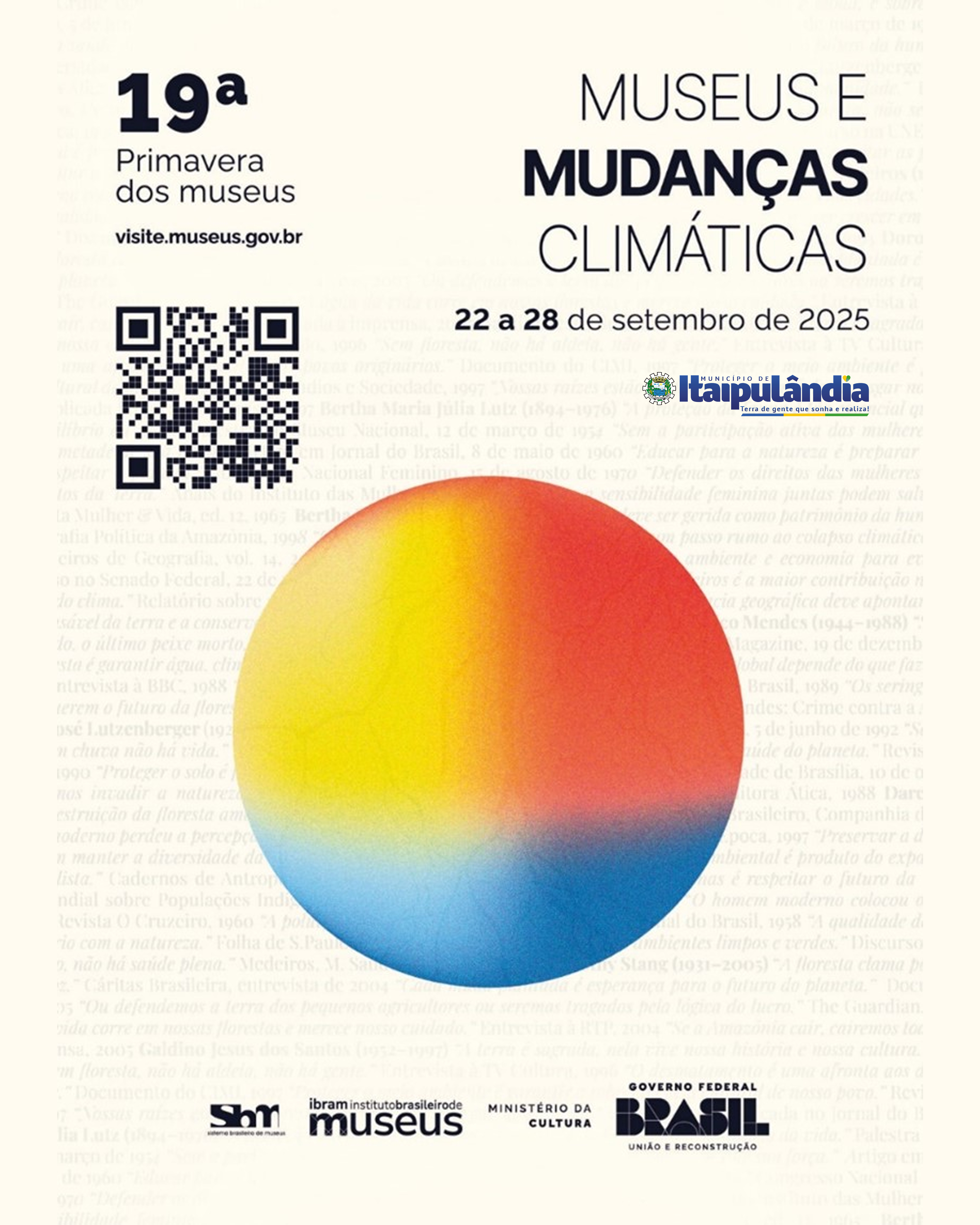O Departamento de Cultura através da Casa da Memória de Itaipulândia estará participando da Primavera dos Museus 2025, promovendo a Ação Educativa: “Um olhar para as mudanças na paisagem local e regional”, realizando explanação acerca da temática definida, articulando-a ao contexto histórico e visita guiada.