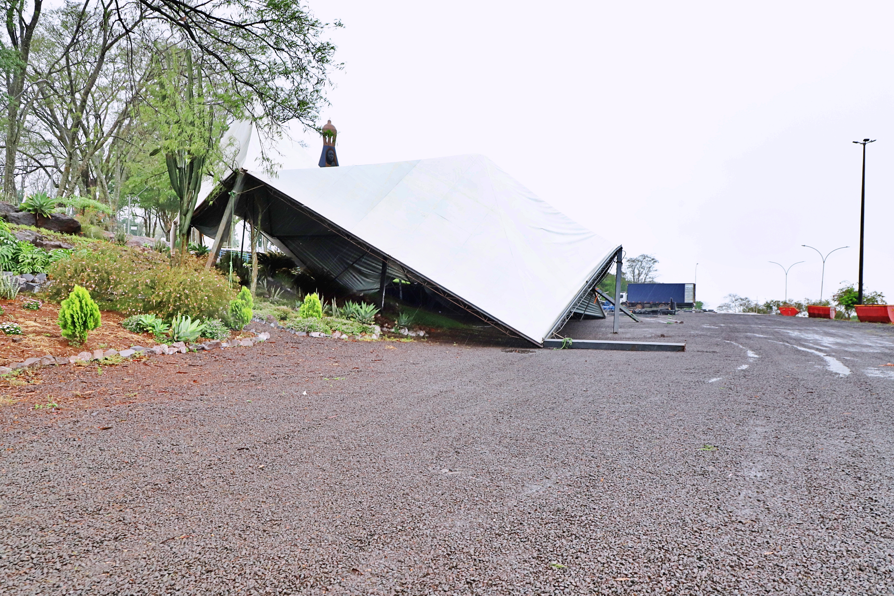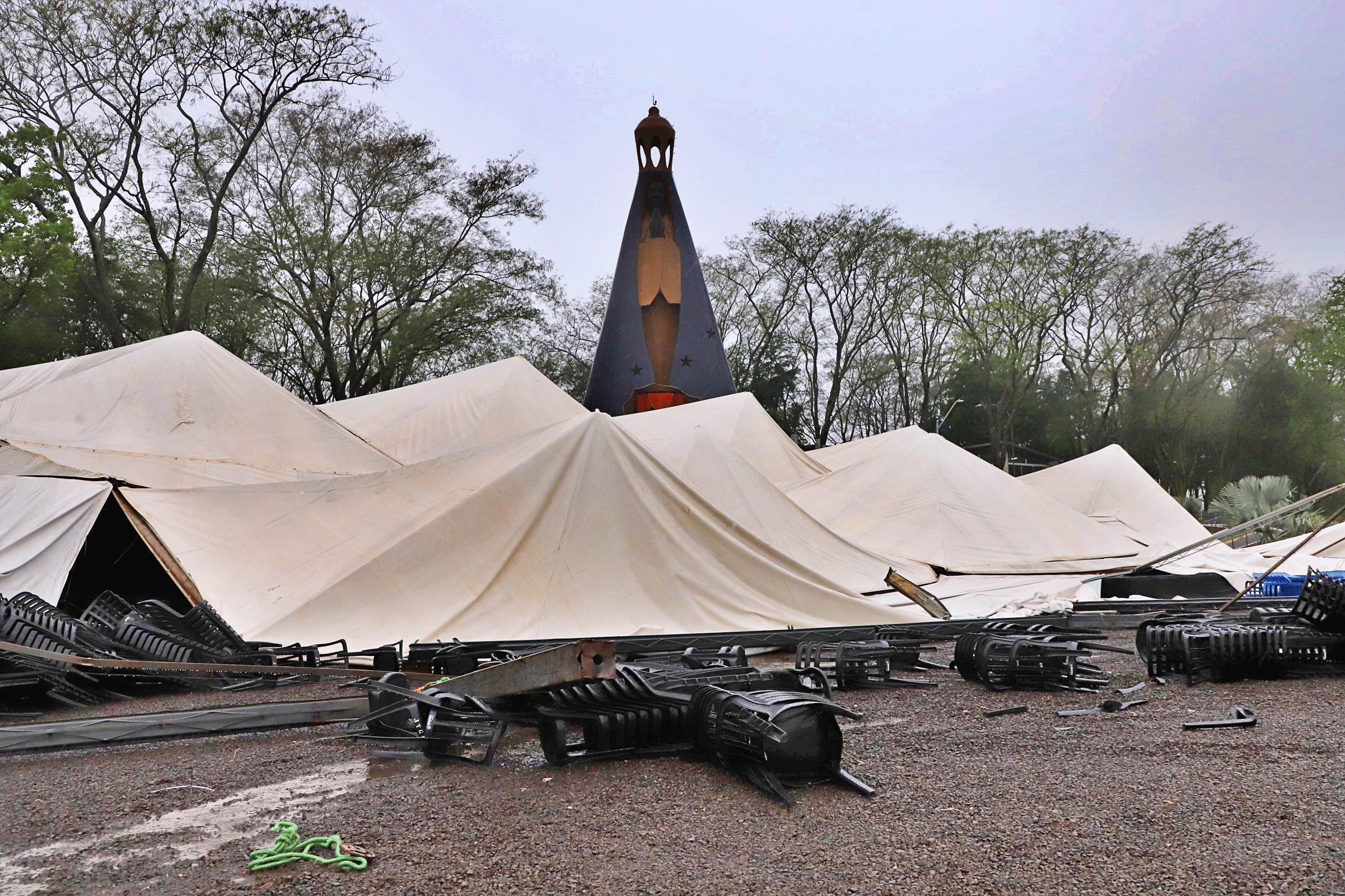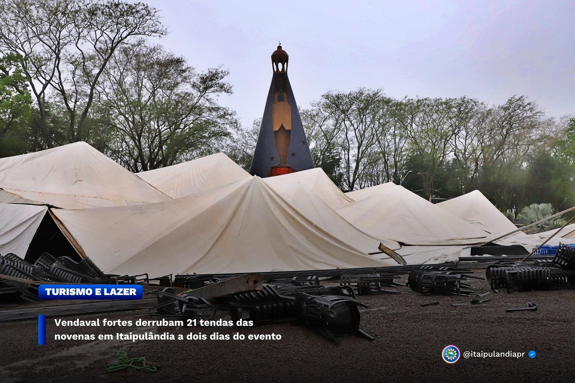 Na manhã desta terça-feira (30), Itaipulândia foi atingida por fortes rajadas de vento que derrubaram 21 tendas de 10x10 metros montados para as novenas em homenagem à Nossa Senhora Aparecida. A estrutura havia sido instalada para acolher os fiéis durante as celebrações, que começam em dois dias, e ficou comprometida com o incidente.