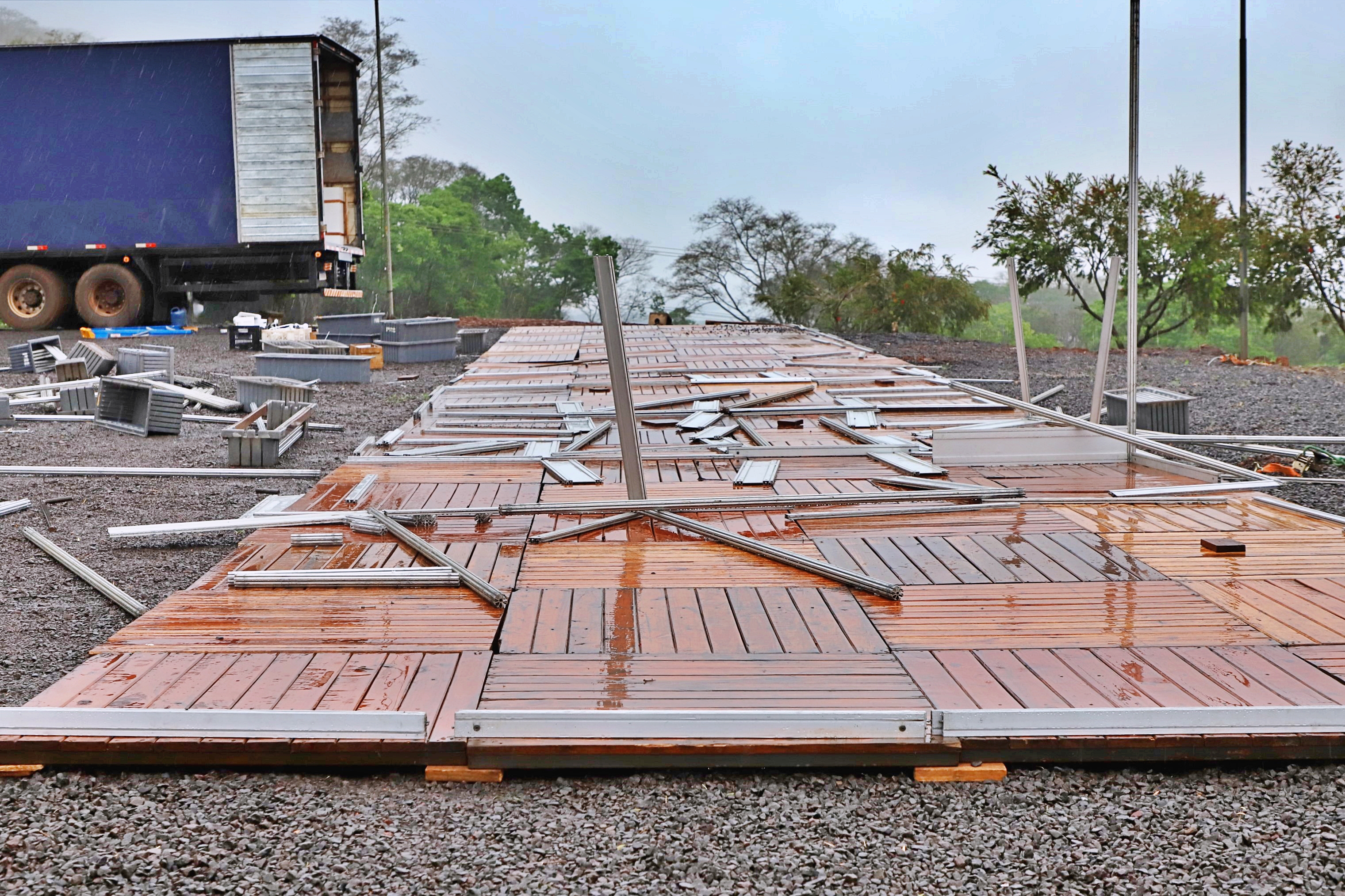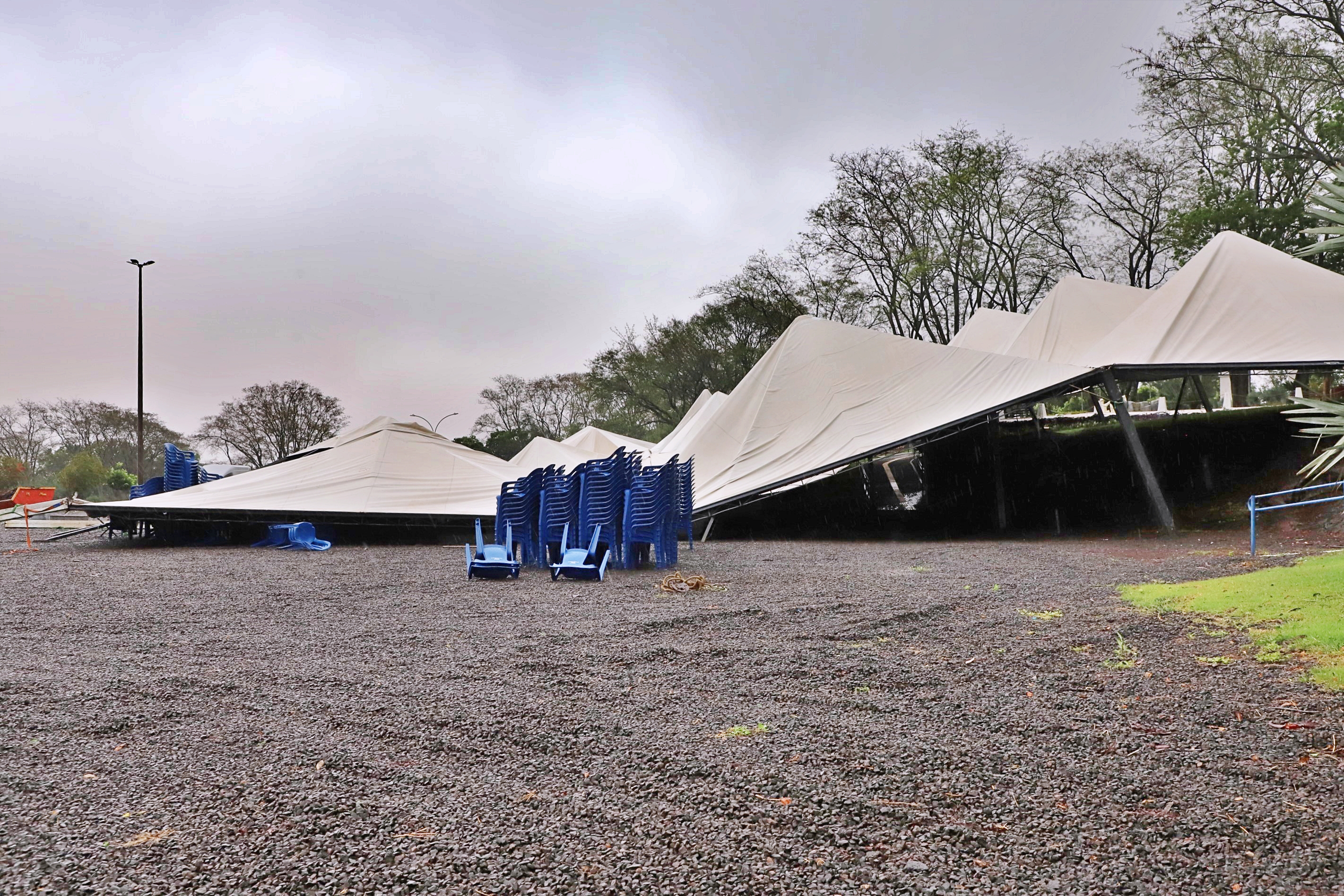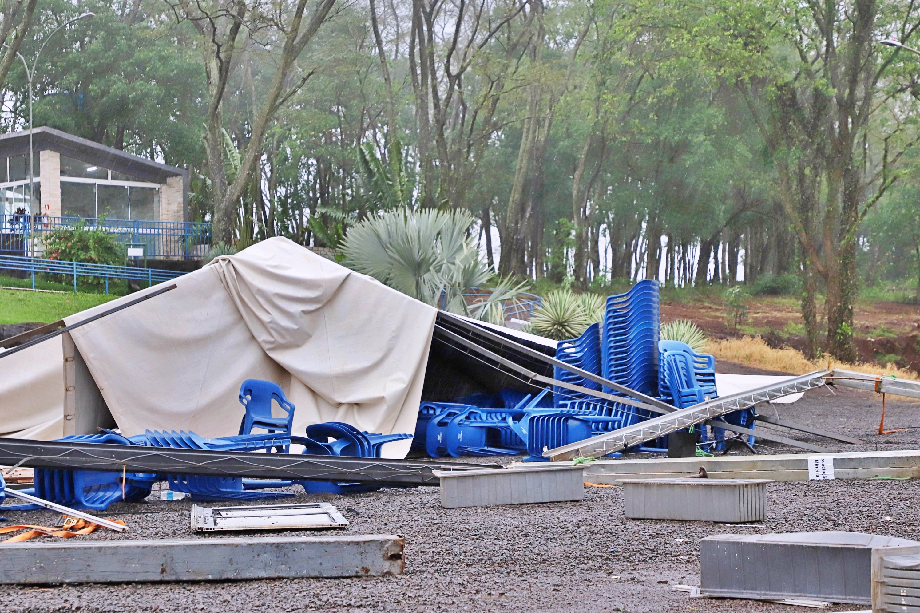 Na manhã desta terça-feira (30), Itaipulândia foi atingida por fortes rajadas de vento que derrubaram 21 tendas de 10x10 metros montados para as novenas em homenagem à Nossa Senhora Aparecida. A estrutura havia sido instalada para acolher os fiéis durante as celebrações, que começam em dois dias, e ficou comprometida com o incidente.
