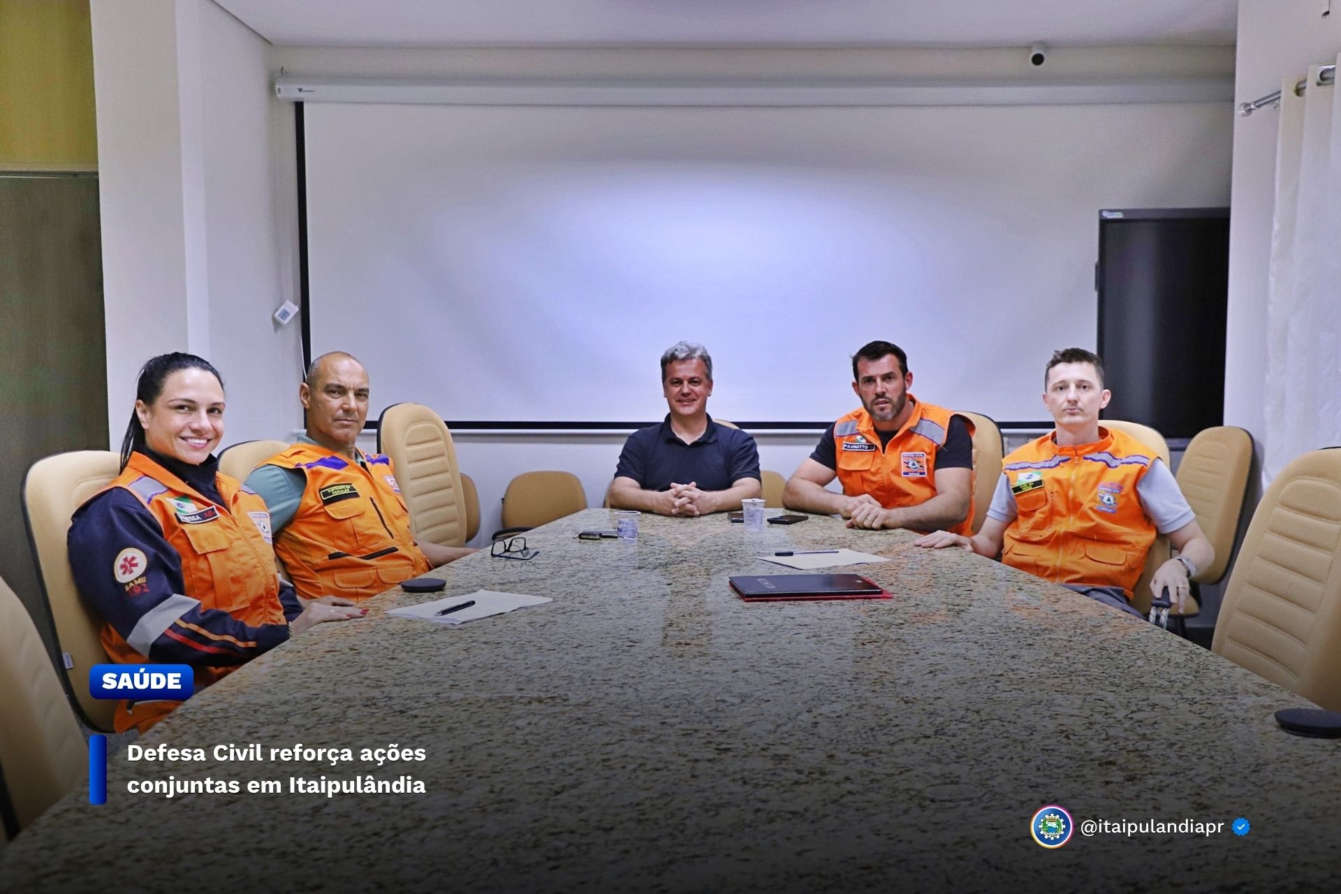 Na tarde da última segunda-feira (29), Itaipulândia recebeu representantes do 4º Núcleo de Atuação Regional da Defesa Civil (CEDEC/PR) para alinhar estratégias com a Defesa Civil Municipal. O encontro ocorreu na Sala de Reuniões da Prefeitura e contou com a presença do vice-prefeito, integrantes da Defesa Civil local, o Cabo Fergs e o Subtenente Reinaldo Rodrigues.