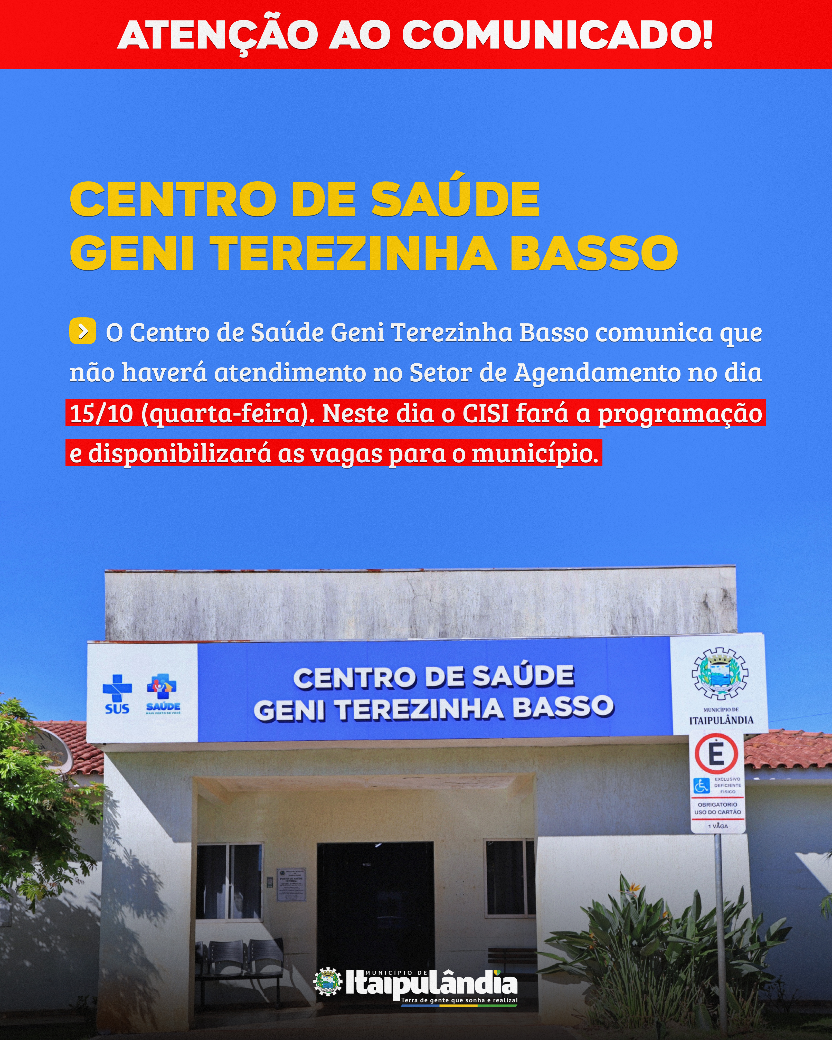 Confira o comunicado do Setor de Agendamento do Centro de Saúde Geni Terezinha Basso válido para o dia 15 de outubro de 2025.
