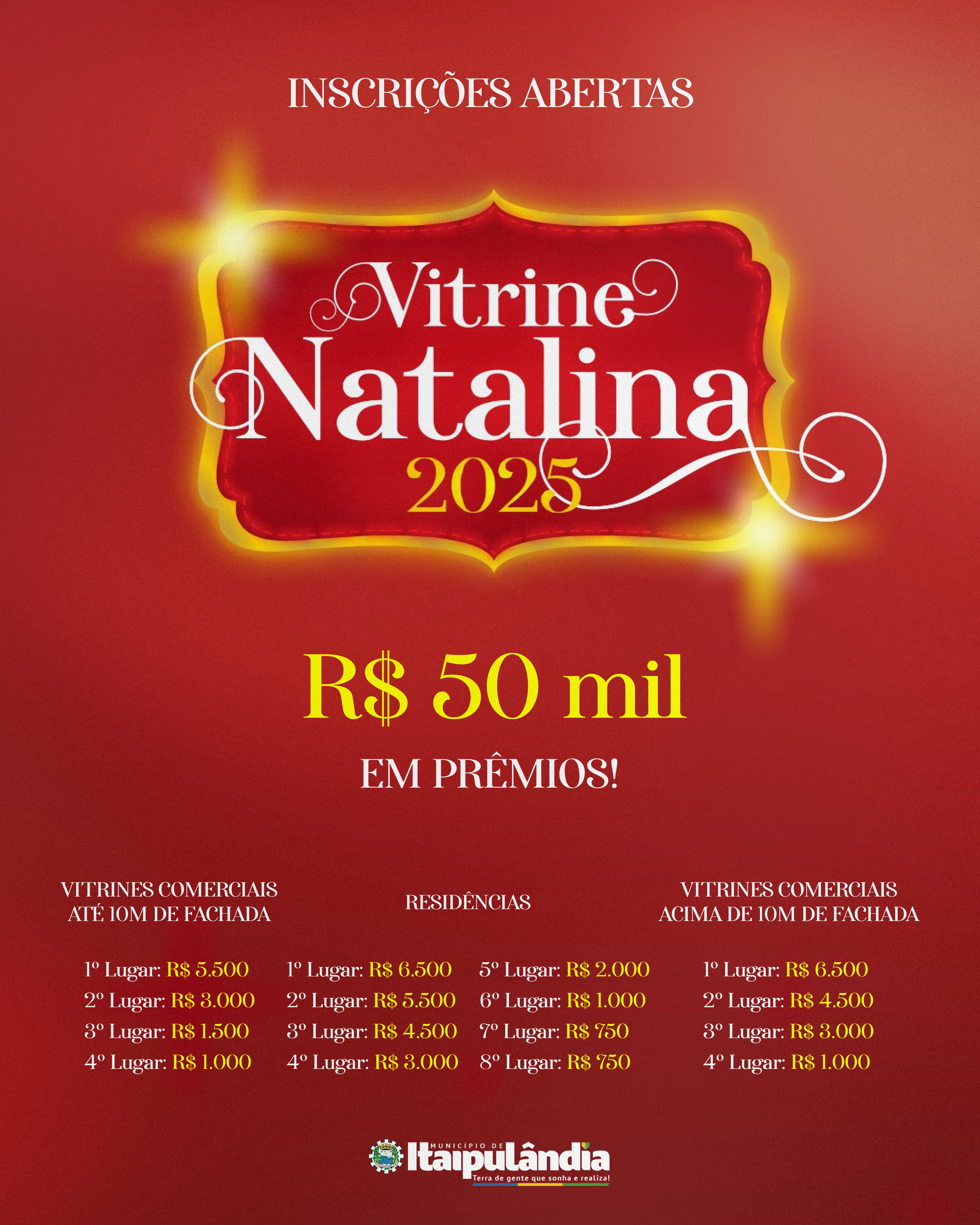 A magia do Natal vai tomar conta de Itaipulândia: vem aí a Vitrine Natalina 2025! Concurso promovido pela Secretaria de Turismo e Lazer, em parceria com a ACIAI (Associação Comercial e Empresarial de Itaipulândia).