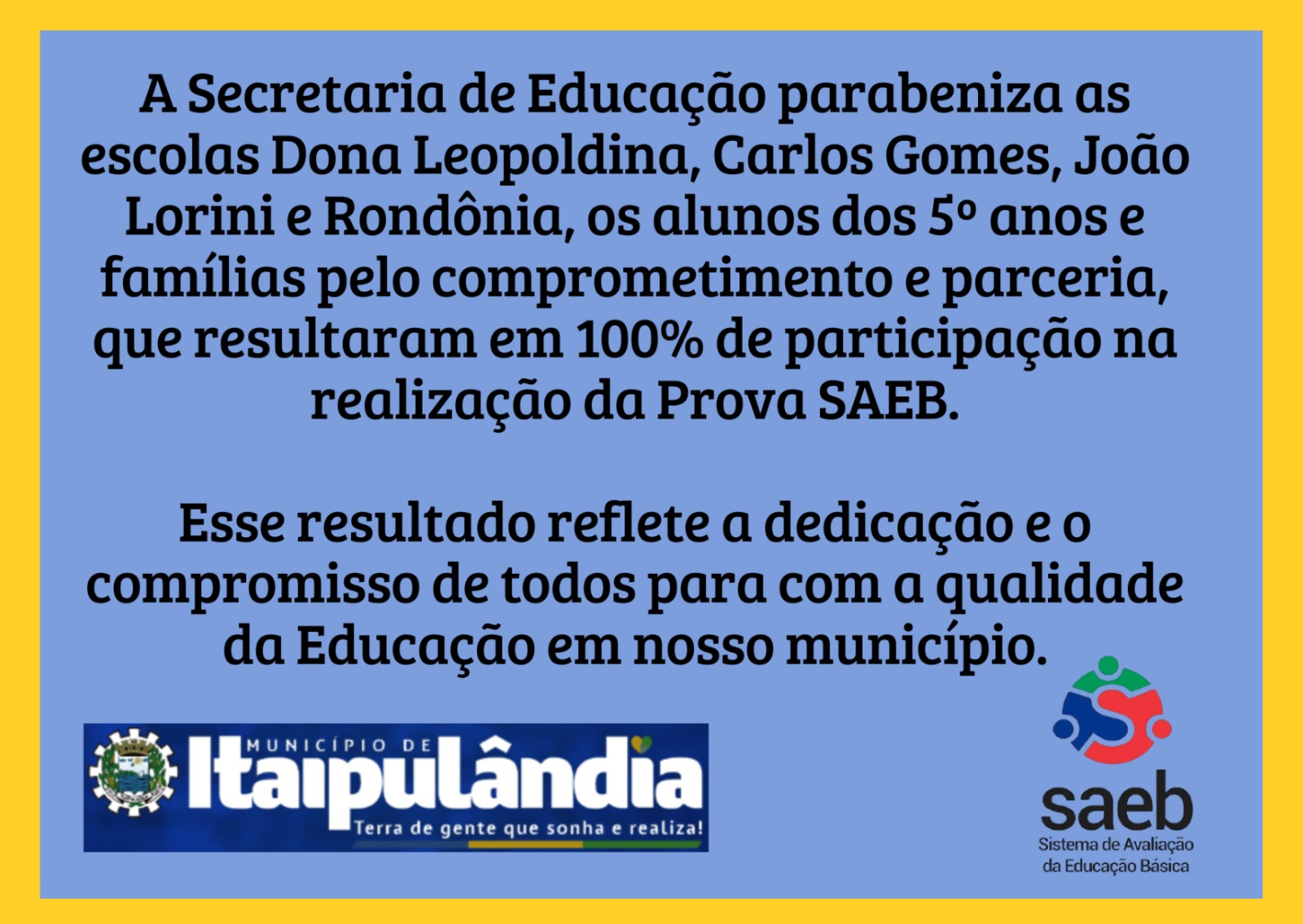 Parabéns aos alunos, escolas e famílias pelo comprometimento e pelos 100% de participação na Prova SAEB!