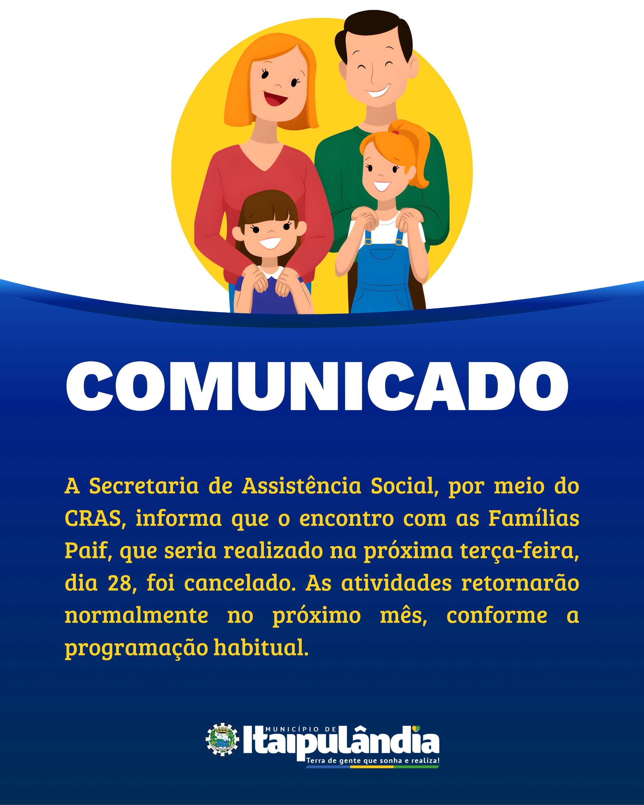 O encontro do CRAS que aconteceria na próxima terça-feira (28) foi cancelado.