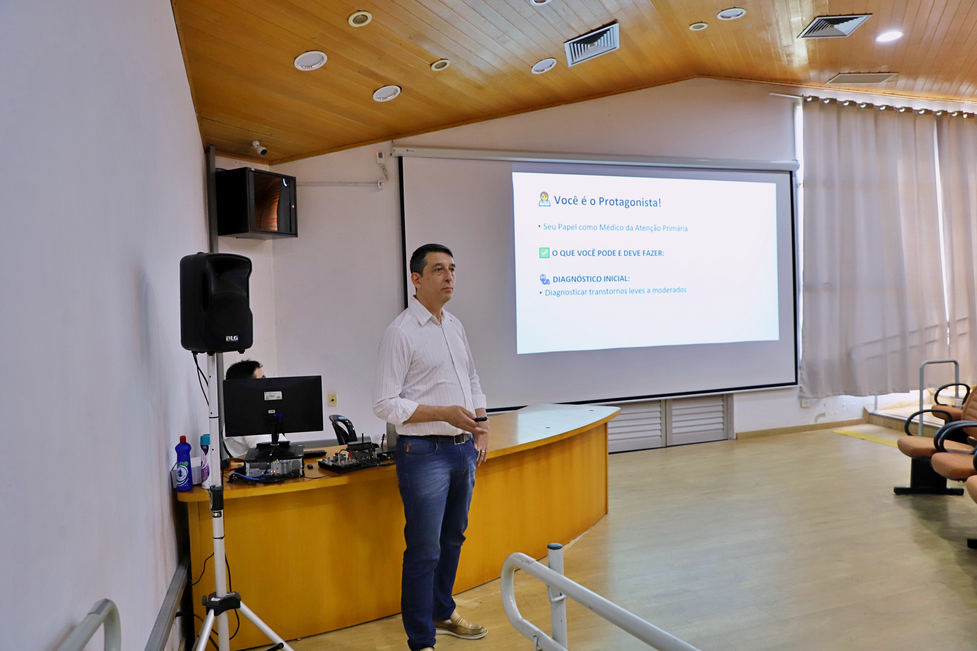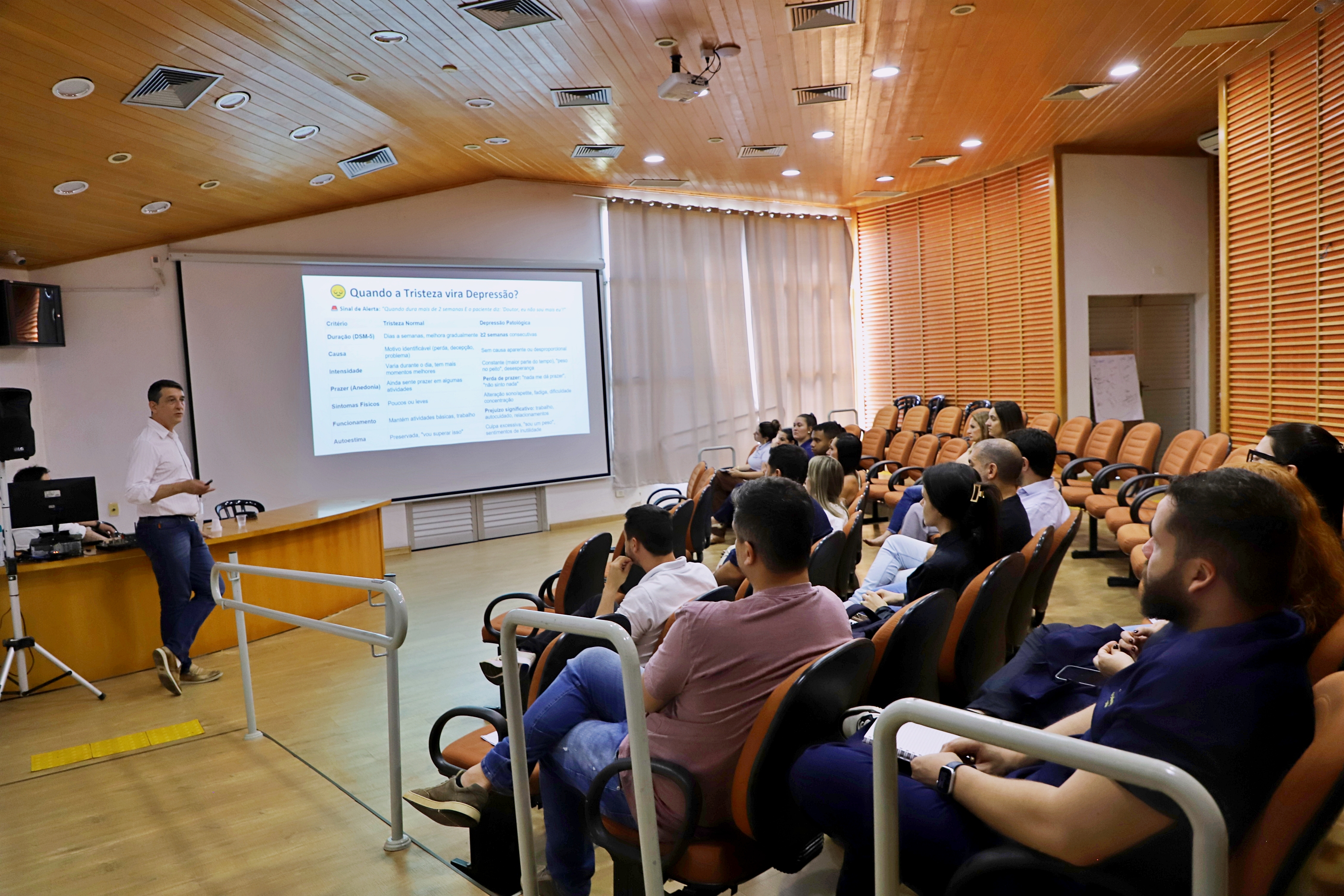 A ação foi conduzida pelos psiquiatras Dr. Iuri Silveira e Dr. Gustavo Ladeira, que apresentaram orientações práticas e atualizaram os médicos sobre protocolos e estratégias essenciais para o atendimento em saúde mental.