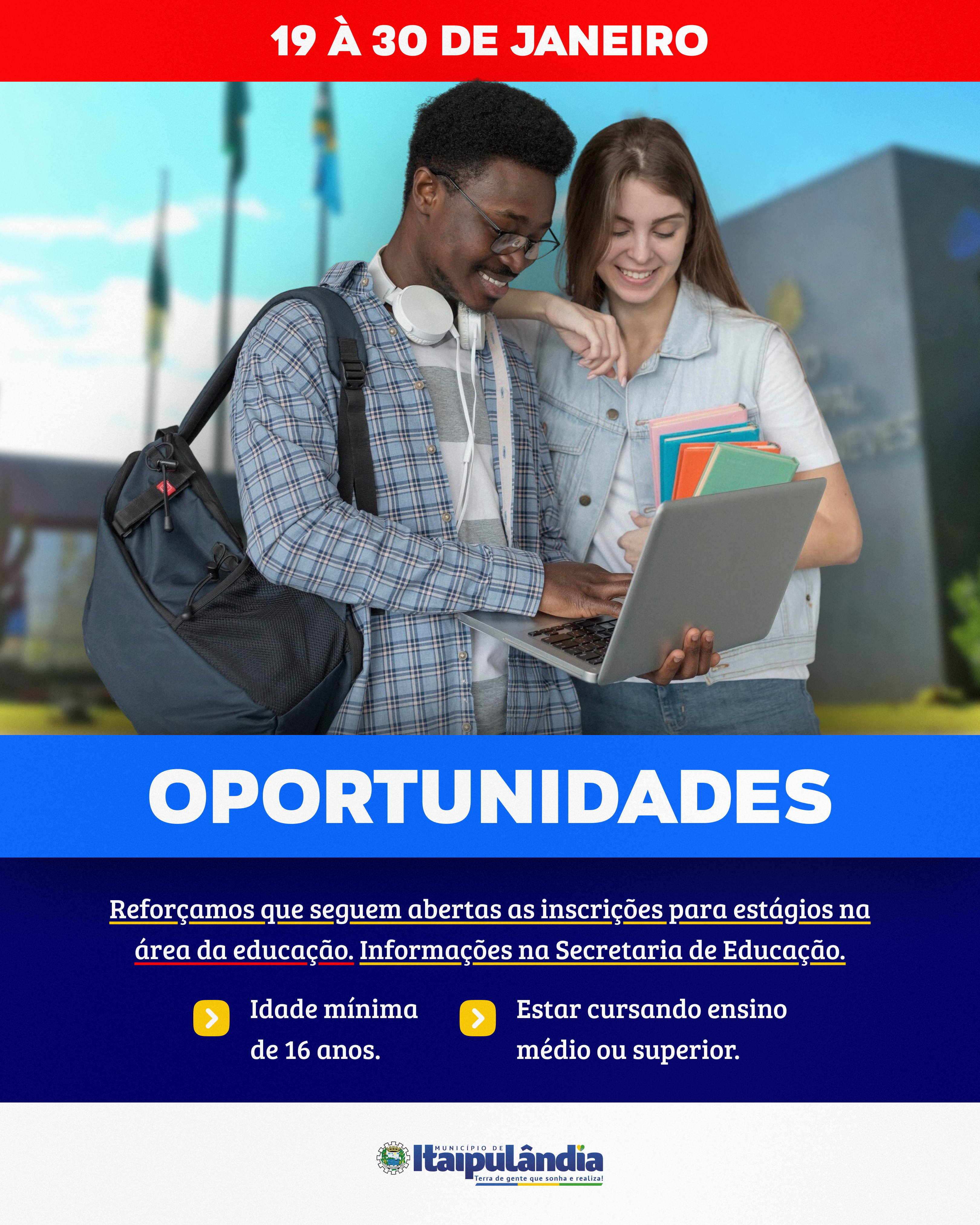 A Administração Municipal comunica que as inscrições para estágios no ano de 2026, na área da educação, seguem abertas.