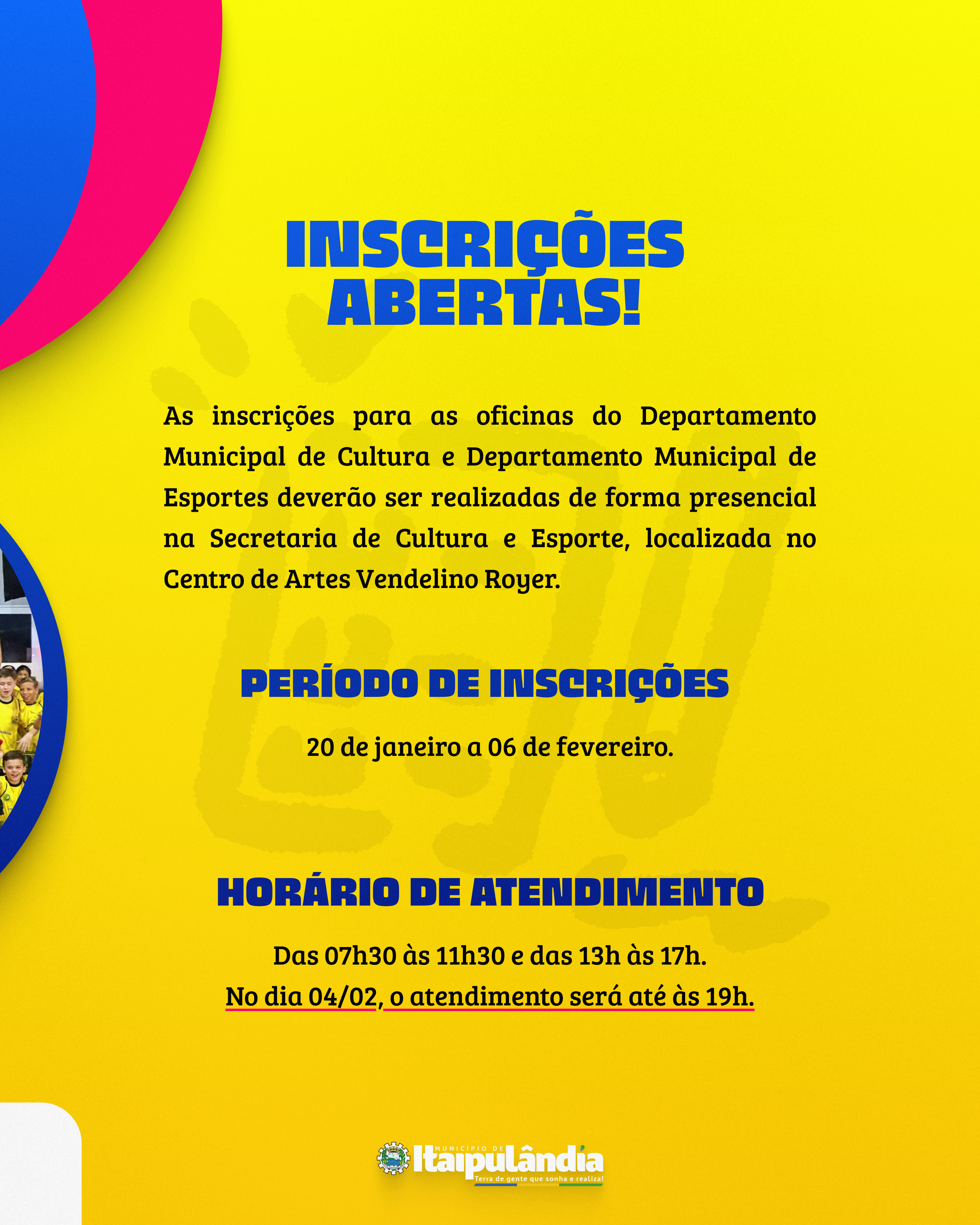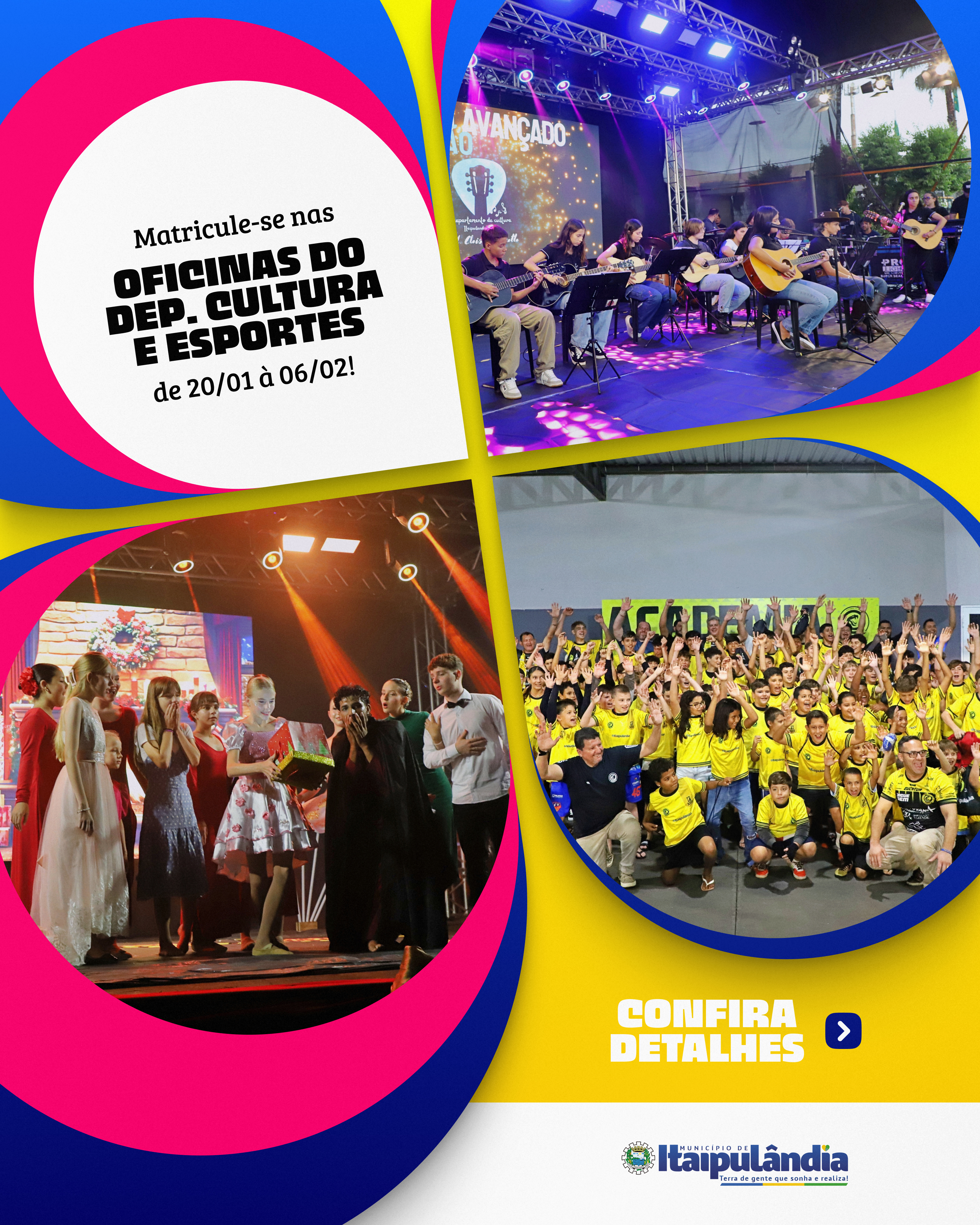 De 20/01 à 06/02, estarão abertas as inscrições para as oficinas culturais e esportivas de Itaipulândia. Uma oportunidade para participar, aprender, se movimentar e fazer parte das ações que fortalecem o município.