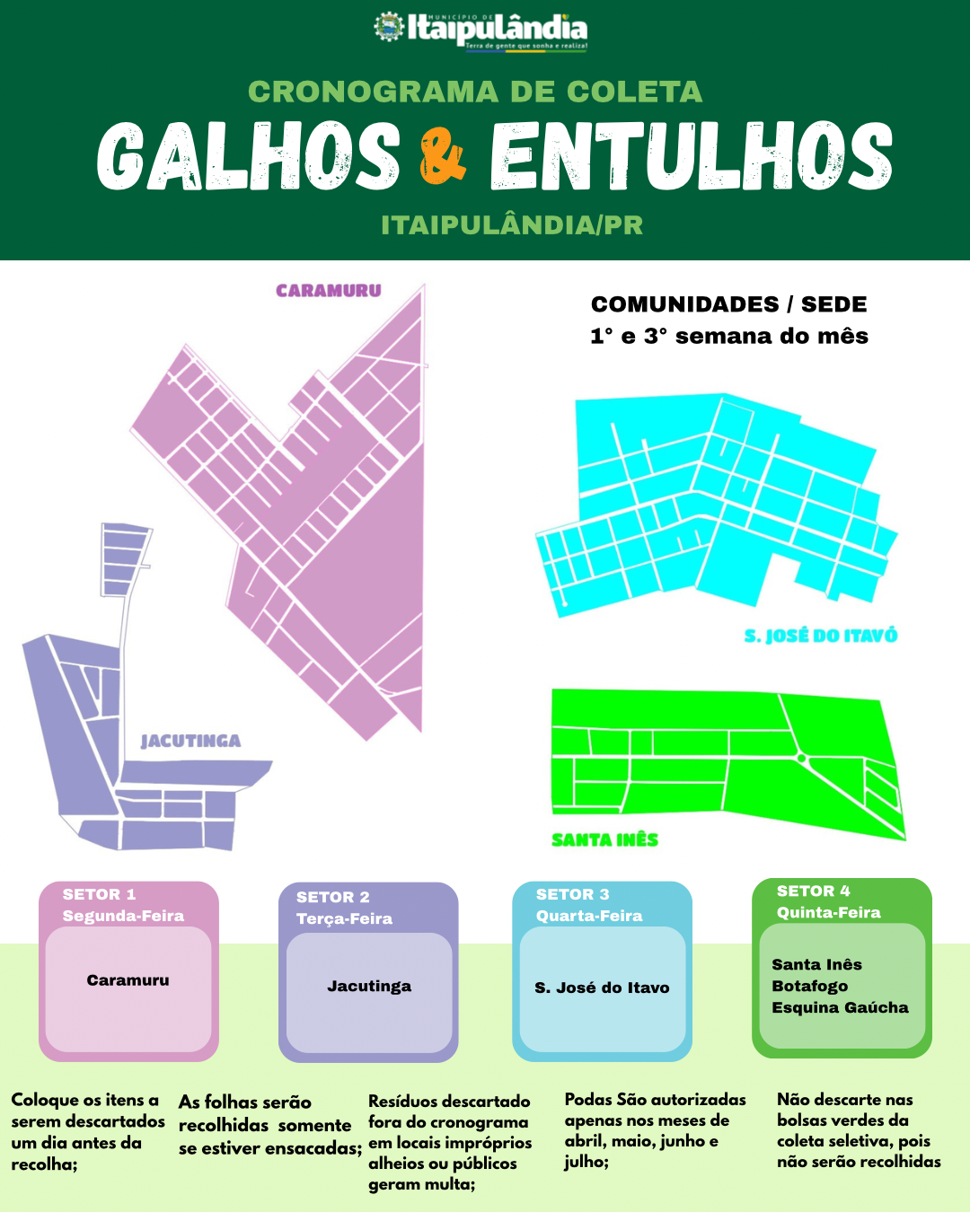 A Administração Municipal de Itaipulândia, por meio da Secretaria de Meio Ambiente, estabeleceu o cronograma mensal de coleta programada de galhos e entulhos no município. A ação abrange todo perímetro urbano , com atendimento organizado por semanas, conforme planejamento previamente divulgado à população.
